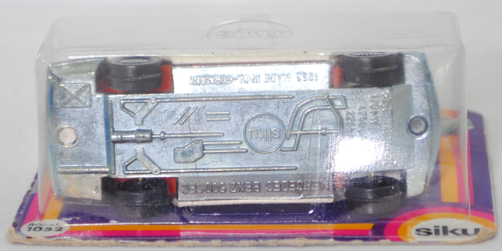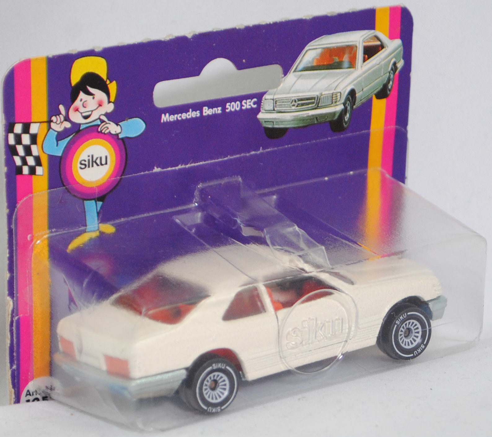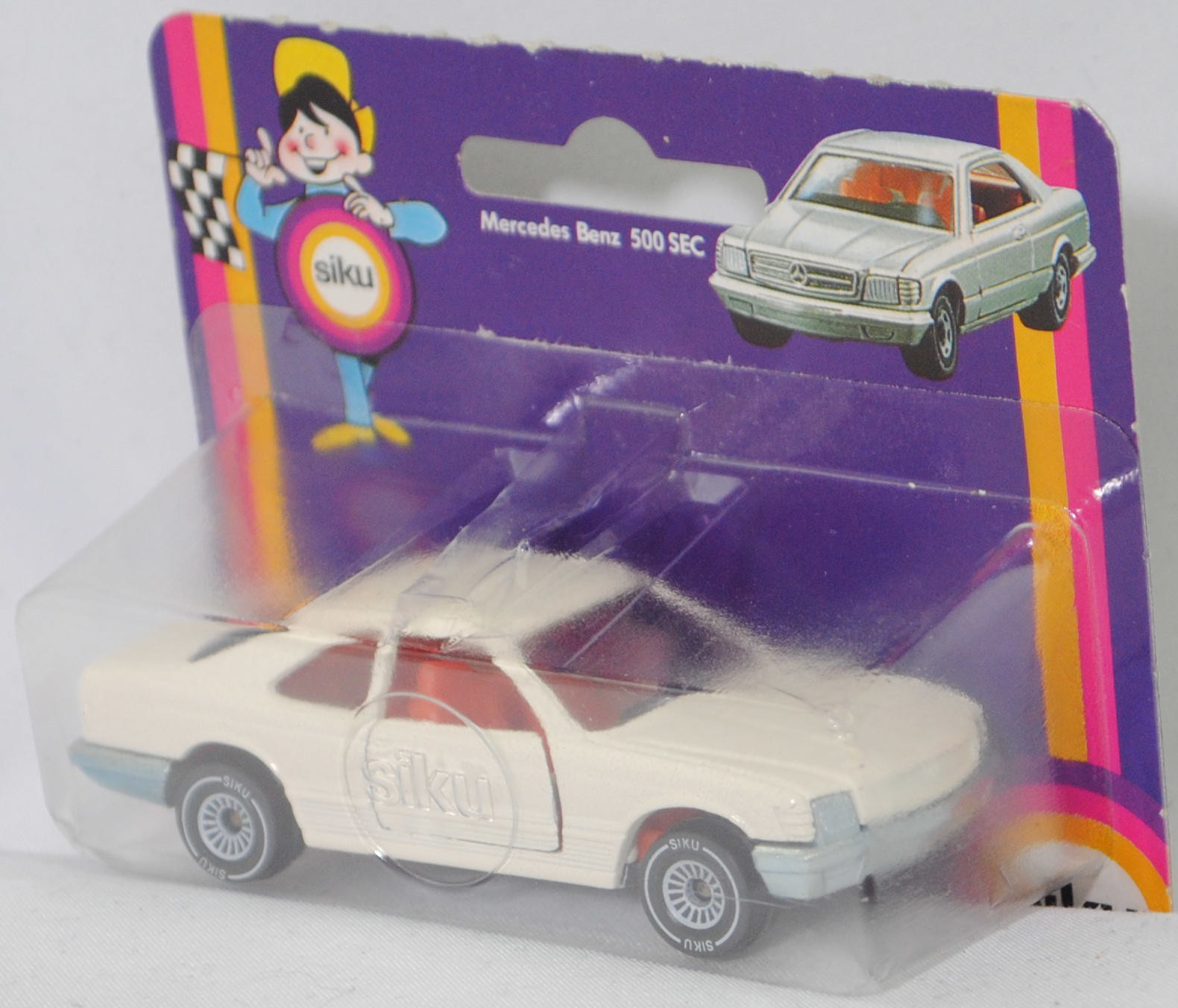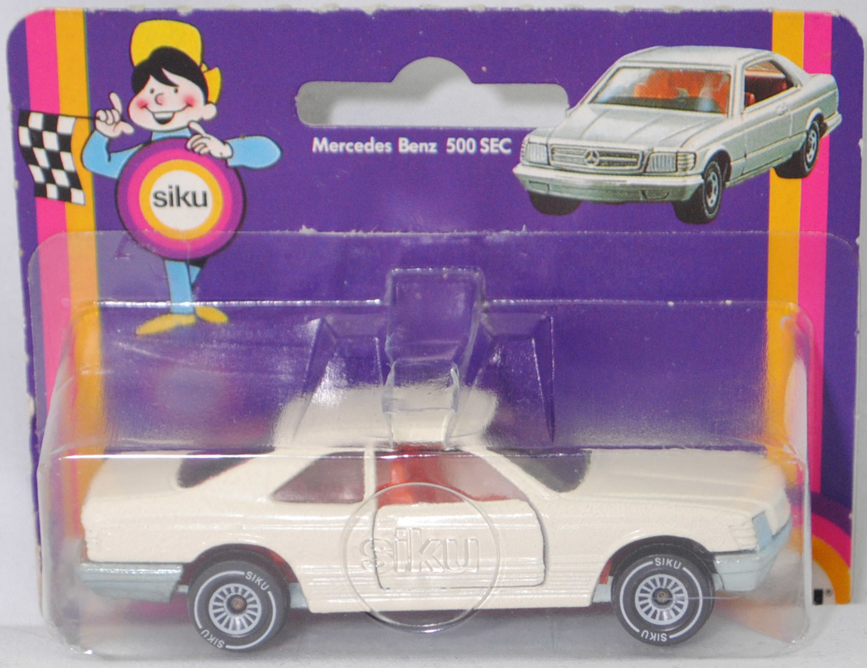 00001 Mercedes-Benz 500 SEC (2. Generation S-Klasse, Baureihe S-Klasse Coupé, SEC = S-Klasse Einspritzmotor Coupé, interne Baureihenbezeichnung C 126, Konstruktionsbezeichnung C 126 E 50, Baumuster 126.044, zweitüriges Coupé mit 4 Sitzplätzen, Vor-MoPf (vor Modellpflege, Vorfacelift), Stoßfänger vorne mit 4 waagerechten Lamellen zwischen den Nebelscheinwerfern, Stoßfänger vorne und hinten flach, Nummernschild vorne weit oben am Stoßfänger positioniert, Zierleiste auf dem vorderen Stoßfänger durch das Nummernschild unterbrochen, seitliche Schutzleisten mit Rillen, Ausststtungslinie 500 SEC: asymmetrisches Halogen-Abblendlicht, Halogen-Fernlicht + Halogen-Nebellampen + flexible Kunststoffstoßfänger + Leichtmetall-V8-Motor mit 4973 cm³ sowie 231 PS + Armaturenanlage gepolstert, stoßnachgiebig + Instrumentenanlage und Mittelkonsole mit Edelholzausstattung + Scheibenwaschanlage mit elektrisch beheizten Düsen + 3 gepolsterte Sonnenblenden, auf Beifahrerseite mit Spiegel + 4-Gang-Wandler-Automatic mit Mittelwählhebel + Sitze körpergerecht geformt, stoßfest verankert, ausgeformt für seitlichen Sitzhalt + achtfach elektrische Verstellmöglichkeit der Vordersitze durch Symbolschalter in den Türen + Sitzlehnen-Arretierung durch Unterdruck + Vordersitze mit verstellbaren Kopfstützen, Gurtbringer und Dreipunkt-Automatik-Sicherheitsgurten + Armlehnen mit Haltegriff an den Türen, gepolstert + Ablageschale zwischen den Vordersitzen + Taschen an den Vordertüren + Haltegriffe am Dachrahmen + Fondsitzbank mit Einzelsitzcharakter und klappbarer Mittelarmlehne + auf der Fondsitzbank 2 Dreipunkt-Sicherheitsgurte mit Aufrollautomatik + Armlehnen mit Haltegriffen an den Fondseitenteilen, gepolstert + voll versenkbare Seitenscheiben + elektrische Fensterheber + Innenraumbeleuchtung vorne und hinten + Beleuchtung für Handschuhfach und Kofferraum + Kunststoffseitenteile - zur Vermeidung von Karosserieschäden + Vollsichtverglasung aus Sicherheitsglas + Motorhaube und Kofferraumdeckel aus Leichtmetall, 4-Gang-Wandler-Automatic mit Mittelwählhebel, Hinterradantrieb, Motor: Mercedes-Benz Typ M 117 E 50 wassergekühlter Achtzylinder-V-Viertakt-Otto mit mechanisch geregelter Bosch K-Jetronic Saugrohreinspritzung und eine obenliegende Nockenwelle je Zylinderbank (OHC = Overhead Camshaft) sowie 2 Ventile pro Zylinder und 4973 cm³ sowie 231 PS, Motor Baumuster 117.963, Radstand 2845 mm, Länge 4910 mm, Modell 1981-1985), cremeweiß (vgl. ähnlich classic weiß beim Original, Farbcode 737), innen rotorange, Sitze rotorange, Lenkrad schwarz, Verglasung rauch, B4 (Mercedes-Benz Stahlblechräder (Stahlscheibenräder) im 18-Loch-Design Größe 6,5 J x 14 H2 ET 30 mit Lochkreis 5 x 112 (Teilenummer A 126 400 28 02) und Reifen 205/70 VR 14 98H sowie Raddeckel / Radkappen (Teilenummer A 124 400 12 25, Farbcode altsilber)), SIKU SUPER, ca. 1:60, P18 (Vitrinenmodell, Schachtel mit Lagerspuren, Blister war offen und ist neu verklebt) (EAN 4006874010523)