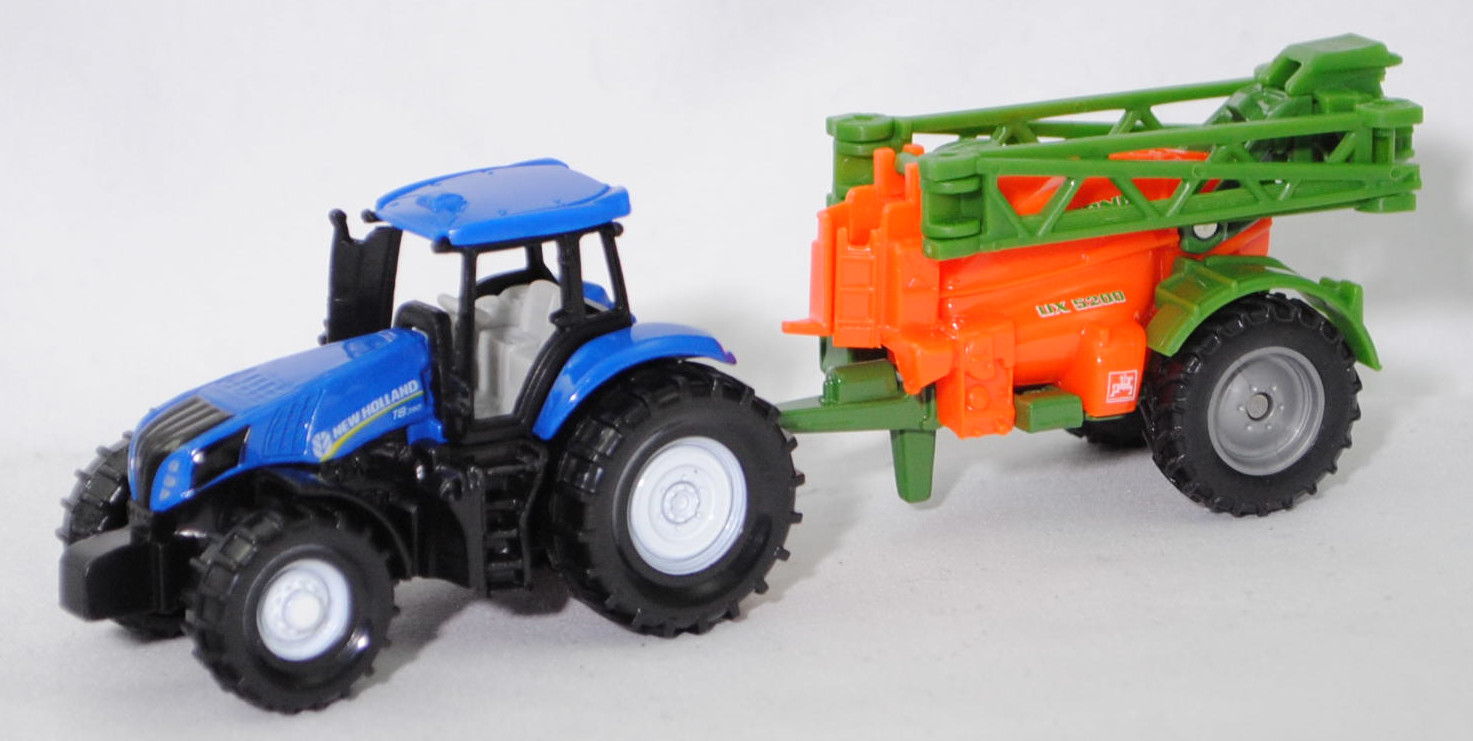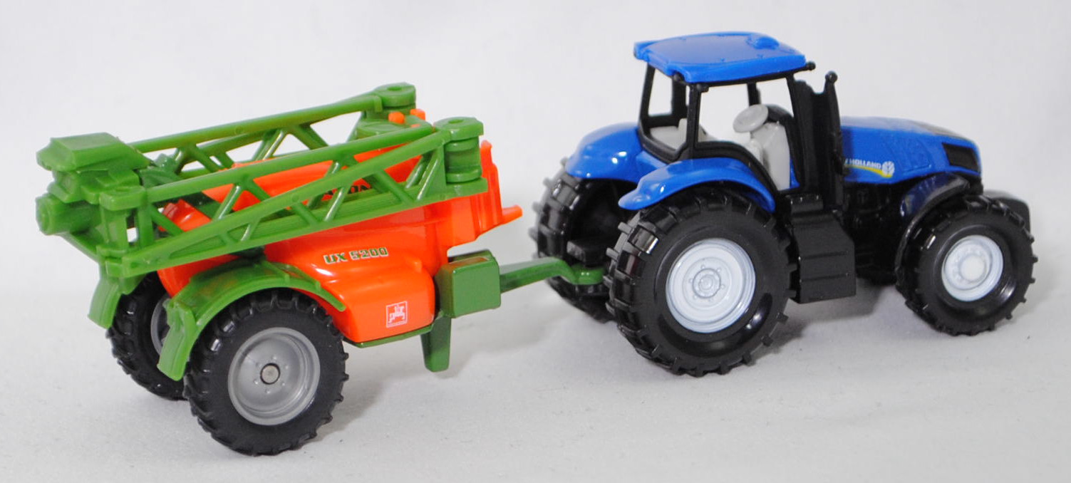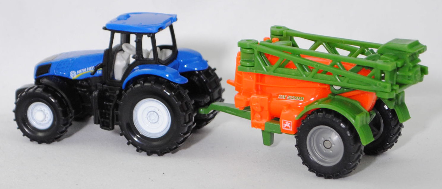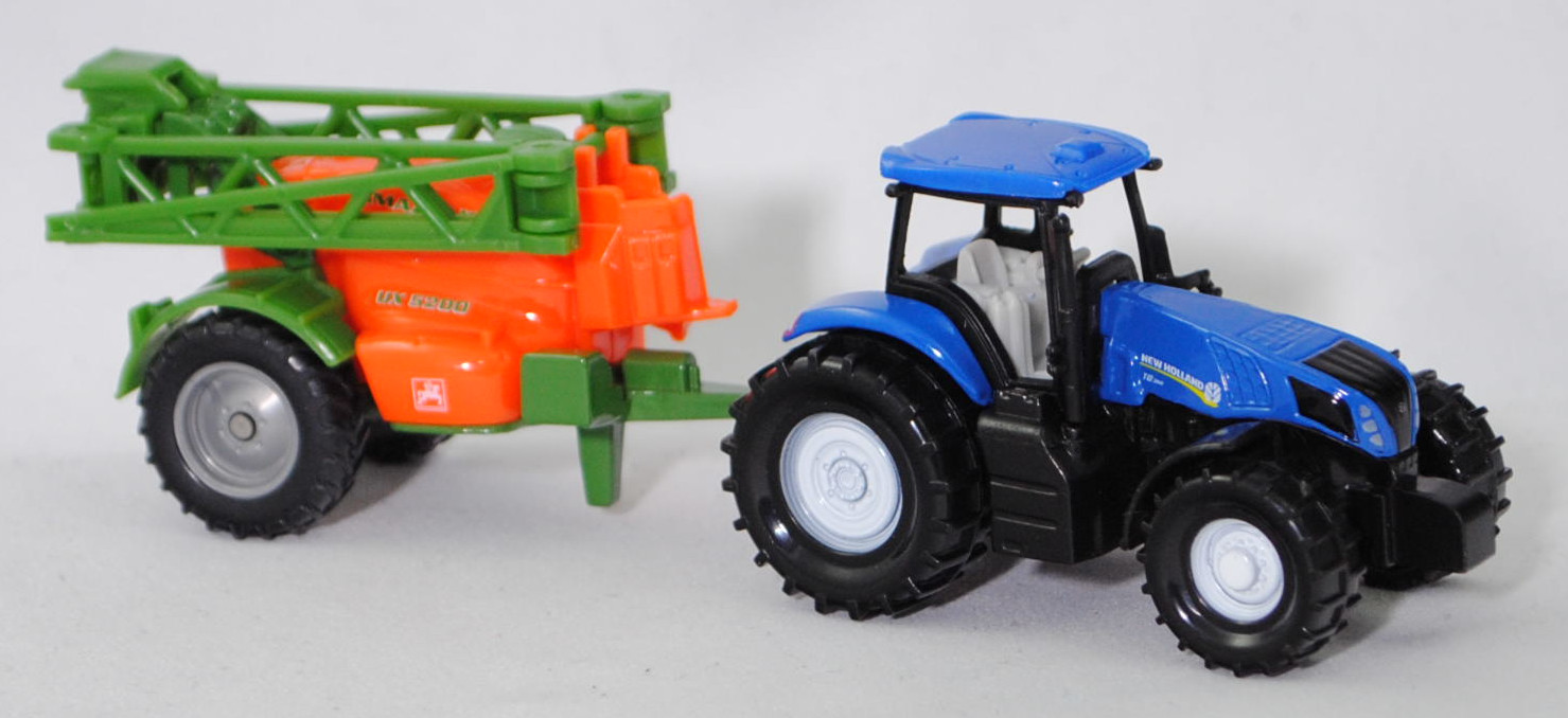 00001 New Holland T8.390 Tier 4A (Modell 2011-2015) mit AMAZONE Anhängefeldspritze UX 5200 Super (Modell 2013-), blau/schwarz + orange/grün, SIKU SUPER, P29f