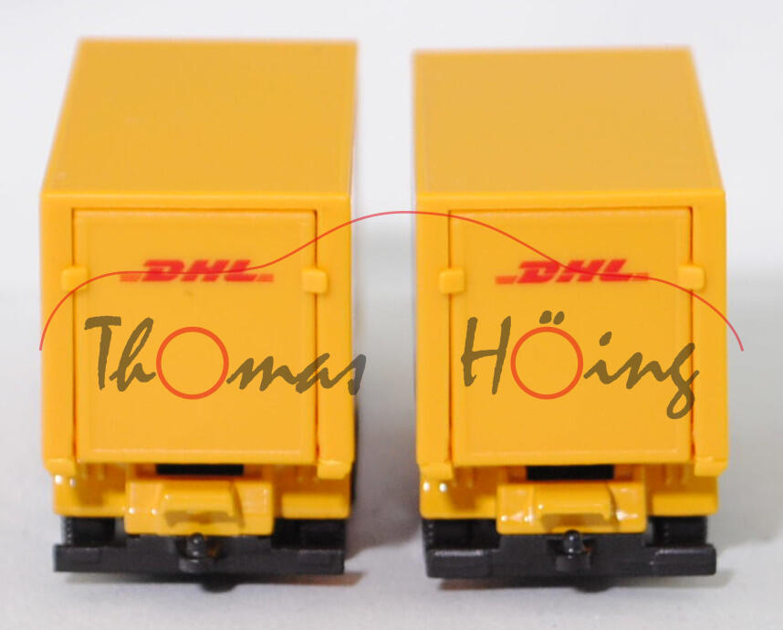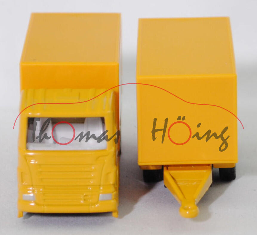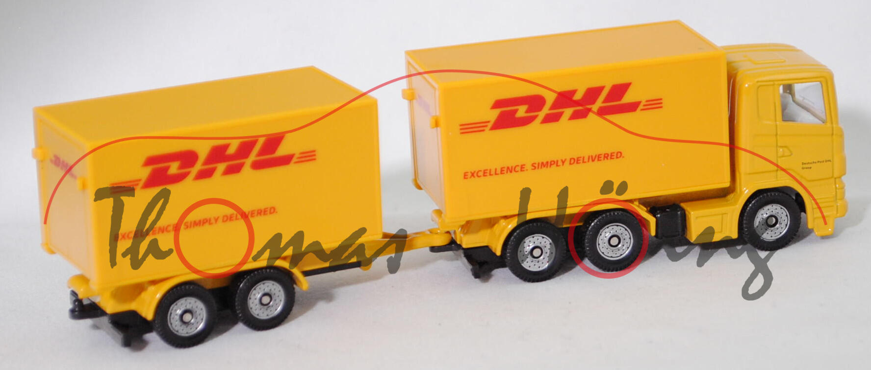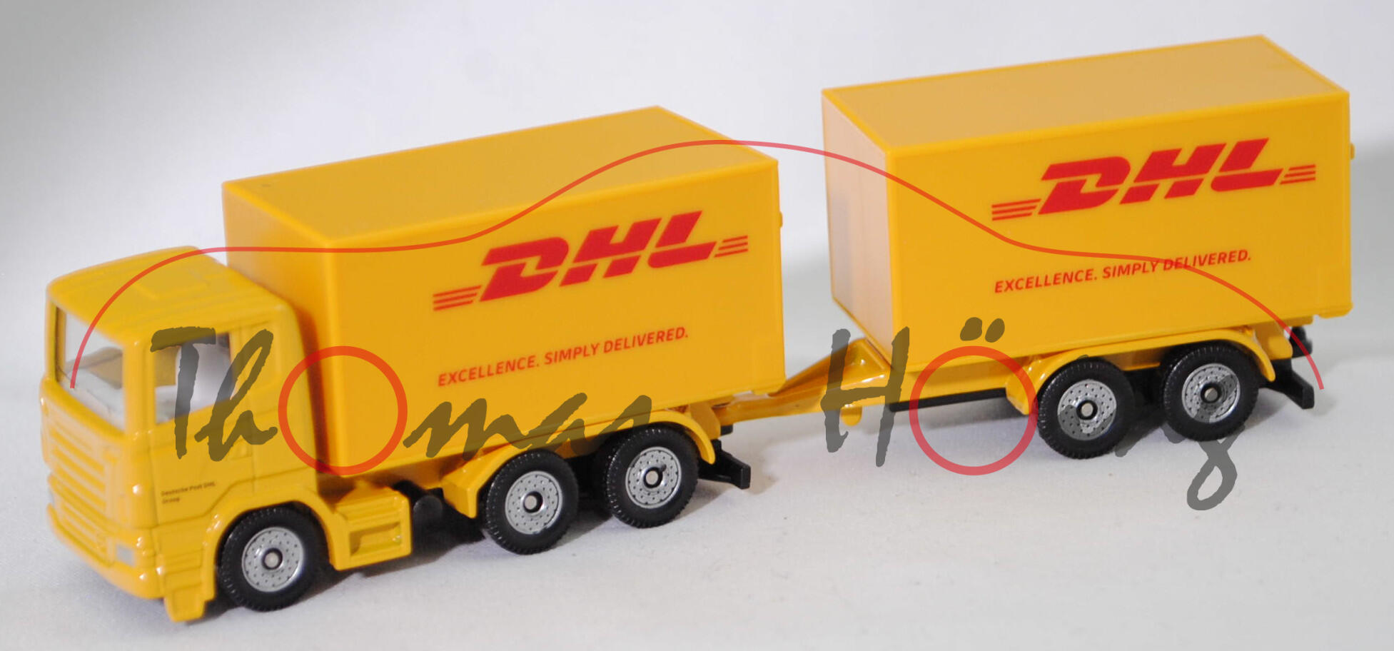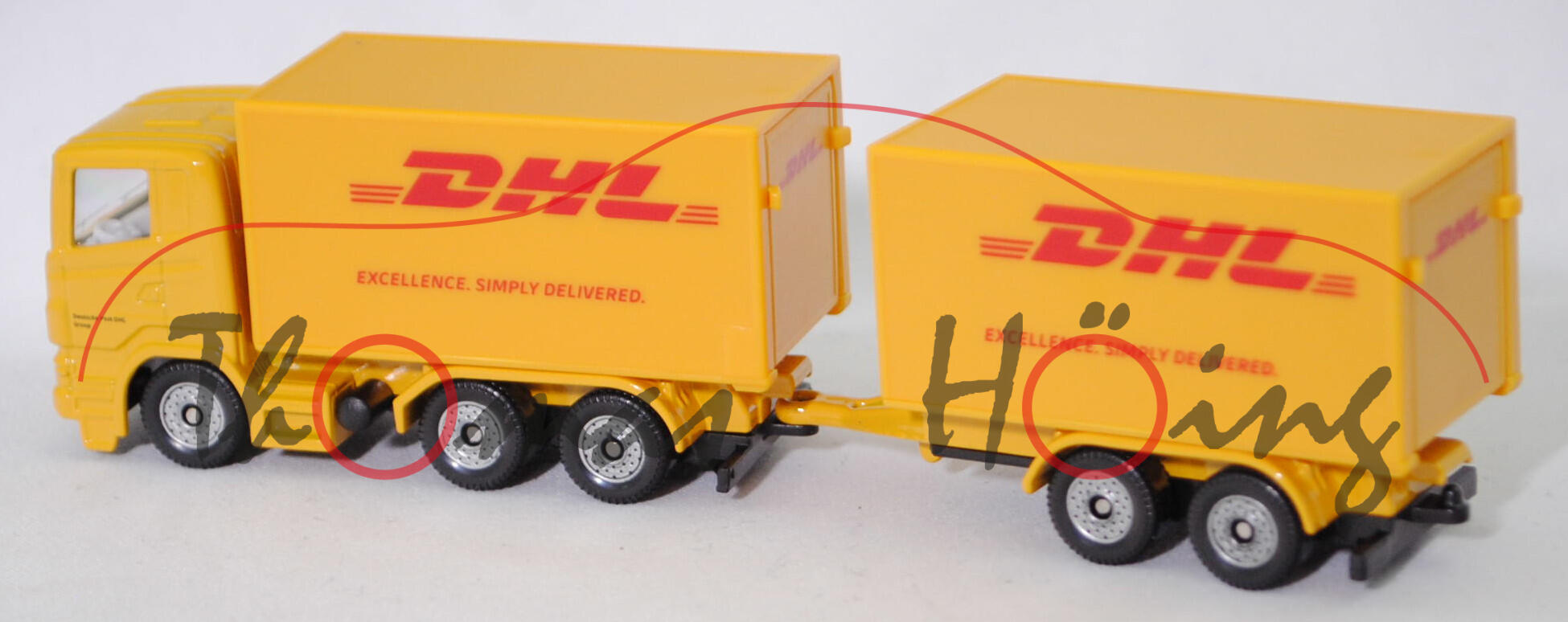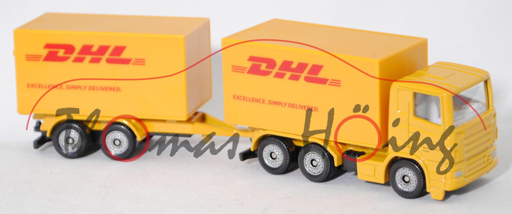 00001 Scania R380 (Scania Serie 5 bzw. PRT-Serie, 1. Generation R-Serie, Baureihe R für hoch montierte Frontlenker-Fahrerhäuser, Typ CR16, Day cab, mittellanges niedriges Frontlenker-Fahrerhaus (für niedriges Gewicht und hohes Ladevolumen), Kühlergrill mit 6 Lüftungsschlitzen, Motor: Scania Typ DC 12 18 380 (Euro 5) wassergekühlter Sechszylinder-Reihen-Viertakt-Diesel mit elektrisch und hydraulisch gesteuerter Pumpe-Düse-Einspritzung HPI) sowie Abgasturbolader (ATL) mit variabler Turbinen-Geometrie (VTG) und eine zentrale Nockenwelle sowie OHV-Ventilsteuerung (Overhead valve engine) und 4 Ventile pro Zylinder sowie Ladeluftkühler und 11716 cm³ sowie 380 PS, Modell 2007-2009) Koffer-LKW mit Tandem-Anhänger, Zugfahrzeug: goldgelb, innen reinweiß, Sitze reinweiß, Lenkrad integriert, Druck Deutsche Post DHL / Group in schwarz auf den Türen des Fahrerhauses, Druck DHL / EXCELLENCE. SIMPLY DELIVERED. in hell-karminrot auf den Seiten des Koffers, Druck DHL in hell-karminrot auf der Heckklappe, Koffer goldgelb, unterer Teil des Kühlergrills mit zusätzlicher Prägung eines liegenden U-Bügels auf der linken Seite, Chassis schwarz, Stoßfänger vorne durchgehend, Chassis geht bis an die Hinterkante des Stoßfängers, CE-Zeichen vor der Vorderachse von hinten aus lesbar, Bpr. mit Adresse, Druck Chargennummer auf dem Chassis, C36; Anhänger: Koffer goldgelb, Deichsel mit integrierten Radkästen goldgelb, Druck DHL / EXCELLENCE. SIMPLY DELIVERED. in hell-karminrot auf den Seiten des Koffers, Druck DHL in hell-karminrot auf der Heckklappe, Chassis schwarz, C36, SIKU SUPER, ca. 1:89, P29f (EAN 4006874016945)