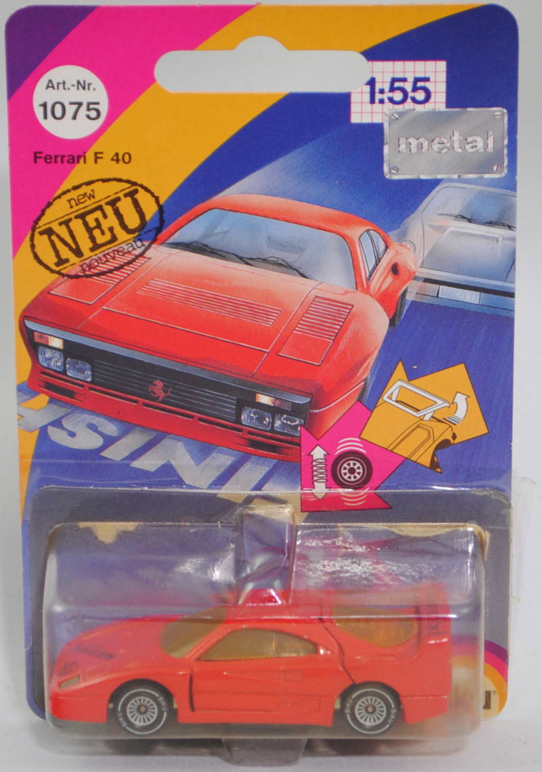 00001 Stock Ferrari F40 (1. Generation, Baureihe F40, interne Baureihenbezeichnung Typ F120, zweitüriger Supersportwagen als Coupé mit 2 Sitzplätzen, Fahrzeug zum 40-jährigen Firmenjubiläum und bestehen des Cavallino Rampante (springendes Pferd), F40: F = Ferrari und 40 = 40. Jahrestag des ersten für den Straßemverkehr zugelassenen Ferrari, Chefingenieur für die Entwicklung Nicola Materazzi bei Ferrari, Design der Karosserie: Pietro Camardella unter der Leitung von Aldo Brovarone beim Designstudio Pininfarina S.p.A., produzierte Fahrzeuge: 1311 Stück, Ausstattungslinie F40: Rohre aus legiertem Stahl integriert mit Elementen aus Verbundwerkstoffen + Fahrgastzelle aus Stahlrohkonstruktion mit zusätzlicher Verbundwerkstoff-Konstruktion stabilisiert + Karosserie Berlinetta (Sportcoupé mit 2 Sitzplätzen) bestehend aus 11 Teilen + Innenraum mit Überrollbügel + mechanisches, längsliegendes Getriebe mit 5 Vorwärts- und 1 Rückwärtsgang sowie einem integrierten Lamellen-Sperrdifferential + längs montierter 90-Grad-V8-Mittelmotor mit 2936 cm³ und 478 PS + Panorama-Heckscheibe + über die gesamte Breite reichender Heckflügel + unabhängige Radaufhängung vorne und hinten + Zahnstangenlenkung + innenbelüftete Scheibenbremsen an allen 4 Rädern + mechanische Handbremse auf die Hinterräder wirkend mit unabhängigen Bremszangen + zweigeteilter 120-Liter-Treibstoffbehälter aus Gummi mit Dämpfungsmatte + zusammenschraubbare Leichtmetallfelgen vorne Größe 8 J x 17 mit Radialreifen Tubless Pirelli P Zero 245/40 ZR 17 bzw. hinten Größe 13 J x 17 mit Radialreifen Tubless Pirelli P Zero 335/35 ZR 17, synchronisiertes 5-Gang-Schaltgetriebe mit Mittelschaltung, Hinterradantrieb, Motor: Ferrari Typ F120A (ohne Katalysator) wassergekühlter Achtzylinder-V-Viertakt-Otto mit zwei wassergekühlte IHI-Turbolader und elektronische Weber-Marelli Einspritzung sowie zwei obenliegende Nockenwellen (DOHC = Double Overhead Camshaft) je Zylinderbank und 4 Ventile pro Zylinder sowie zwei Behr-Ladeluftkühler und 2936 cm³ sowie 478 PS, Radstand 2450 mm, Länge 4358 mm, Modell 1987-1992), verkehrsrot (vgl. rosso corsa beim Original, Farbcode FER 300/6), innen schwarz, Sitze schwarz, Lenkrad schwarz, Druck Joachim Stock in schwarz oben auf dem Heckflügel, Druck Jubiläum / 40 in schwarz vorne auf der Haube, Nummernschild hinten in Wagenfarbe, Chassis chrom, W-Germ, ohne CE-Zeichen, Verglasung klar (vergilbt), B4 (Ferrari zusammenschraubbare zweiteilige Leichtmetallfelgen mit Zentralverschluss im Fünfspeichen-Design (Hersteller Speedline Typ SL 364) vorne Größe 8 J x 17 CH C = -1,4 mit Zentralverschluss (Teilenummer 134250, Fabcode silber) und Radialreifen Tubless Pirelli P Zero 245/40 ZR 17 bzw. hinten Größe 13 J x 17 CH C = 20 mit Zentralverschluss (Teilenummer 134255, Fabcode silber) und Radialreifen Tubless Pirelli P Zero 335/35 ZR 17), SIKU SUPER, ca. 1:56, P21 (Limited Edition) (Vitrinenmodell, Verglasung vergilbt, Modell nicht original für die Schachtel, Schachtel vergilbt und mit Lagerspuren, Schachtel war offen) (EAN 4006874010752)