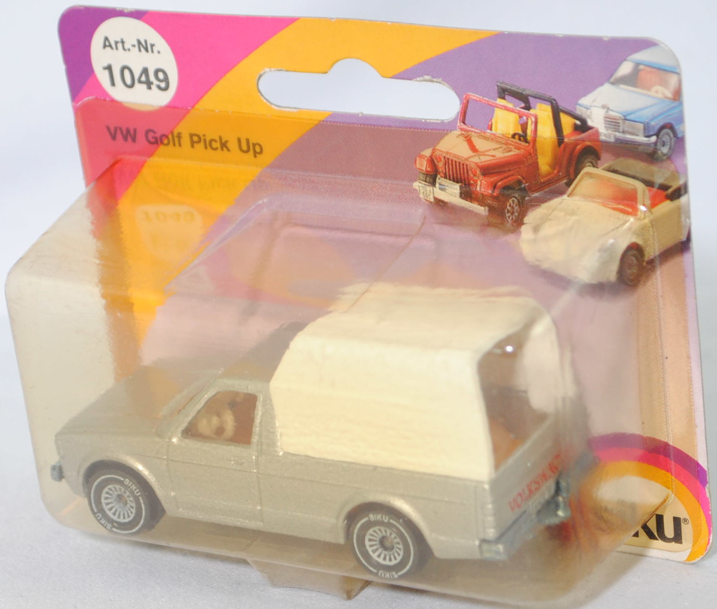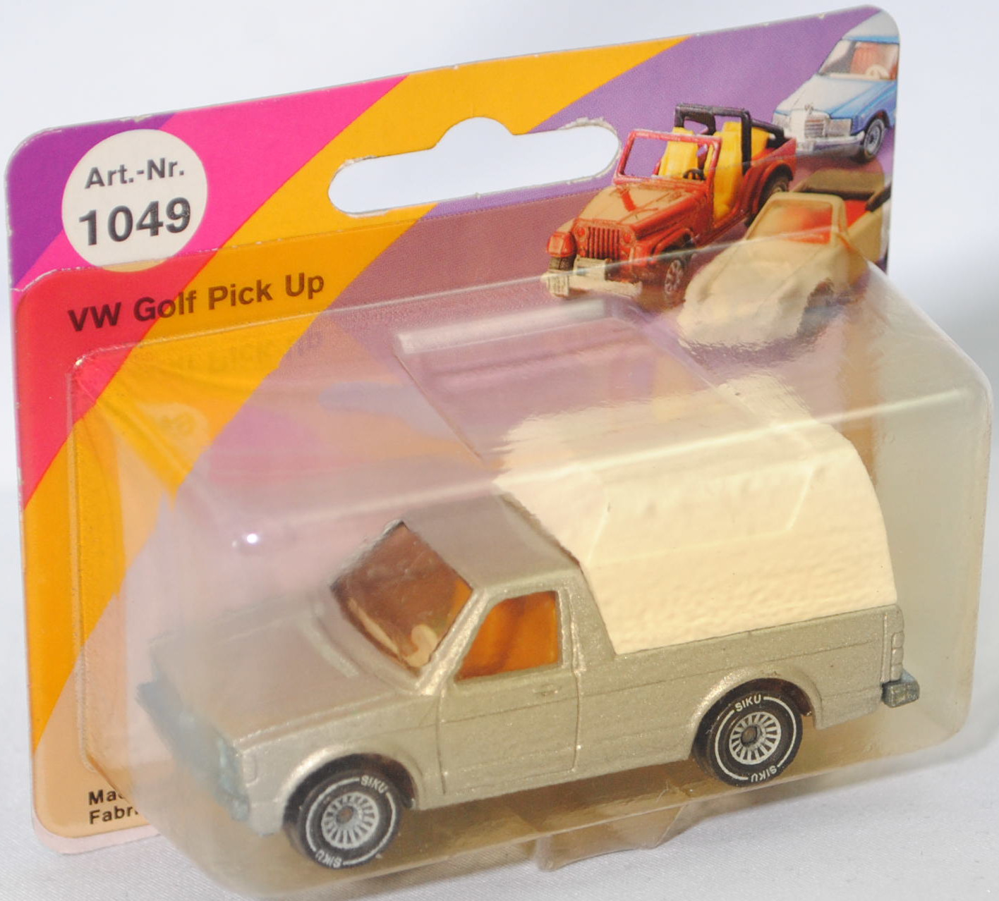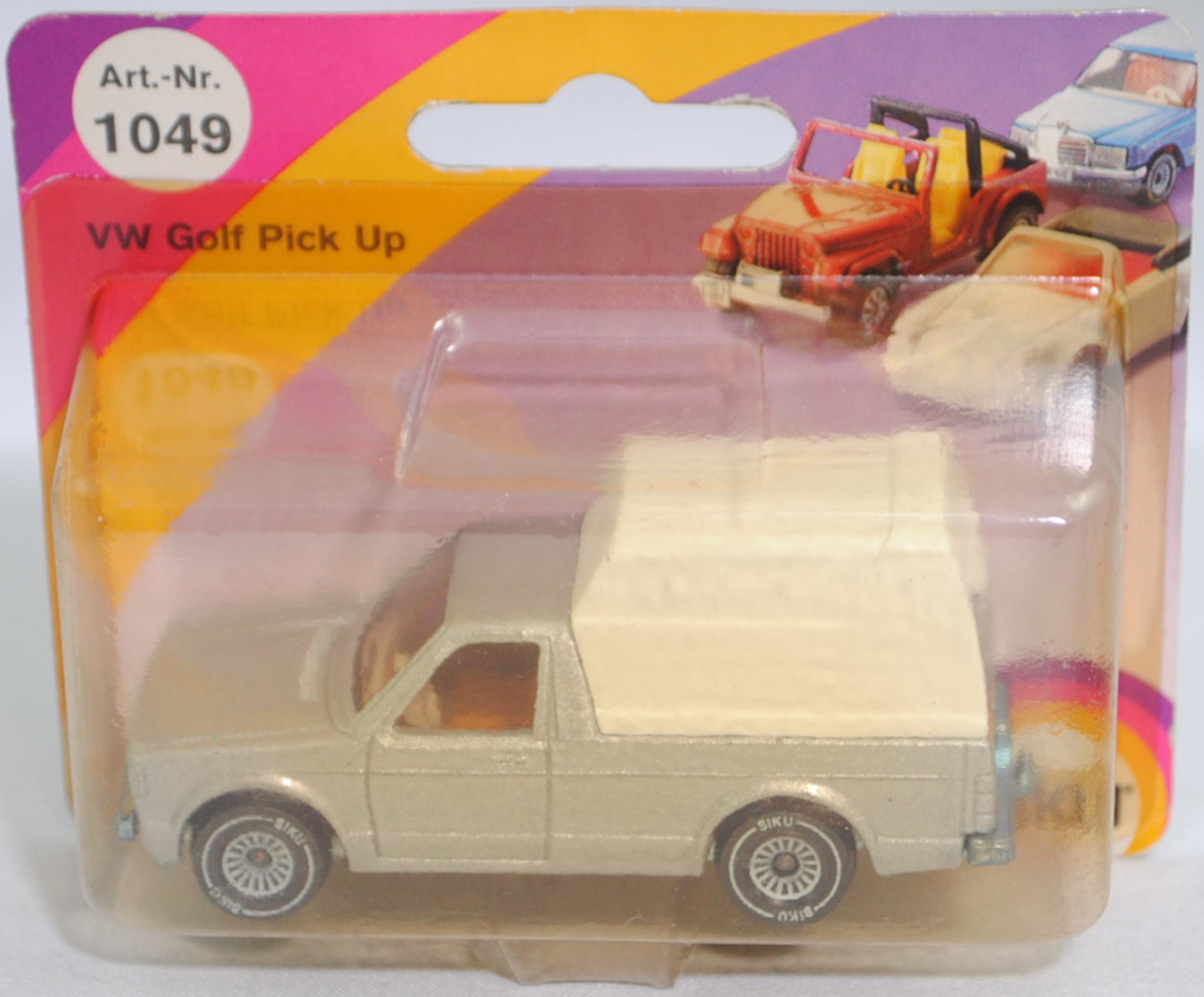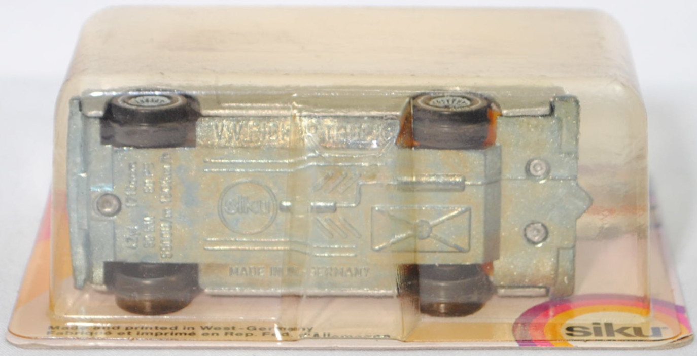 00001 VW Pickup Truck LX (vgl. VW Caddy I) (1. Generation, Baureihe Pickup Truck / Caddy, interne Baureihenbezeichnung 14D, Typ 147 (LHD = left-hand drive bzw. Linkslenker), zweitüriger Pritschenwagen mit 2 Sitzplätzen, Ausstattungslinie LX: Halogenscheinwerfer als Rechteckscheinwerfer + Blinker vorne neben den Scheinwerfern + verchromte Stahlstoßfänger mit Kastenprofil vorne + verchromter geteilter Stahlstoßfänger mit Kastenprofil hinten mit Trittstufe mittig + Stoßfänger vorne und hinten mit Aufprallleisten + Armaturenbrettfarbe farblich abgestimmt + Instrumententafel mit zwei runden Instrumenten für Geschwindigkeitsanzeige einschl. Kilometer- und Tageskilometerzähler sowie Quarzuhr einschl. Wassertemperaturanzeige und Tankanzeige + klapp- und schwenkbare Sonnenblenden mit Make-up-Spiegel auf der Beifahrerseite + abblendbarer Sicherheitsinnenspiegel + AM/FM-Radio mit Druckknopf + anatomisch geformte Schalensitze mit Stoffsitzbezug in Tweed-Struktur-Streifen + Sitzscharnierabdeckung farblich abgestimmt + Handschuhfach abschließbar und beleuchtet + getönte Scheiben + Ausstellfenster + Scheibenwischersteuerung mit Intervallschaltung + 2 Kleiderhaken + strapezierfähiger Nylon-Teppichboden + vollsynchronisiertes 3+E-Schaltgetriebe mit Hochschaltanzeige + Katalysator + AGR-System (Abgasrückführung) + Stahl-Lochscheibenräder Größe 5 J x 13 mit Radial-Stahlgürtelreifen P165/75 R 13, Hersteller: Volkswagen Westmoreland Assembly 1001 Technology Drive 15666 Westmoreland in Pennsylvania USA, vollsynchronisiertes Viergang-Schaltgetriebe als Mittelschaltung, Frontantrieb, Motor: Audi Typ VW EA827 wassergekühlter Vierzylinder-Reihen-Viertakt-Otto mit kontinuierlicher Einspritzung (CIS = Continuous Injection System) und eine obenliegende Nockenwelle (SOHC = Single Overhead Camshaft) sowie 2 Ventile pro Zylinder und 1715 cm³ sowie 78 PS, Motorkennbuchstabe WT, Radstand 2625 mm, Länge 4346 mm, Modell 1981-1983) mit Kastenaufbau, silbergraumetallic (vgl. diamantsilbermetallic beim Original, Verkaufskennzeichen Z4, Lacknummer L97A), innen signalgelb, Sitze signalgelb, Lenkrad reinweiß, Druck VOLKSWAGEN in signalrot auf der Heckklappe, Kastenaufbau reinweiß, ohne Loch in der Bodenplatte (2. Ausführung), Chassis chrom mit Anhängerkupplung (AHK), Bpr. ohne CE-Zeichen, B4 (VW gestylte Stahl-Lochscheibenräder mit Tiefbettfelge im 8-Loch-Design Größe 5 J x 13 H2 ET 45 mit Lochkreis 4 x 100 (Teilenummer 321 601 025 K, Farbcode chromfarben) und Radzierkappen (Teilenummer 321 601 151 B, verchromt) sowie Radial-Stahlgürtelreifen P165/75 R 13), SIKU SUPER, ca. 1:58, P23 (Vitrinenmodell, Schachtel vergilbt und mit Lagerspuren) (EAN 4006874010493)