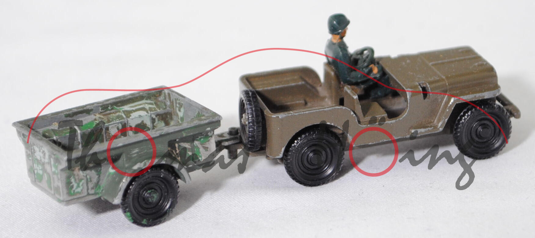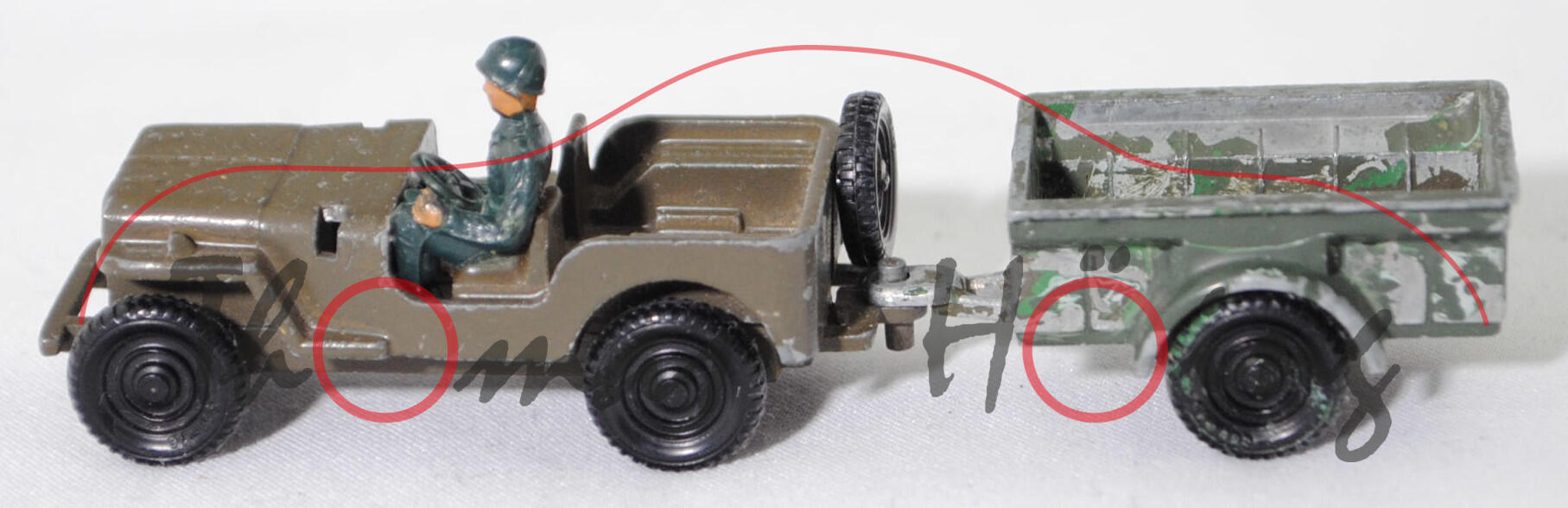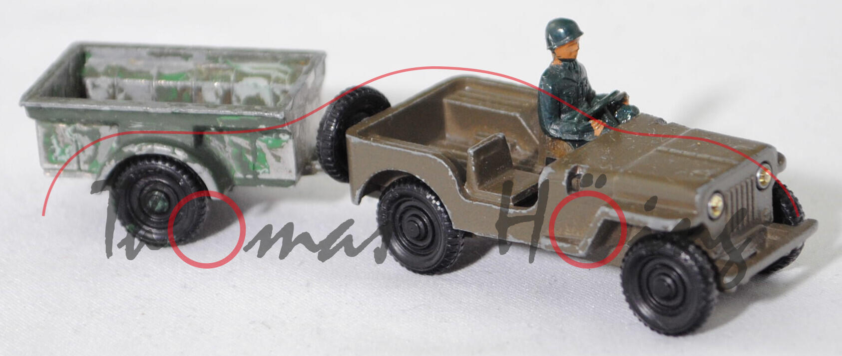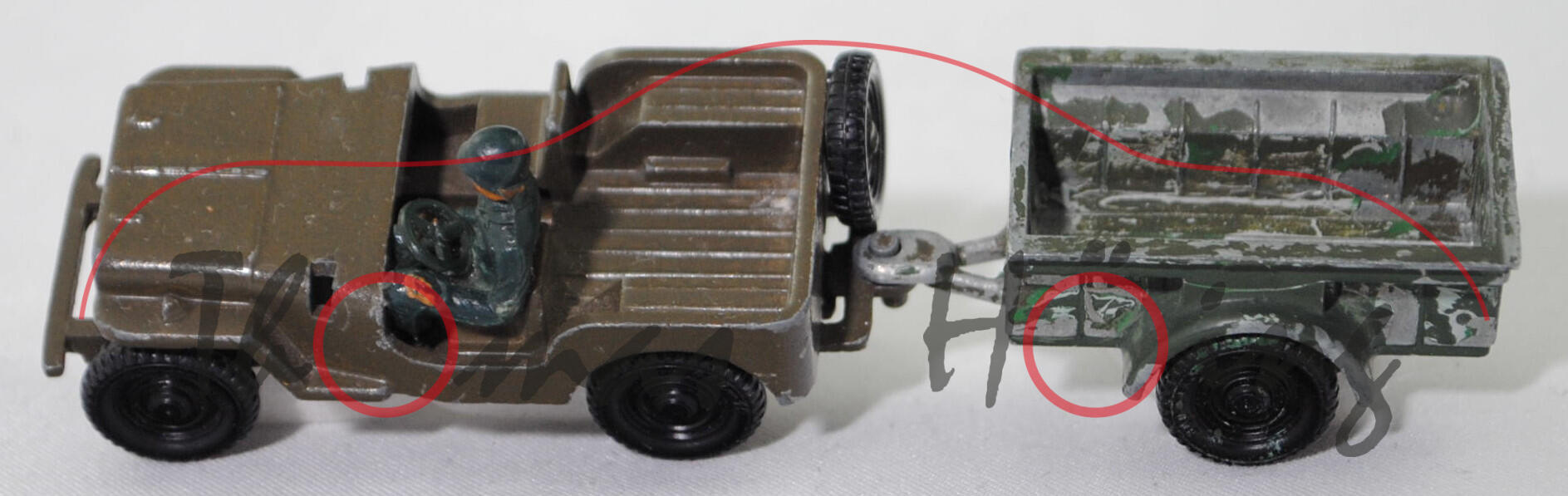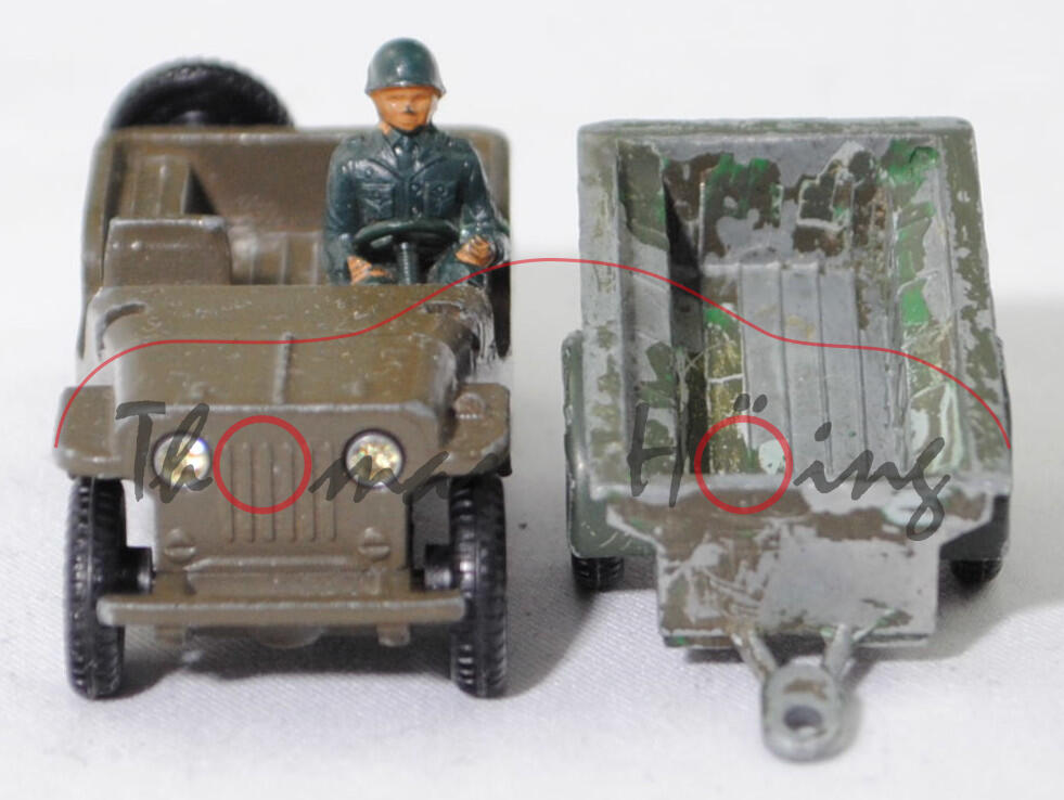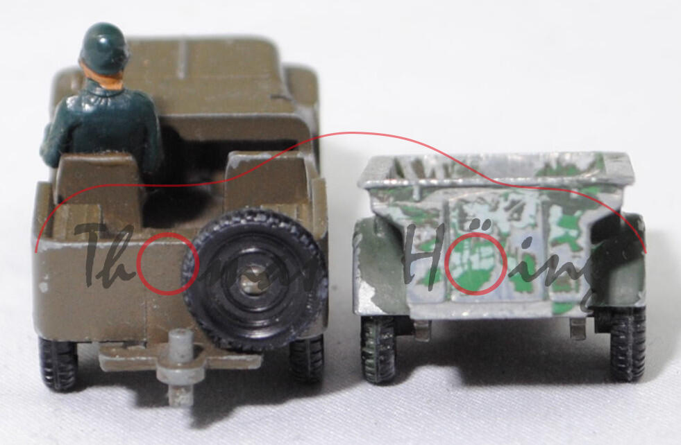 00001 Willys Jeep M38 (MC, Modell 1949-1953) mit Jeep 1/4-to Zweirad-Anhänger Modell T3 (Modell 1942-1945), olivgrün, RV 92, SIKU, sc (Scheibe weg, Anhänger nachlackiert)