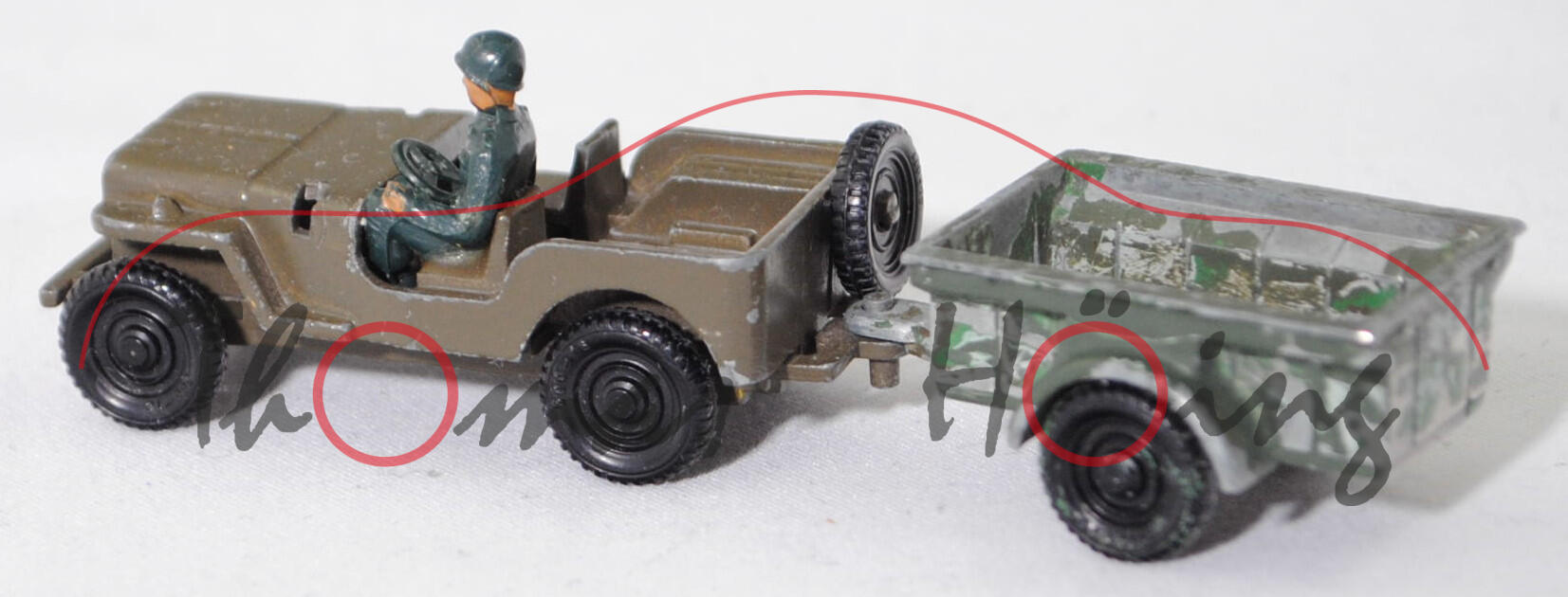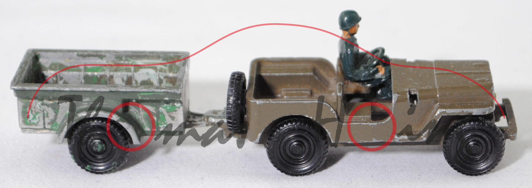 00001 Willys Jeep M38 (3. Generation, Baureihe Geländewagen, interne Baureihenbezeichnung MC, M38 = militärische Ausführung, offener Geländewagen ohne Türen mit 4 Sitzplätzen, einteilige Windschutzscheibe mit 3 Lüftungsklappen, Scheibenwischer unten montiert, Frontscheinwerfer stehen etwas hervor, Kotflügel vorne gerade auslaufend, Motorhaube ohne Erhöhung in der Mitte, von außen zugänglicher Tankstutzen auf der Fahrerseite, 12V-Batterie unter der Motorhaube, Ausstattungslinie M38: je zwei Schäkel an der Front- und Heckseite + Frontscheinwerfer mit einem Drahtbügel geschützt + ohne Trittstufe außen im Bereich des Einstieges + Pionierwerkzeuge Axt und Schaufel auf der Beifahrerseite außen angebracht + mit Klappe auf der Beifahrerseite zwischen Motorhaube und Windschutzscheibe als Zugang zur zweiten 12V-Batterie, Hersteller: Willys-Overland Motors 1000 Jeep Parkway 43610 Toledo 1 im Bundesstaat Ohio USA, 3-Gang-Schaltgetriebe, Allradantrieb mit abschaltbarem Frontantrieb, Motor: Willys Typ L-134 (auch Go Devil genannt, L-Kopf-Motor) wassergekühlter Vierzylinder-Reihen-Viertakt-Otto mit Carter-Fallstromvergaser mit Chokeklappe Typ 636 SA und eine stirnradgetriebene Nockenwelle sowie SV-Ventilsteuerung (SV = side valves bzw. stehende Ventile) und 2 stehende seitliche Ventile pro Zylinder sowie 2199 cm³ und 61 PS (1949-1950) bzw. Willys Typ Hurricane F4-134 (F-Head = F-Zylinderkopf) wassergekühlter Vierzylinder-Reihen-Viertakt-Otto mit Carter-Fallstromvergaser WO-596-S und eine zahnradgetriebene seitliche Nockenwelle sowie OHV-Ventilsteuerung (OHV = overhead valves) und 2 hängende Ventile pro Zylinder sowie 2199 cm³ und 61 PS (1950-1953), Radstand 2032 mm, Länge 3378 mm, Modell 1949-1953) mit Jeep 1/4-to Zweirad-Anhänger Modell T3 (1. Generation, Baureihe Lastenanhänger, Modell T3 (Bezeichnung bei American Bantam) bzw. MBT (Bezeichnung bei Willys), einachsiger Amphibien-Transport-Anhänger mit 1/4-to Nutzlast, maximale Nutzlast 226,8 kg, Kapazität 0,861 m³, Hersteller: American Bantam Car Company 123 W New Castle St 16001 Butler im Bundesstaat Pennsylvania USA, Abstand Mitte Zugöse zur Achsmitte (Deichsellänge) 1765,3 mm, Innenlänge Laderaum 1828,8 mm, Gesamtlänge einschl. Deichsel 2755,9 mm, Modell 1942-1945), Jeep: Karosserie olivgrün, Sitze olivgrün, Lenkrad blaugrün, mit Soldat in blaugrüner Uniform mit blaugrünem Stahlhelm als Fahrer, separat eingesetzte Glasfacetten-Frontscheinwerfer (Fac), Dorn der Anhängerkupplung hinten oben und unten, Bpr. V228, Bpr. Siku hinter der Hinterachse, Germ zwischen Vorder- und Hinterreifen auf der rechten Seite über zwei Zeilen, Hohlniete hinter der Vorderachse und Haltezapfen hinten, ohne Verglasung, Ersatzrad RV 92 schwarz hinten rechts an der Karosserie, RV 92 schwarz (Willys einteilige Stahlfelge im 4-Langloch-Design Größe 4,5 E x 16 ET 22 mit Lochkreis 5 x 139,7 und Reifen 7.00-16 6-ply), ca. 1:60; Anhänger: Anhängerwanne olivgrün, Kotflügel olivgrün, Anhängerrahmen mit Deichsel olivgrün, Bpr. 228 / V, RV 92 schwarz (Kelsey Hayes zweiteilige Stahlfelge Typ Combat im 8-Punkt-Design Größe 4,5 E x 16 ET 22 mit Lochkreis 5 x 139,7 und Goodyear All Service Reifen 6.00-16 6-ply), ca. 1:64, SIKU-SUPER-ZINKGUSS 1:60 (V-SERIE), sc (Frontscheibe weg, Anhänger wurde mal nachlackiert, Lackfehler) (EAN 4006874002283)