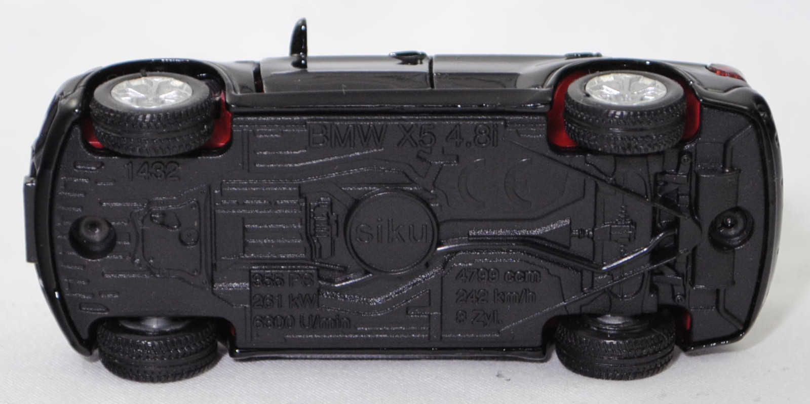 00002 BMW X5 3.0si / xDrive30i (2. Generation, Baureihe X5, interne Baureihenbezeichnung E70, fünftüriges Sport Utility Vehicle (SUV) mit 5 Sitzplätzen, Vorfacelift (vor LCI = vor Life Cycle Impulse bzw. vor Modellpflegemaßnahmen), Frontziergitter mit Nieren-Längsstreben in schwarz mit Chromeinfassung, Front- und Heckschürze nur im oberen Bereich in Wagenfarbe lackiert, breite flache Lüftungsöffnungen unten außen im Stoßfänger, mittlere Lüftungsöffnung im Stoßfänger nur bis auf halber Nummernschildhöhe geführt, runde Nebelscheinwerfer in trichterförmiger Aussparung im Stoßfänger, Stoßfänger hinten durchgehend ohne angedeuteten Diffusor, 2 runde Edelstahl-Auspuffendrohre je eins rechts und links, Ausstattungslinie 3.0si / xDrive30i: Halogen-Scheinwerfer + Nebelscheinwerfer + Frontziergitter mit Nieren-Längsstäben in schwarz, mit Chromeinfassung + Sechszylinder-Motor mit 2996 cm³ und 272 PS + 6-Gang-Automatic-Getriebe und elektronischem Gangwahlschalter inkl. Steptronic und adaptiver Getriebesteuerung + Außenspiegel asphärisch beheizt und elektrisch einstellbar + Innenspiegel automatisch abblendend + Interieurleisten Graphitan matt + Lederlenkrad im 3-Speichen Design mechanisch längs- und höhenverstellbar + Klimaautomatik + Sitzverstellung teilelektrisch für Fahrer und Beifahrer + Polsterung Stoff Twill + Fensterrahmenleiste in schwarz matt + Dachspoiler inkl. dritter Bremsleuchte + Heckklappe zweiteilig, Oberteil nach oben zu öffnen, Heckklappenunterteil manuell entriegelbar, Unterteil auf Ladekantenniveau abklappbar + Heckscheibenwischer + 2 Auspuffendrohre (je eins rechts und links), Edelstahl, rund + Leichtmetallräder Sternspeiche 209 Größe 8,5 J x 18 mit Reifen 255/55 R 18 Runflat, 6-Gang-Automatikgetriebe, Allradantrieb, Motor: BMW Typ N52B30 wassergekühlter Sechszylinder-Reihen-Viertakt-Otto mit Saugrohreinspritzung und zwei obenliegende Nockenwellen (DOHC = Double Overhead Camshaft) sowie 4 Ventile pro Zylinder und 2996 cm³ sowie 272 PS, Radstand 2933 mm, Länge 4854 mm, Modell 2006-2008 als X5 3.0si bzw. 2008-2010 als X5 xDrive30i), schwarz (vgl. schwarz II beim Original, Farbcode 668), innen feuerrot, Sitze feuerrot, Lenkrad feuerrot, Bpr. 1432 beim linken Vorderrad, Bpr. ohne Adresse, ohne Chargendruck auf dem Chassis, B41 silber (BMW Leichtmetallräder Sternspeiche 209 (5-Speichen-Design) Größe 8,5 J x 18 ET 46 mit Lochkreis 5 x 120 (Teilenummer 36 11 6 770 200, Farbe silber) und Nabenabdeckung (Ø 67 mm mit Chromrand, Teilenummer 36 13 6 783 536) sowie Reifen 255/55 R 18 109V Runflet), SIKU SUPER, ca. 1:58, m (Vitrinenmodell) (EAN 4006874014323)