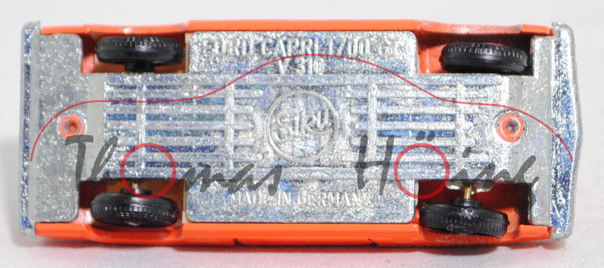 Produktinformationen "00002 Ford Capri 1700 GT (Modell 1969-1972), hell-reinorange, innen hell-elfenbein, Lenkrad perlweiß, R3, SIKU (V-SERIE), 1:60, m- (Achshalterung Produktionsfehler)"