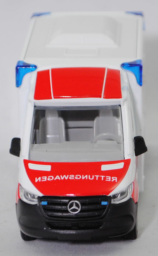 00002 MIESEN Rettungswagen mit Kofferaufbau (Typ selbsttragender Leicht-Kofferaufbau, Ausbau nach DIN EN 1789 Typ C, mit Trittstufe hinten, Hersteller: C. Miesen GmbH & Co. KG, Südstraße 119, 53175 Bonn, Modell 2017-) auf Mercedes-Benz Sprinter III (3. Generation, Baureihe Sprinter W 907, interne Baureihenbezeichnung VS30, Typ Standard L2 mit Fahrerhaus und mittlerem Radstand, Ausstattungslinie 519 CDI Fahrgestell L2 RWD 5,0t: Einzelkabine + Motor mit 190 PS + Doppelbereifung auf der Hinterachse + Hinterradantrieb, zulässiges Gesamtgewicht 5000 kg, 7-Gang-Automatikgetriebe 7G-TRONIC Vollautomatik, Hinterradantrieb, Motor: Mercedes-Benz OM 642 DE 30 LA wassergekühlter Sechszylinder-V-Viertakt-Diesel mit Abgasturbolader und Common-Rail-Direkteinspritzung sowie zwei obenliegende Nockenwellen (DOHC = Double Overhead Camshaft) und 4 Ventile pro Zylinder sowie Ladeluftkühlung und 2987 cm³ sowie leistungsreduziert 190 PS, Baumuster Motor 642.899, Radstand 3.665 mm, Länge 5950 mm, Modell 2018-2021) 519 CDI Fahrgestell, reinweiß, innen lichtgrau, Sitze lichtgrau, Lenkrad lichtgrau, Druck C MIESEN in schwarz auf den Türen des Fahrerhauses, Druck hell-verkehrsrote Streifen auf den Seiten des Fahrerhauses, Druck Motorhaube in hell-verkehrsrot wobei RETTUNGSWAGEN in Spiegelschrift in Wagenfarbe durchschimmert, Druck Dach des Fahrerhauses in hell-verkehrsrot, Druck Kofferaufbau auf den Seiten teilweise in hell-verkehrsrot wobei FEUERWEHR / C 112 und Herzfrequenz in Wagenfarbe durchschimmert, zusätzlicher Druck RTW 1 in hell-verkehrsrot auf den Seiten des Koffers, Druck Doppelflügeltüren hinten im unteren Bereich in hell-verkehrsrot wobei RTW 1 links und FEUERWEHR / C 112 rechts in Wagenfarbe durchschimmert, ohne Arbeitsscheinwerfer oben am Kofferaufbau im Bereich der Doppelflügeltüren, untere Hecktürhalterung mittig mit Anschlagverlängerung, Innenausstattung mit integrierten Stiften am Boden auf der Innenseite der Hecktürhalterungen als Türanschlag, LKW54 silbergrau (Mercedes-Benz Stahlräder im 18-Loch-Design Größe 5,5 J x 16 H2 HMA (halber Mittenabstand) 117 mm mit Lochkeis 6 x 205 (Teilenummer A 907 401 47 00, Farbcode 9206 silber) mit Radmutterabdeckung (nur für die Vorderachse, Teilenummer A 906 400 02 25, Farbcode schwarz) und Reifen 205/75 R 16 C 113 / 111 R), Zubehör: 1 SYSTEM STROBEL Tragetisch AERO Komfort - pneumatisch in lichtgrau; 1 Stück Spineboard in verkehrsgelb, SIKU SUPER 1:50, ca. 1:48, L17mpK (EAN 4006874021154)