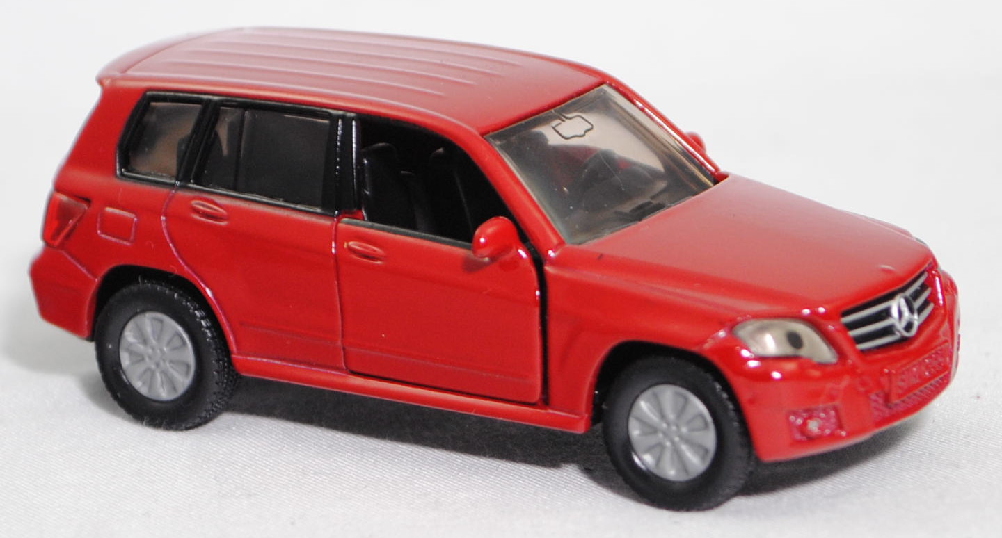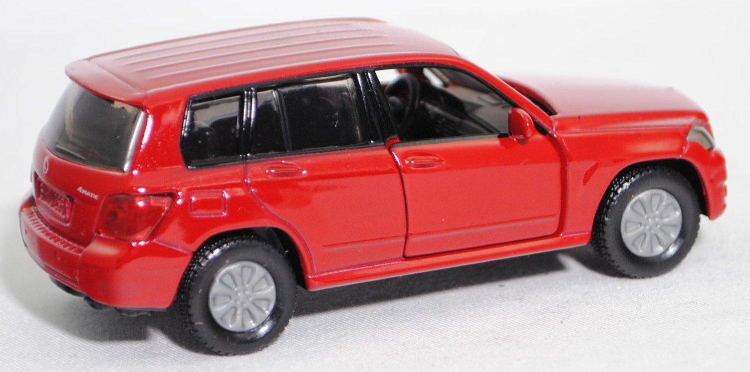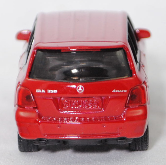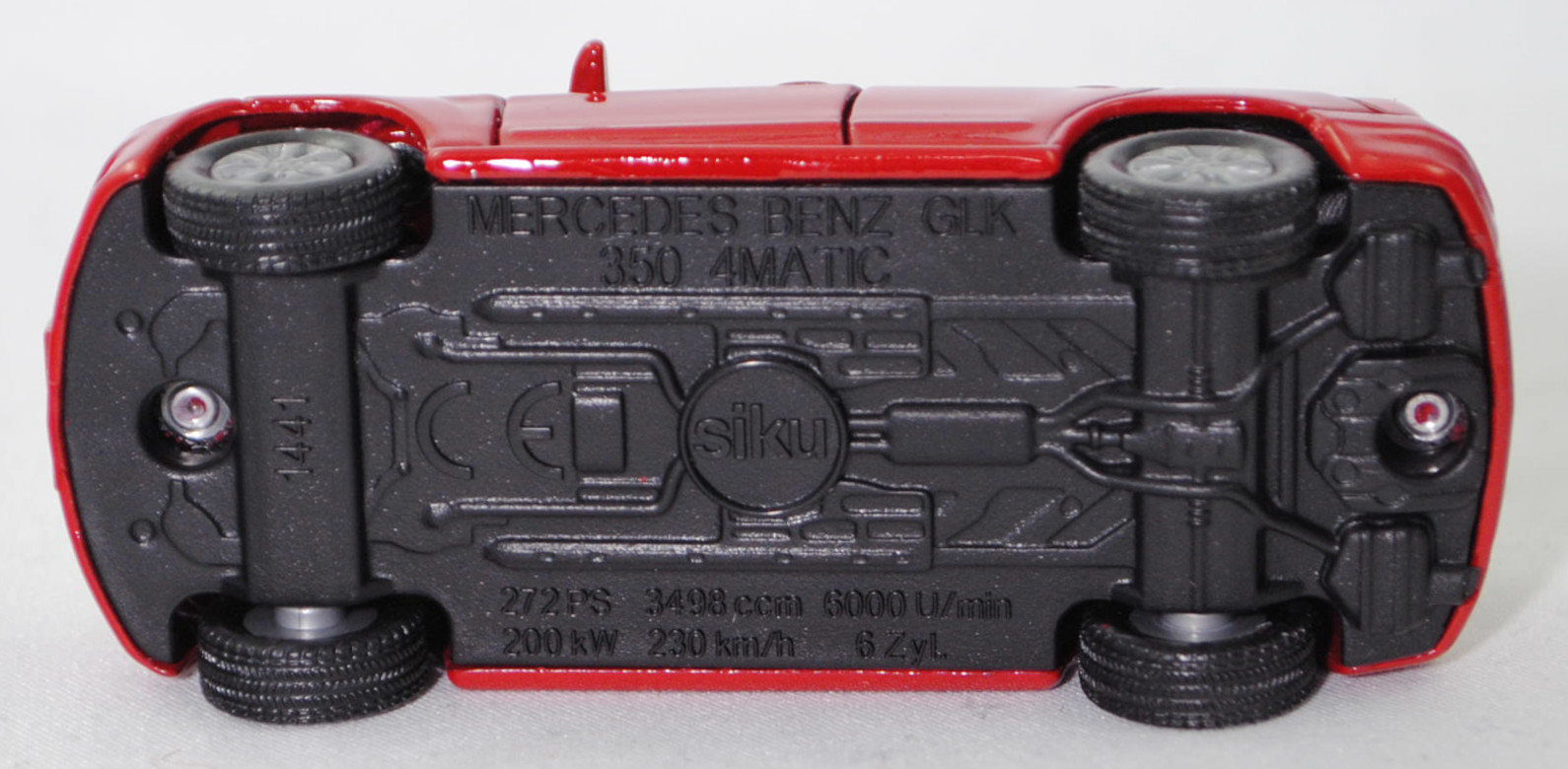 00002 Mercedes-Benz GLK 350 4MATIK (1. Generation, Baureihe GLK, interne Baureihenbezeichnung X 204, fünftüriger SUV (Sport Utility Vehicle) mit 5 Sitzplätzen, Konstruktionsbezeichnung X 204 E 35 4, Baumuster 204.987, Vertrieb in Deutschland bis 2011 und als Exportmodell bis 2012, Vor-MoPf (vor Modellpflege, Vorfacelift), Hauptscheinwerfer als Halogen-Scheinwerfer mit separaten Halogenlampen für Abblendlicht und Fernlicht, Kühlergrill mit drei Lamellen, Stoßfänger vorne mit rautenförmigen Einsatz außen und integrierten runden Nebelscheinwerfern sowie trapezförmigem Lüftungsgitter mittig wobei die längere Trapezseite an der Oberseite angeordnet ist, Stoßfängerunterseite mit integriertem Unterfahrschutz vorne glatt ohne Profilierung, Rückfahrscheinwerfer breit und mittig angeordnet, hohe Rückstrahler im hinteren Stoßfänger mit kurzem Übergang zur Seite kurz über den Auspuffendrohren angeordnet, Stoßfänger hinten mit gerade verlaufender Abschlusskante unten, Auspuffendrohren unterhalb des Stoßfängers angeordnet, Ausstattungslinie Grundmodell: Klarglas-Halogenscheinwerfer mit Projektionstechnik + Nebelscheinwerfer und Nebelschlussleuchte mit Klarglasabdeckung + Lufteinlass mit silbernen Lamellen + Außenspiegel links und rechts beheizt, von innen elektrisch einstellbar + Blinkleuchten in den Außenspiegeln + Türgriffe in Wagenfarbe lackiert + Kombiinstrument mit 3 analogen Rundinstrumenten und Display + Blinker mit Komfort-Tipp-Schaltung + Parameterlenkung + Sonnenblenden mit beleuchtetem Make-up-Spiegel + Handschuhkasten beleuchtet, klimatisier- und abschließbar + Ablagefach und Doppelcupholder in der Mittelkonsole + Armauflage vorne seitlich klappbar mit Ablagefach + Vordersitze mit elektrischer Höhen- und Lehnenverstellung, mechanischer Sitzkissenneigungsverstellung und Fahrersitz mit mechanischer Lordosenstütze + Polsterung Stoff Boston + Kartentaschen an Fahrer- und Beifahrerlehne + Einstiegsschienen vorne und hinten, vorne mit Schriftzug Mercedes-Benz + Seitenschweller schwarz genarbt + 3. Bremsleuchte in LED-Technik + Heckscheibenwischer mit automatischer Zuschaltung bei Rückwärtsfahrt + Leichtmetallräder im 7-Speichen-Design Größe 7,5 J x 17 ET 47,5 mit Reifen 235/60 R 17, 7G-Tronic (7-Gang-Automaikgetriebe), permanenter Allradantrieb 4MATIC, Motor: Mercedes-Benz Typ M 272 E 35 wassergekühlter Sechszylinder-V-Viertakt-Otto mit mirkoprozessorgesteuerter Einspritzung mit Heißfilm-Luftmassenmessung und zwei obenliegende Nockenwelle (DOHC = Double Overhead Camshaft) je Zylinderreihe sowie 4 Ventile pro Zylinder und 3498 cm³ sowie 272 PS, Baumuster Motor 272.971, Radstand 2755 mm, Länge 4528 mm, Modell 2008-2012), karminrot (vgl. feueropal beim Original, Farbcode 590 bzw. 3590), innen schwarzgrau, Sitze schwarzgrau, Lenkrad schwarzgrau, Lamellen und Mercedes-Benz-Stern im Kühlergrill silber, Druck Mercedes-Benz-Stern und GLK 350 / 4MATIC in silber auf der Heckklappe, Bpr. 1441 unter der Vorderachse und CE-Zeichen mittig hinter der Vorderachse sowie siku-Logo mittig auf dem Chassis, B45 silbergrau (Mercedes-Benz Leichtmetallräder im 7-Speichen-Design (Code R44) Größe 7,5 J x 17 ET 47,5 mit Lochkreis 5 x 112 (Teilenummer A 204 401 59 02, Farbcode silber) und Nabendeckel / Radzierdeckel (Teilenummer A 171 400 00 25, Farbcode silber mit Rand in royalblau (Farbcode 5337) sowie Stern in der Mitte und Lorbeerkranz außen) sowie Reifen 235/60 R 17 102V), SIKU SUPER, ca. 1:55, m (Vitrinenmodell) (EAN 4006874014415)