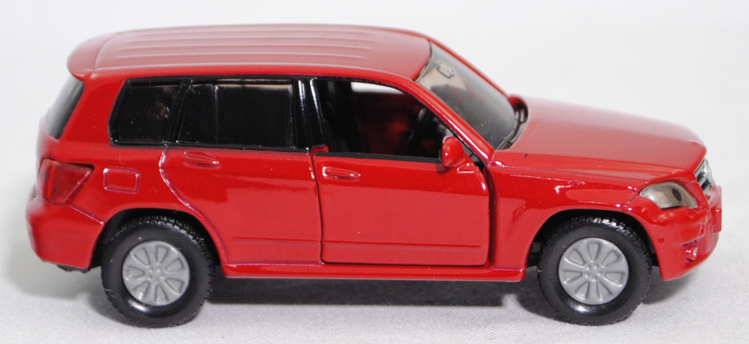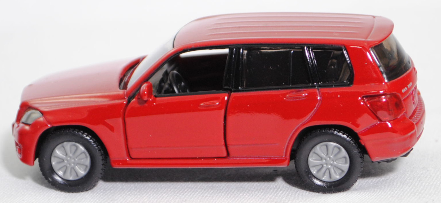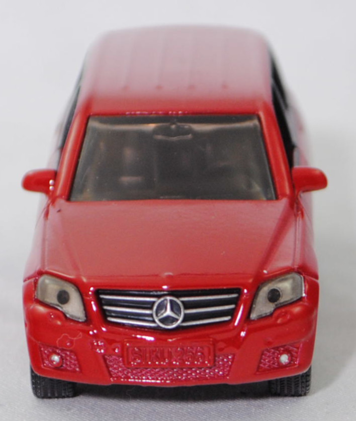 00002 Mercedes-Benz GLK 350 4MATIK (1. Generation, Baureihe GLK, interne Baureihenbezeichnung X 204, fünftüriger SUV (Sport Utility Vehicle) mit 5 Sitzplätzen, Konstruktionsbezeichnung X 204 E 35 4, Baumuster 204.987, Vertrieb in Deutschland bis 2011 und als Exportmodell bis 2012, Vor-MoPf (vor Modellpflege, Vorfacelift), Hauptscheinwerfer als Halogen-Scheinwerfer mit separaten Halogenlampen für Abblendlicht und Fernlicht, Kühlergrill mit drei Lamellen, Stoßfänger vorne mit rautenförmigen Einsatz außen und integrierten runden Nebelscheinwerfern sowie trapezförmigem Lüftungsgitter mittig wobei die längere Trapezseite an der Oberseite angeordnet ist, Stoßfängerunterseite mit integriertem Unterfahrschutz vorne glatt ohne Profilierung, Rückfahrscheinwerfer breit und mittig angeordnet, hohe Rückstrahler im hinteren Stoßfänger mit kurzem Übergang zur Seite kurz über den Auspuffendrohren angeordnet, Stoßfänger hinten mit gerade verlaufender Abschlusskante unten, Auspuffendrohren unterhalb des Stoßfängers angeordnet, Ausstattungslinie Grundmodell: Klarglas-Halogenscheinwerfer mit Projektionstechnik + Nebelscheinwerfer und Nebelschlussleuchte mit Klarglasabdeckung + Lufteinlass mit silbernen Lamellen + Außenspiegel links und rechts beheizt, von innen elektrisch einstellbar + Blinkleuchten in den Außenspiegeln + Türgriffe in Wagenfarbe lackiert + Kombiinstrument mit 3 analogen Rundinstrumenten und Display + Blinker mit Komfort-Tipp-Schaltung + Parameterlenkung + Sonnenblenden mit beleuchtetem Make-up-Spiegel + Handschuhkasten beleuchtet, klimatisier- und abschließbar + Ablagefach und Doppelcupholder in der Mittelkonsole + Armauflage vorne seitlich klappbar mit Ablagefach + Vordersitze mit elektrischer Höhen- und Lehnenverstellung, mechanischer Sitzkissenneigungsverstellung und Fahrersitz mit mechanischer Lordosenstütze + Polsterung Stoff Boston + Kartentaschen an Fahrer- und Beifahrerlehne + Einstiegsschienen vorne und hinten, vorne mit Schriftzug Mercedes-Benz + Seitenschweller schwarz genarbt + 3. Bremsleuchte in LED-Technik + Heckscheibenwischer mit automatischer Zuschaltung bei Rückwärtsfahrt + Leichtmetallräder im 7-Speichen-Design Größe 7,5 J x 17 ET 47,5 mit Reifen 235/60 R 17, 7G-Tronic (7-Gang-Automaikgetriebe), permanenter Allradantrieb 4MATIC, Motor: Mercedes-Benz Typ M 272 E 35 wassergekühlter Sechszylinder-V-Viertakt-Otto mit mirkoprozessorgesteuerter Einspritzung mit Heißfilm-Luftmassenmessung und zwei obenliegende Nockenwelle (DOHC = Double Overhead Camshaft) je Zylinderreihe sowie 4 Ventile pro Zylinder und 3498 cm³ sowie 272 PS, Baumuster Motor 272.971, Radstand 2755 mm, Länge 4528 mm, Modell 2008-2012), karminrot (vgl. feueropal beim Original, Farbcode 590 bzw. 3590), innen schwarzgrau, Sitze schwarzgrau, Lenkrad schwarzgrau, Lamellen und Mercedes-Benz-Stern im Kühlergrill silber, Druck Mercedes-Benz-Stern und GLK 350 / 4MATIC in silber auf der Heckklappe, Bpr. 1441 unter der Vorderachse und CE-Zeichen mittig hinter der Vorderachse sowie siku-Logo mittig auf dem Chassis, B45 silbergrau (Mercedes-Benz Leichtmetallräder im 7-Speichen-Design (Code R44) Größe 7,5 J x 17 ET 47,5 mit Lochkreis 5 x 112 (Teilenummer A 204 401 59 02, Farbcode silber) und Nabendeckel / Radzierdeckel (Teilenummer A 171 400 00 25, Farbcode silber mit Rand in royalblau (Farbcode 5337) sowie Stern in der Mitte und Lorbeerkranz außen) sowie Reifen 235/60 R 17 102V), SIKU SUPER, ca. 1:55, m (Vitrinenmodell) (EAN 4006874014415)