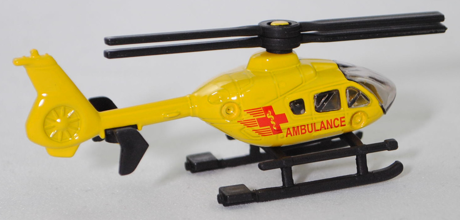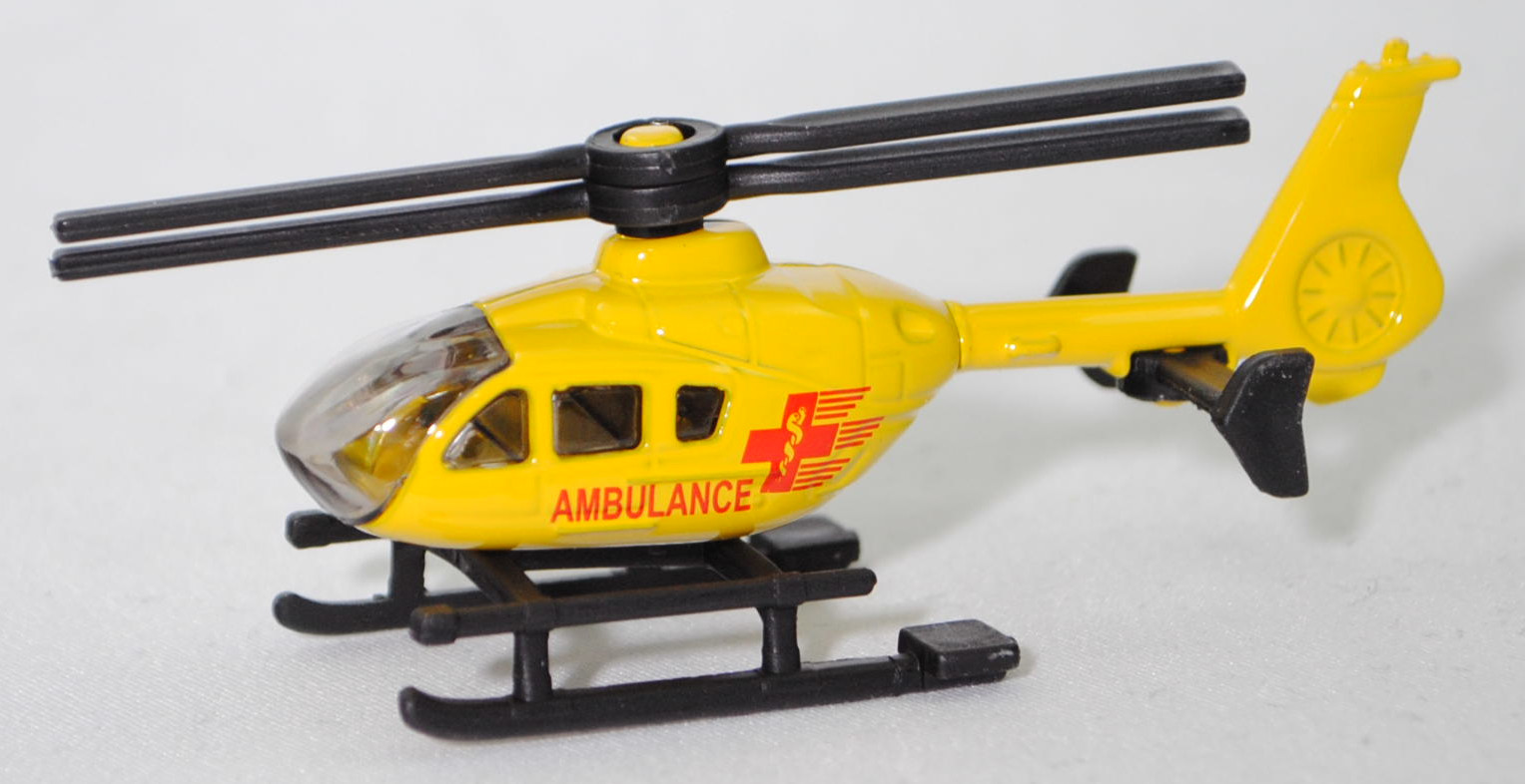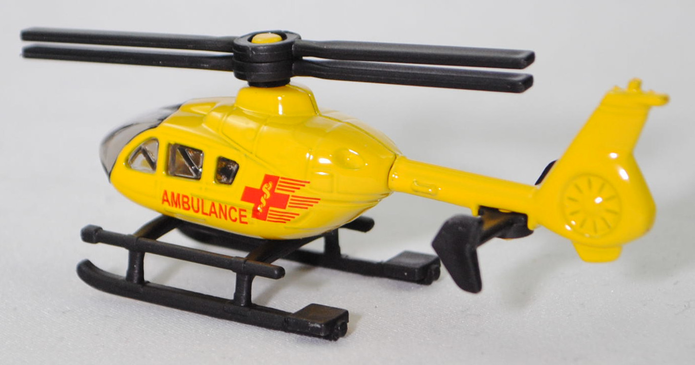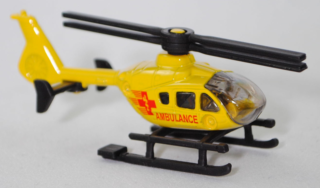00002 Rettungshubschrauber Eurocopter EC 135 T1 (1. Generation, Baureihe EC 135, Modell 1996-2002), signalgelb, AMBULANCE und Kreuz mit Äskulap Stab, SIKU SUPER, 1:144, P29f
