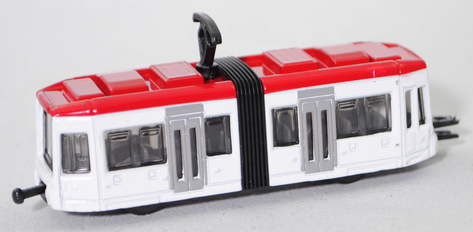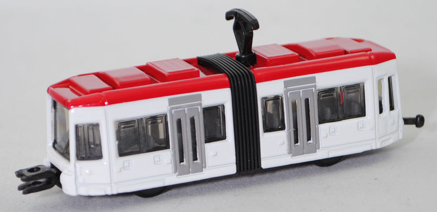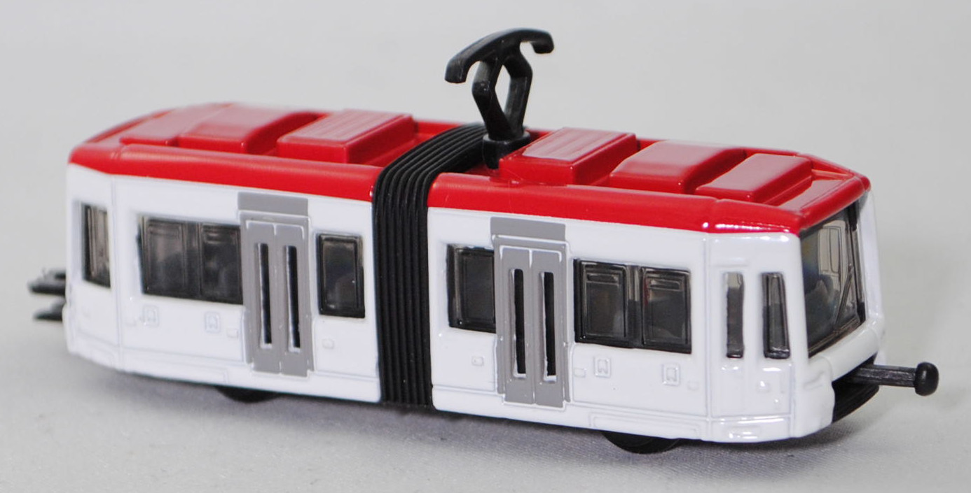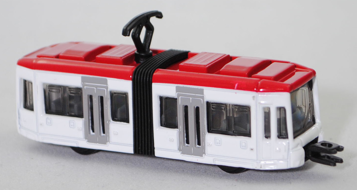 00002 Zweiteilige Niederflurstraßenbahn BOMBARDIER FLEXITY Classic, dunkel-verkehrsrot/reinweiß, mittige Türen hell-verkehrsgrau, innen basaltgrau, Sitze basaltgrau, Stromabnehmer schwarz, Kupplung mit seitliche Führungen, Bpr. mit Adresse mittig hinter der Vorderachse und siku-Logo dahinter, CE-Zeichen mittig vor der Hinterachse, Druck Chargennummer und Made in China links auf dem Chassis, Schienenräder schwarz, SIKU SUPER, P29f (EAN 4006874010110)