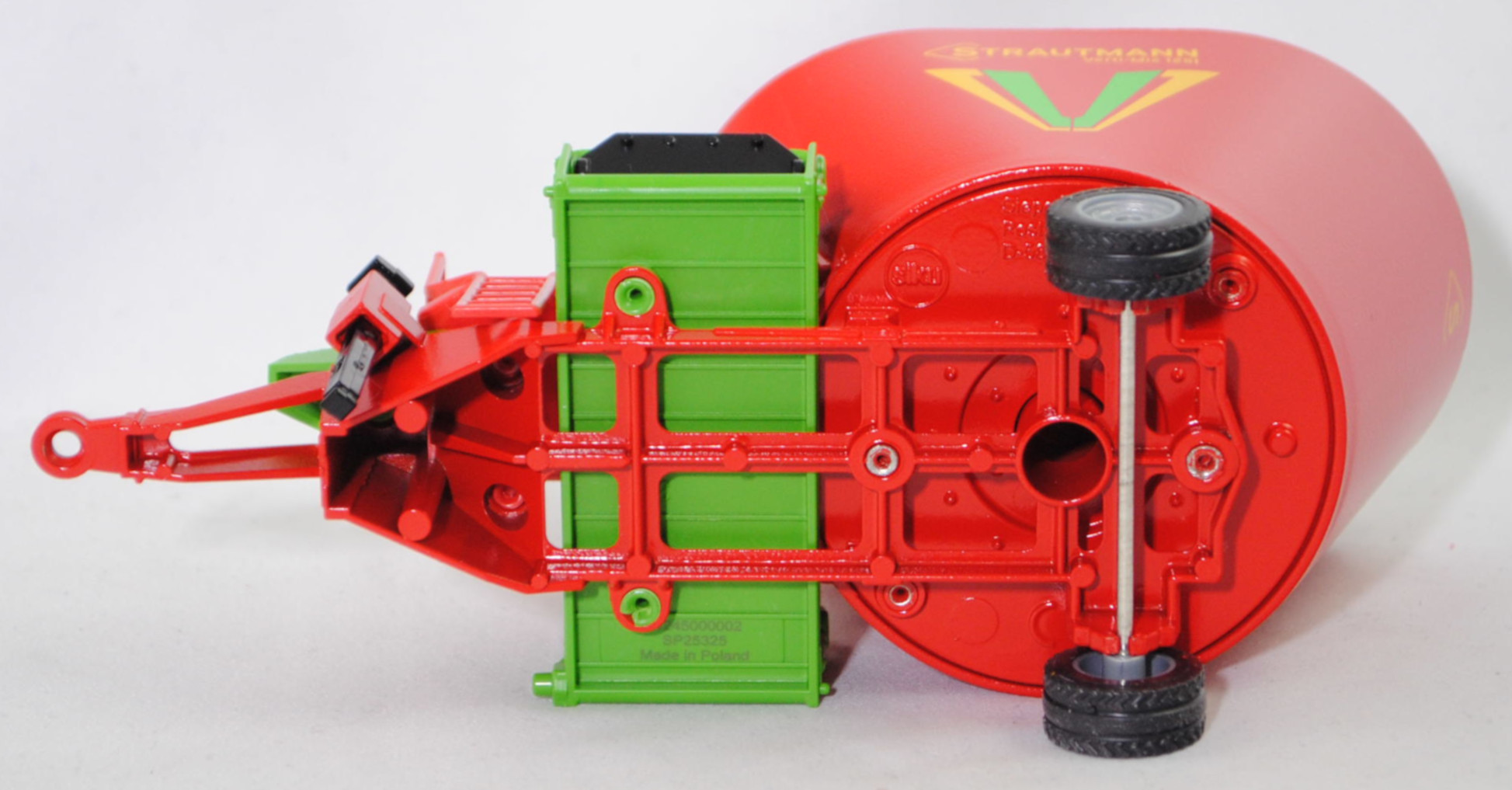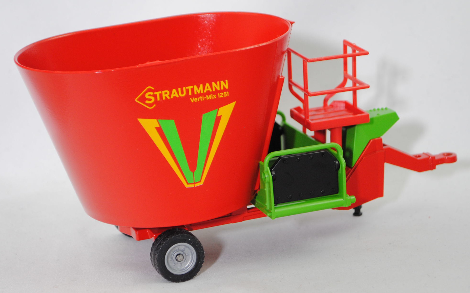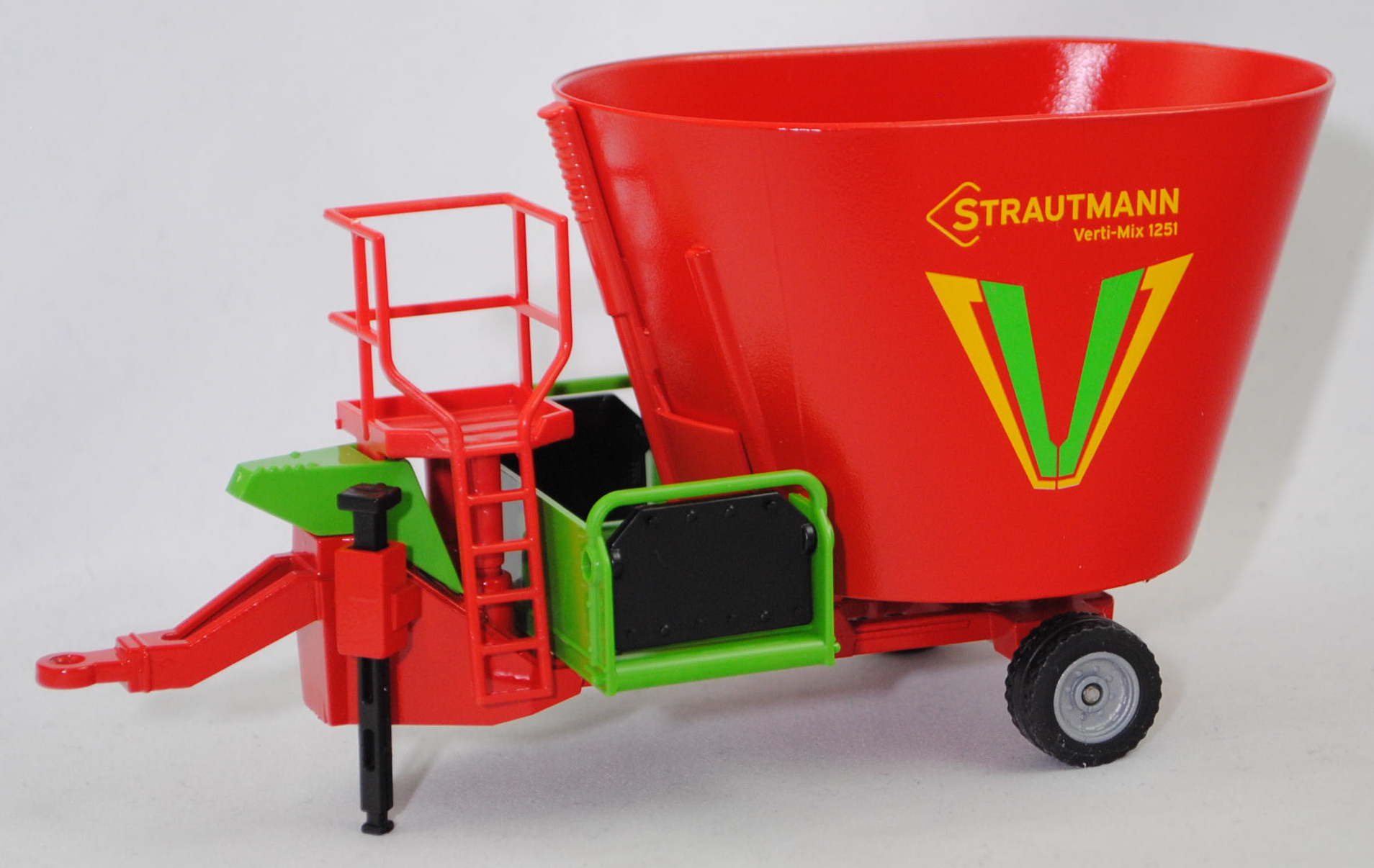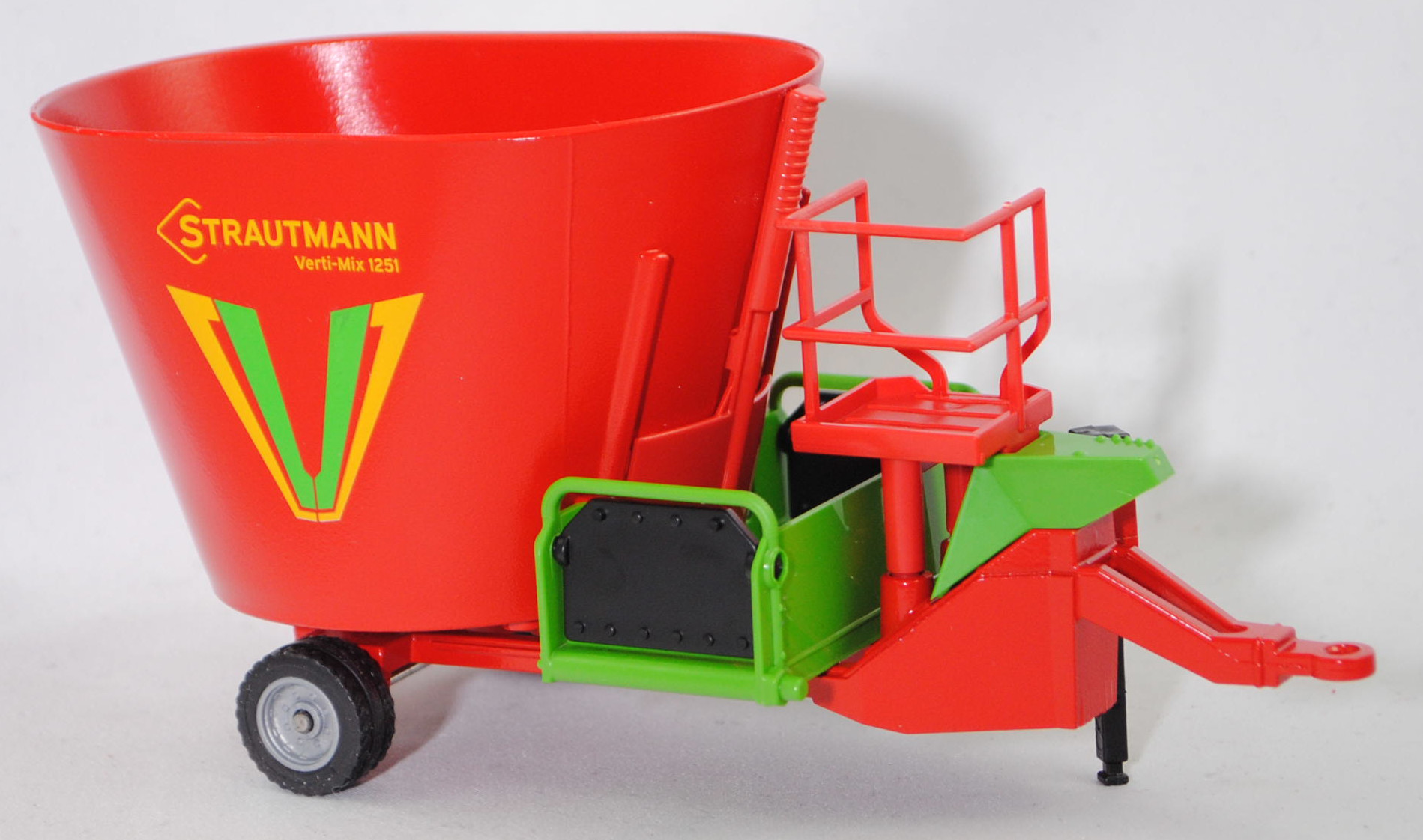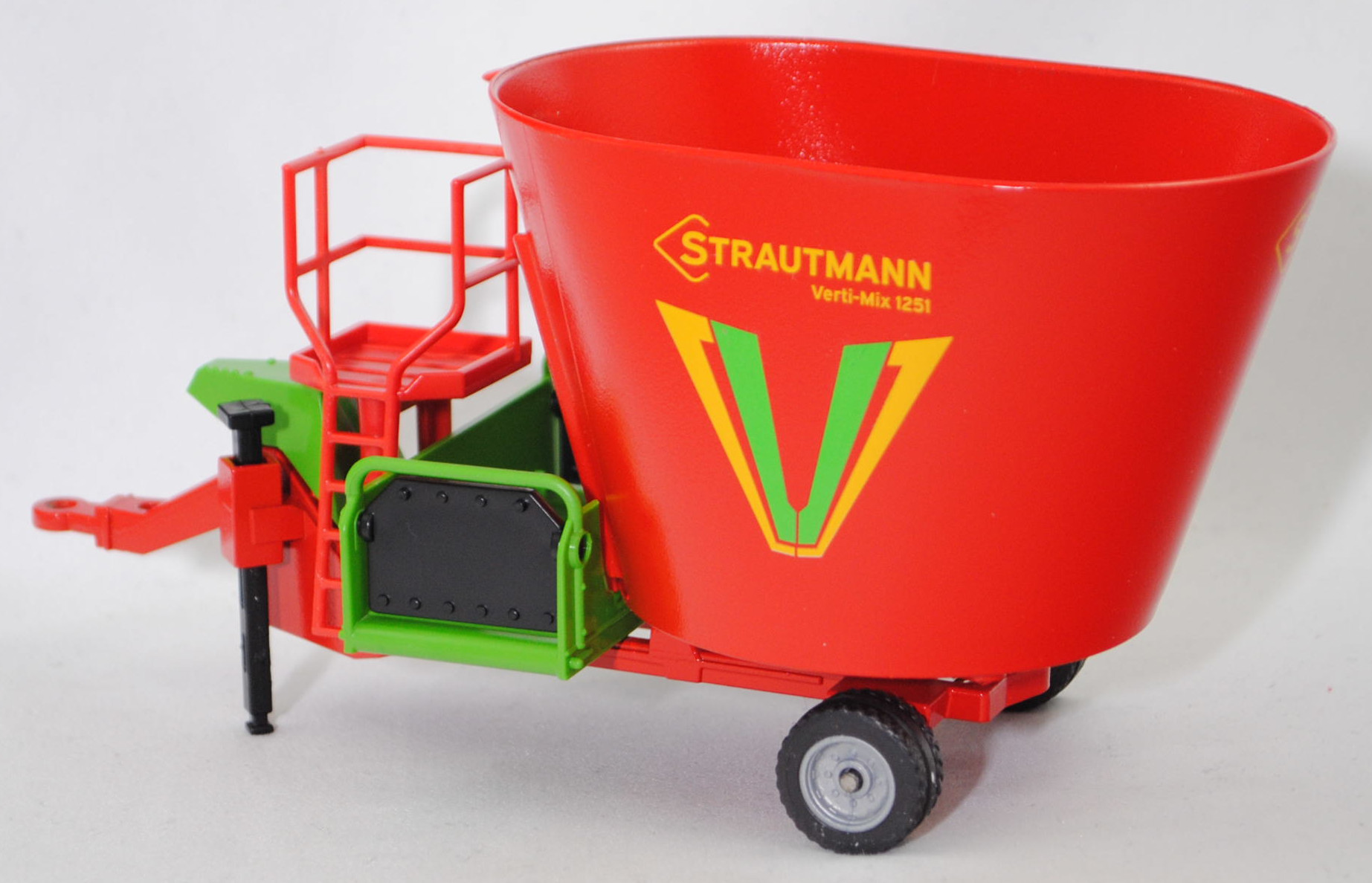 00002 strautmann Verti-Mix 1250 Futtermischwagen (Baureihe Verti-Mix, 1 vertikale Variomischschnecke, nutzbares Mischvolumen 12,5 m³, Hersteller: B. Strautmann & Söhne GmbH Bielefelder Straße 53 49196 Bad Laer, Eigengewicht mit Querförderband 4150 kg, zulässiges Gesamtgewicht 9000 kg, Breite mit Querförderband 2415 mm, Länge mit Querförderband vorne 5645 mm), Behälter verkehrsrot, Druck STRAUTMANN / Verti-Mix 1251 in signalgelb und Streifen als V in signalgelb/gelbgrün (Design ab 2024) auf den Seiten des Behälters, Druck S in signalgelb hinten auf dem Behälter, Aufstiegsleiter mit Podest verkehrsrot, Querförderband gelbgrün, Wippe schwarz, Stützfuß schwarz, Bpr. siku-Logo un Adresse links vor dem Rad auf dem Boden des Behälters, Bpr. CE-Zeichen rechts vor dem Rad auf dem Boden des Behälters, Druck Chargennummer rechts unter dem Querförderband, LKW41 silbergrau (Bereifung 8.15-15 14 PR), SIKU FARMER 1:32, ca. 1:31, L16nmp (EAN 4006874024506)