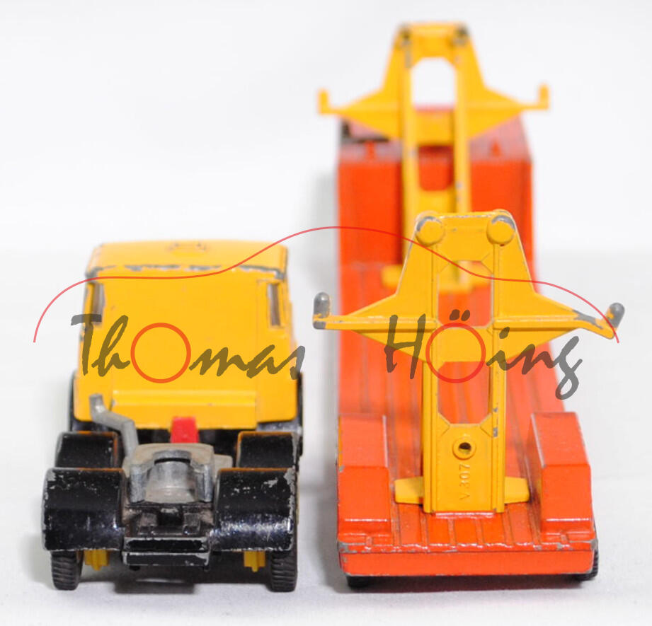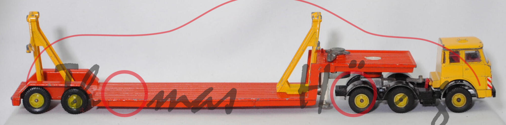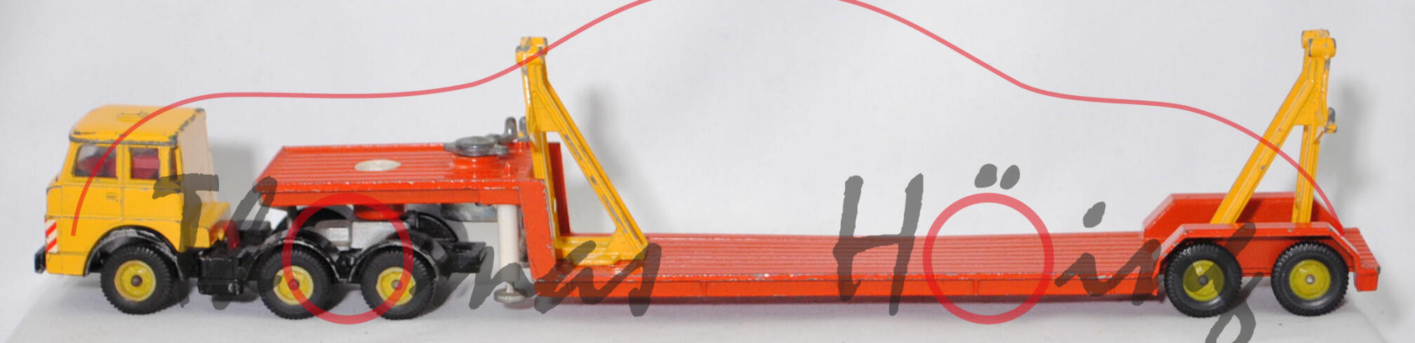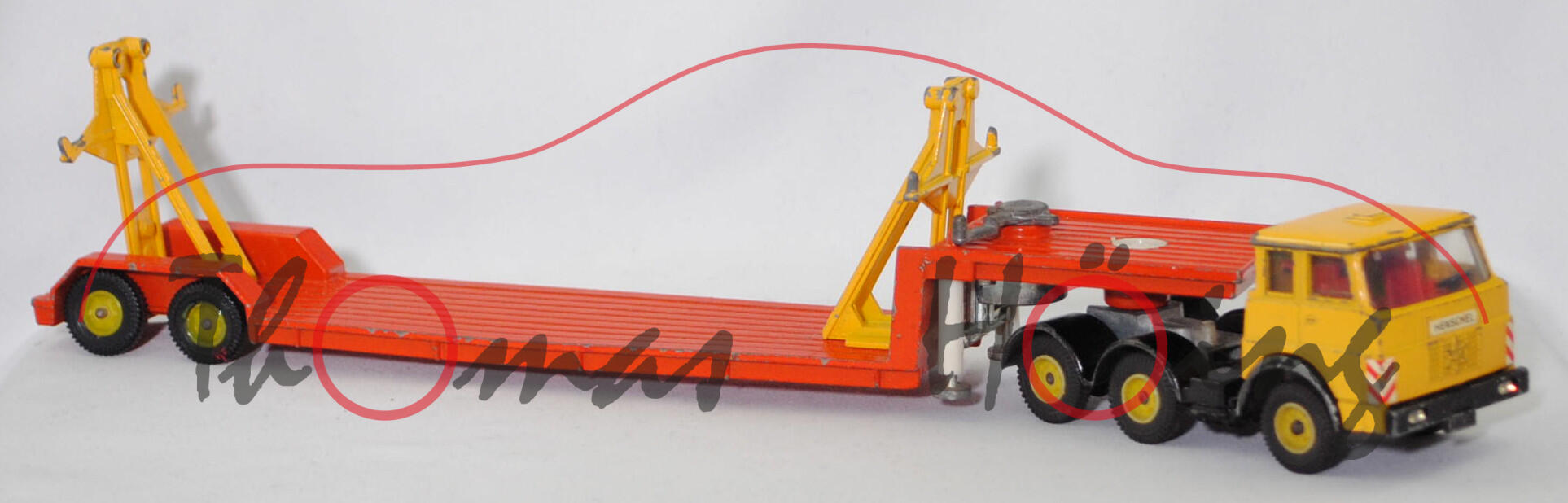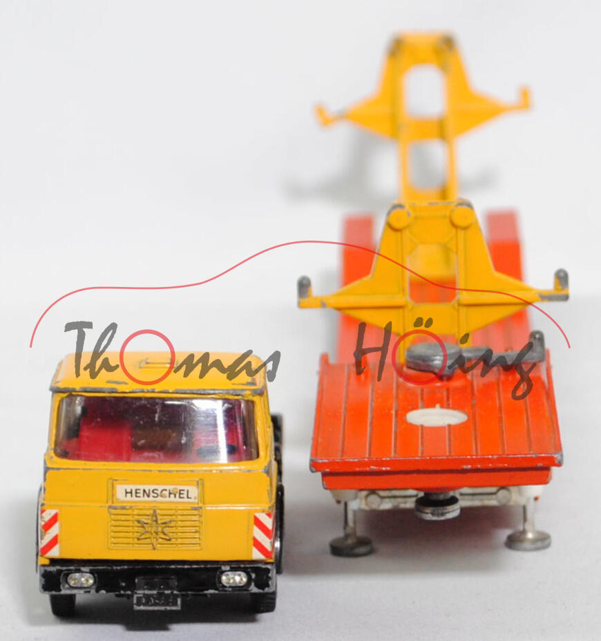 00002a Henschel F 201 S-2A mSk (3. Generation Frontlenker, Baureihe Frontlenker, interne Baureihenbezeichnung 504, Typ: schwerer Frontlenker (F), zulässiges Gesamtgewicht 20000 kg (20.), dreiachsige Sattelzugmaschine mit 2 Lenkachsen und 2 Antriebsachsen (S-2A), Fahrerhaus mit Schlafkabine und 2 Schlafliegen (mSk), Vorfacelift, Schriftzug HENSCHEL vorne mittig auf dem Fahrerhaus, Front des Fahrerhauses glatt mit schmalem Kühlergrill, Logo HENSCHEL als sechszackiger Stern im Kühlergrill, 6-Gang-Getriebe mit ZF AK 6-80 Allklauenschaltung und Overdrice, Antrieb über beide Hinterachsen, Motor: Henschel Typ 523 Baureihe 6R 1315-23 U stehender wassergekühlter Sechszylinder-Reihen-Viertakt-Diesel mit Bosch Direkteinspritzung und eine zahnradgetriebene zentrale Nockenwelle sowie OHV-Ventilsteuerung (OHV = overhead valves) und 3 hängende Ventile pro Zylinder sowie 11943 cm³ und 230 PS, Radstand 2300 + 1310 mm, Länge 6010 mm, Modell 1967-1969) Sattelzug ohne Ladegut, Sattelzugmaschine: Fahrerhaus signalgelb, innen verkehrsrot, Sitze verkehrsrot, Lenkrad schwarz, Fahrerhaus mit Dachentlüftung, Abziehbild HENSCHEL in schwarz auf reinweiß vorne mittig auf dem Fahrerhaus über dem Kühlergrill, Prägung Hanomag-Stern mittig im Kühlergrill, Abziehbild Warnschraffur in rot/weiß vorne auf den Fahrerhausecken, separat eingesetzte Glasfacetten-Frontscheinwerfer (Fac), Nummernschildprägung BO-A6 vorne unter der Stoßstange, Halterung Fahrerhaus verkehrsrot, Stoßstange schwarz, Fahrgestell schwarz, Vollnieten, Germ, Verglasung klar, Plastikfelgen schwefelgelb mit mittelgroßen Gummireifen (Henschel Stahlscheibenräder mit Schrägschulterfelgen Größe 8,0-20 und Reifen 11.00-20 (Lenkachse 1 und 2 mit jeweils 2 Reifen sowie Hinterachse mit 4 Reifen)); Sattelauflieger: Tieflader reinorange, Hydraulikstempel reinweiß, Garagenhalterung signalgelb, Garagenhalterung am Fuß und am unteren senkrechten Steg mit jeweils einem geschlossenen Loch, 2 runde Metall-Haltestangen oben an den Garagenhalterungen weg, 2 breite Metall-Haltebalken außen an den Garagenhalterungen zur Ladungssicherung weg, Bpr. V 307, Germ, hintere Achshalterung vom Auflieger vorne mit geschlossenem Loch, Plastikfelgen schwefelgelb mit mittelgroßen Gummireifen; ohne Ladegut, SIKU-SUPER-ZINKGUSS 1:60 (V-SERIE), ca. 1:58, sc (Modell mit Farbabplatzer, 2 Gummireifen beim LKW weg, Metall-Haltestangen und breite Metall-Haltebalken weg, Sattelauflieger nicht original zur Zugmaschine, Ladegut fehlt, Bauanleitung weg) (EAN 4006874003075)