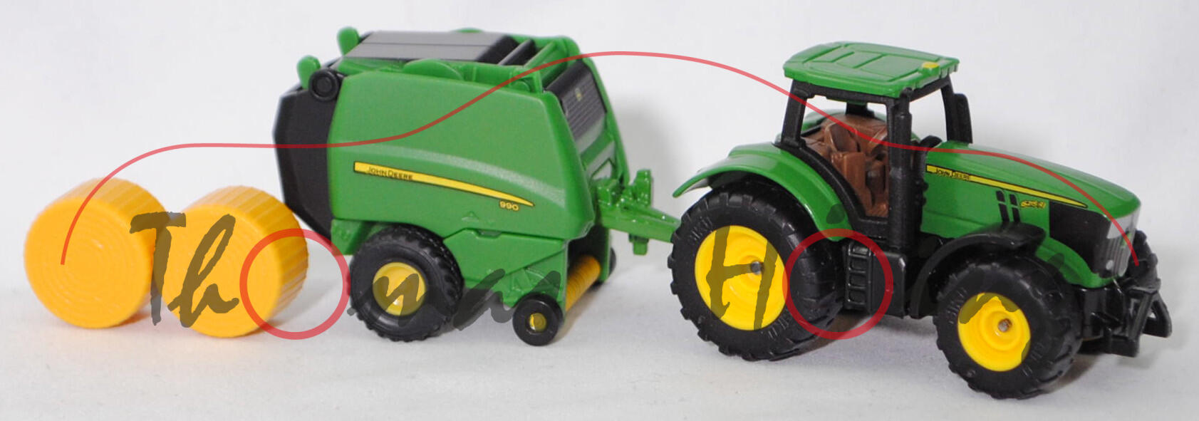 00003 John Deere 6215R ULTIMATE (2. Generation, Baureihe Serie 6R, Typ Traktor mit großem Rahmen, Einführung der SCR-Technologie (selektive catalytic reduction, Abgasreinigung bzw. Reduktion von Stickoxiden in Abgasen), Ausstattungslinie ULTIMATE: Auto-Powr-Getriebe mit CommandPRO und CommandCenter 4600, Leergewicht 8500 kg, zulässiges Gesamtgewicht 13450 kg, Auto-Powr-Getriebe mit zwei Fahrbereichen, elektrohydraulich zuschalbarer Allradantrieb, Motor: John Deere PowerTech PVS Typ 6068HL501B nach Abgasstufe IV (Tier 4 final, 2014-2018) bzw. Abgasstufe V (2018-2022) wassergekühlter Sechszylinder-Reihen-Viertakt-Diesel und Abgasturbolader (ATL) mit variabler Turbinen-Geometrie (VTG) sowie Hochdruck-Common-Rail-Einspritzung und eine zentrale Nockenwelle sowie OHV-Ventilsteuerung (Overhead valve engine) und 4 Ventile pro Zyliner sowie Ladeluftkühler und 6788 cm³ sowie 215 PS (Nennleistung ohne IPM ( intelligent Power Management) bzw. 255 PS (Nennleistung mit IPM ( intelligent Power Management) oder 237 PS (Maximalleistung ohne IPM ( intelligent Power Management) bzw. 259 PS (Maximalleistung mit IPM ( intelligent Power Management), Radstand 2800 mm, Länge 5050 mm, Modell 2014-2022) Traktor mit John Deere Rundballenpresse 990 mit variabler Kammer (Baureihe Serie 900, Aufnahmebreite Pickup 2200 mm, Feinschnitt-Scheidwerk MaxiCut HC 25 mit 25 Messern, Schnellauswurfsystem, Gewicht 4500 kg, Transportbreite mit Bodenführungsrädern 2720 mm, Gesamtlänge 5320 mm, Modell 2011-2017), Traktor: Motorhaube smaragdgrün, innen blaßbraun, Sitze blaßbraun, Lenkrad blaßbraun, Druck JOHN DEERE / 6215R in schwarz/schwefelgelb und Streifen in schwefelgelb/schwarz auf den Seiten der Motorhaube, Dach der Kabine smaragdgrün, Fensterrahmen mattschwarz, GPS auf Kabine zinkgelb, Kühlergrill mattschwarz mit Druck John Deere-Logo in smaragdgrün/zinkgelb, Frontscheinwerfer silber, Kotflügel vorne mattschwarz, Kotflügel hinten smaragdgrün, Frontkraftheber mattschwarz, Chassis mit Anhängerkupplung (AHK) schwarz, Bpr. Adresse im Bereich der Vorderachse und siku hinter der Hinterachse, Druck Chargennummer mittig auf dem Chassis, C77 zinkgelb / C78 zinkgelb (Bereifung vorne 600/70 R 30 und hinten 800/70 R 38), ca. 1:76; Rundballenpresse: Ballenkammer smaragdgrün, Druck JOHN DEERE / 990 und Streifen in zinkgelb/schwarz auf den Seiten der Presse, Zinkenreihe zinkgelb mit schwarzen Rädern an den Enden, Gitter vorne an der Ballenkammer schwarz mit Druck John Deere-Logo in zinkgelb/smaragdgrün, Druck Antriebsriemen oben auf der Presse schwarz, Ballenauswerferklappe schwarz mit Druck John Deere-Logo in zinkgelb/smaragdgrün, ohne Bpr. 1473, Druck Teil der Chargennummer unter der Achse auf dem Chassis, C62 zinkgelb (Bereifung 500/60 R 22,5, Durchmesser 1185 mm), Zubehör: 2 Heuballen in honiggelb, ca. 1:75, SIKU SUPER, P29f (EAN 4006874016655)