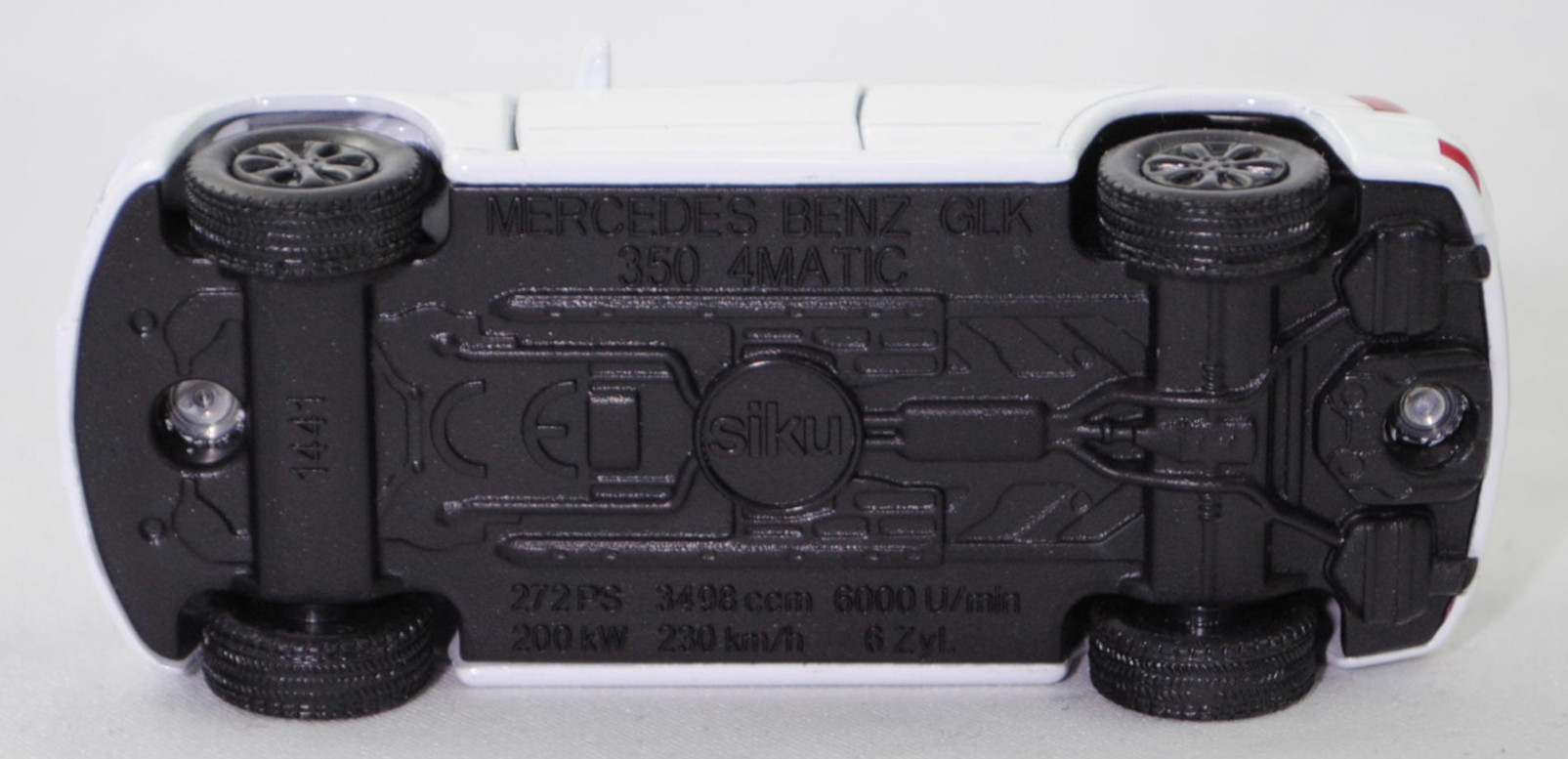 00003 Mercedes-Benz GLK 350 4MATIK (1. Generation, Baureihe GLK, interne Baureihenbezeichnung X 204, fünftüriger SUV (Sport Utility Vehicle) mit 5 Sitzplätzen, Konstruktionsbezeichnung X 204 E 35 4, Baumuster 204.987, Vertrieb in Deutschland bis 2011 und als Exportmodell bis 2012, Vor-MoPf (vor Modellpflege, Vorfacelift), Hauptscheinwerfer als Halogen-Scheinwerfer mit separaten Halogenlampen für Abblendlicht und Fernlicht, Kühlergrill mit drei Lamellen, Stoßfänger vorne mit rautenförmigen Einsatz außen und integrierten runden Nebelscheinwerfern sowie trapezförmigem Lüftungsgitter mittig wobei die längere Trapezseite an der Oberseite angeordnet ist, Stoßfängerunterseite mit integriertem Unterfahrschutz vorne glatt ohne Profilierung, Rückfahrscheinwerfer breit und mittig angeordnet, hohe Rückstrahler im hinteren Stoßfänger mit kurzem Übergang zur Seite kurz über den Auspuffendrohren angeordnet, Stoßfänger hinten mit gerade verlaufender Abschlusskante unten, Auspuffendrohren unterhalb des Stoßfängers angeordnet, Ausstattungslinie Grundmodell: Klarglas-Halogenscheinwerfer mit Projektionstechnik + Nebelscheinwerfer und Nebelschlussleuchte mit Klarglasabdeckung + Lufteinlass mit silbernen Lamellen + Außenspiegel links und rechts beheizt, von innen elektrisch einstellbar + Blinkleuchten in den Außenspiegeln + Türgriffe in Wagenfarbe lackiert + Kombiinstrument mit 3 analogen Rundinstrumenten und Display + Blinker mit Komfort-Tipp-Schaltung + Parameterlenkung + Sonnenblenden mit beleuchtetem Make-up-Spiegel + Handschuhkasten beleuchtet, klimatisier- und abschließbar + Ablagefach und Doppelcupholder in der Mittelkonsole + Armauflage vorne seitlich klappbar mit Ablagefach + Vordersitze mit elektrischer Höhen- und Lehnenverstellung, mechanischer Sitzkissenneigungsverstellung und Fahrersitz mit mechanischer Lordosenstütze + Polsterung Stoff Boston + Kartentaschen an Fahrer- und Beifahrerlehne + Einstiegsschienen vorne und hinten, vorne mit Schriftzug Mercedes-Benz + Seitenschweller schwarz genarbt + 3. Bremsleuchte in LED-Technik + Heckscheibenwischer mit automatischer Zuschaltung bei Rückwärtsfahrt + Leichtmetallräder im 7-Speichen-Design Größe 7,5 J x 17 ET 47,5 mit Reifen 235/60 R 17, 7G-Tronic (7-Gang-Automaikgetriebe), permanenter Allradantrieb 4MATIC, Motor: Mercedes-Benz Typ M 272 E 35 wassergekühlter Sechszylinder-V-Viertakt-Otto mit mirkoprozessorgesteuerter Einspritzung mit Heißfilm-Luftmassenmessung und zwei obenliegende Nockenwelle (DOHC = Double Overhead Camshaft) je Zylinderreihe sowie 4 Ventile pro Zylinder und 3498 cm³ sowie 272 PS, Baumuster Motor 272.971, Radstand 2755 mm, Länge 4528 mm, Modell 2008-2012), reinweiß (vgl. calcitweiß beim Original, Farbcode 650 bzw. 9650), innen schwarzgrau, Sitze schwarzgrau, Lenkrad schwarzgrau, Lamellen und Mercedes-Benz-Stern im Kühlergrill silber, Druck Mercedes-Benz-Stern und GLK 350 / 4MATIC in schwarz auf der Heckklappe, Bpr. 1441 unter der Vorderachse und CE-Zeichen mittig hinter der Vorderachse sowie siku-Logo mittig auf dem Chassis, B45 schwarz (Mercedes-Benz Leichtmetallräder im 7-Speichen-Design (Code R44) Größe 7,5 J x 17 ET 47,5 mit Lochkreis 5 x 112 (Teilenummer A 204 401 59 02, Farbcode silber) und Nabendeckel / Radzierdeckel (Teilenummer A 171 400 00 25, Farbcode silber mit Rand in royalblau (Farbcode 5337) sowie Stern in der Mitte und Lorbeerkranz außen) sowie Reifen 235/60 R 17 102V), SIKU SUPER, ca. 1:55, m (Vitrinenmodell) (EAN 4006874014415)
