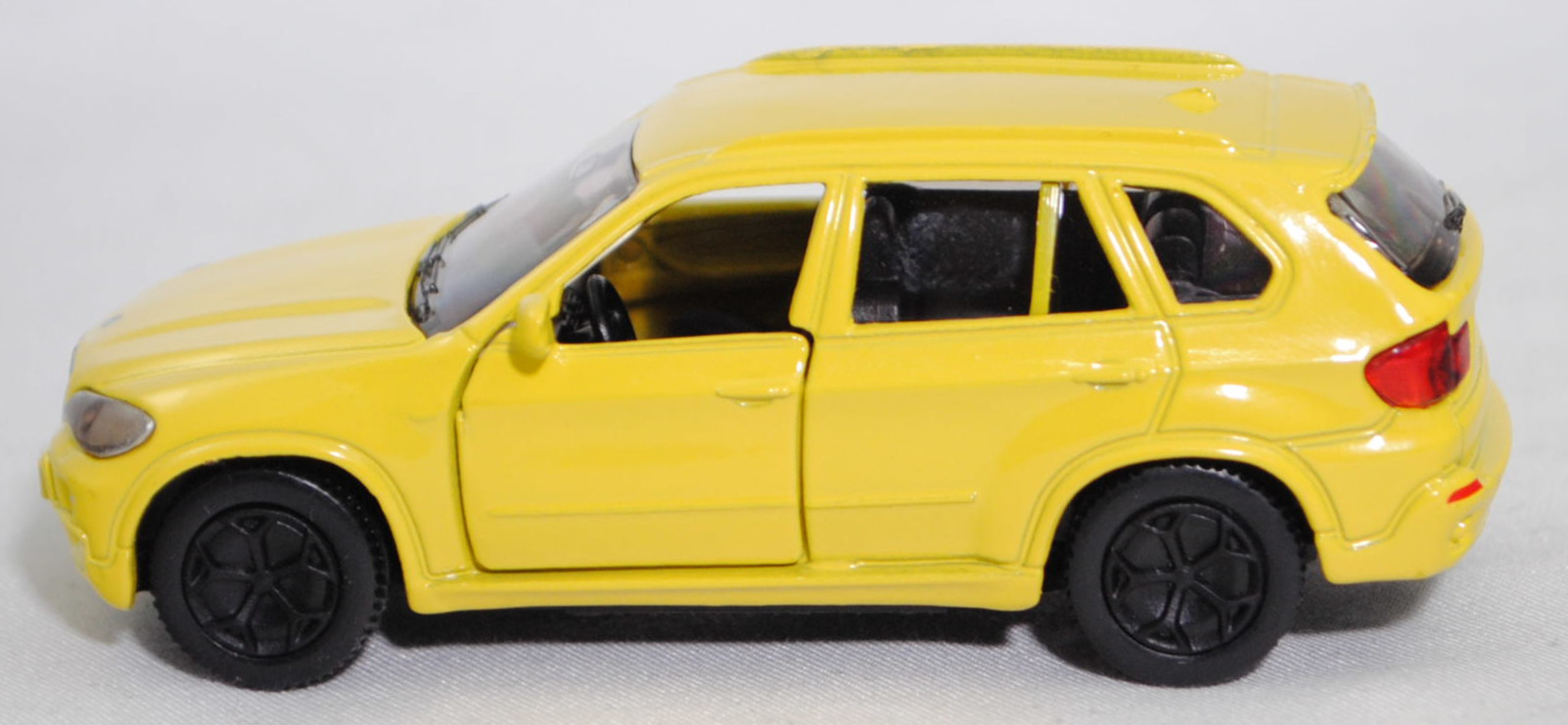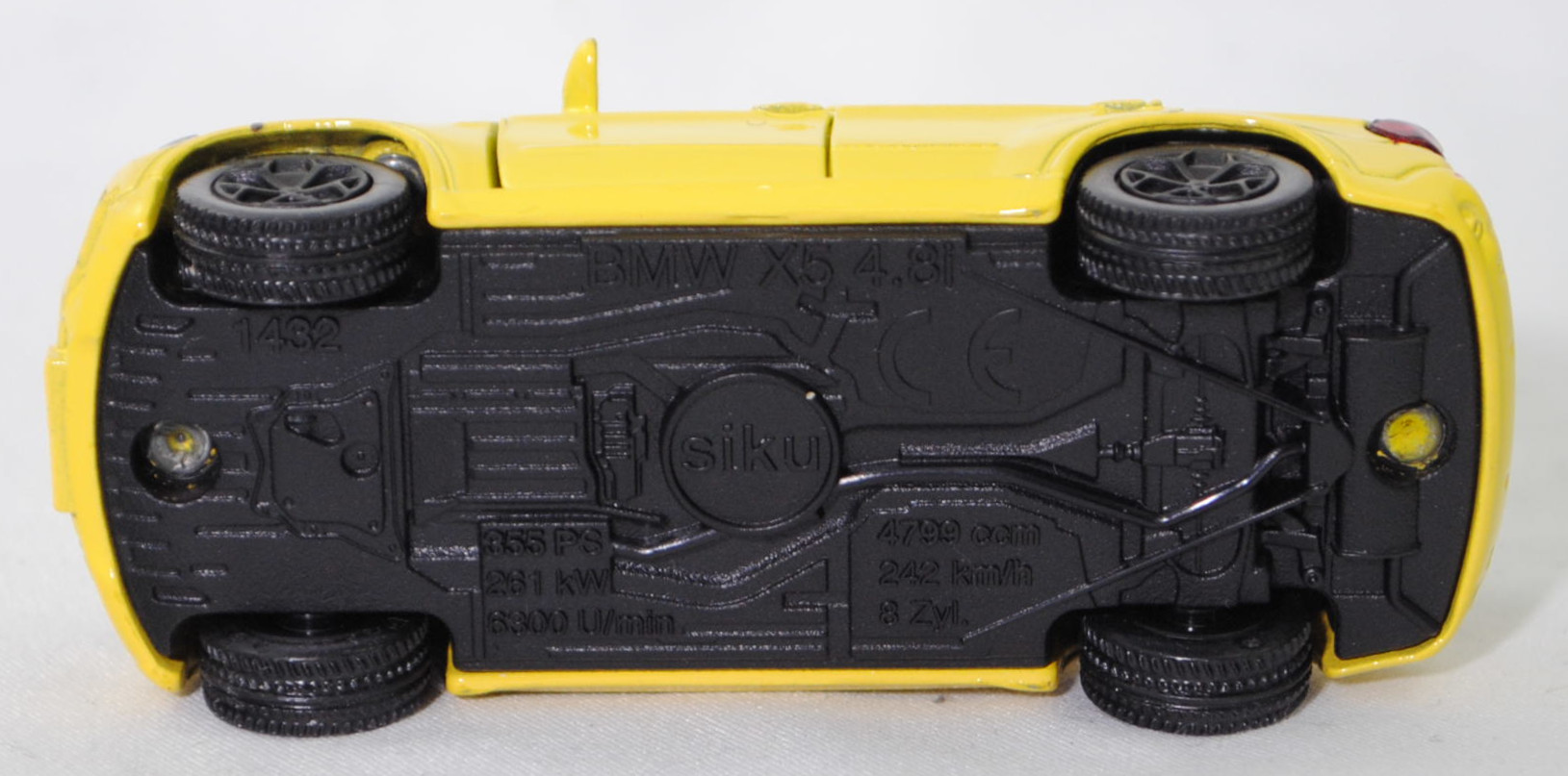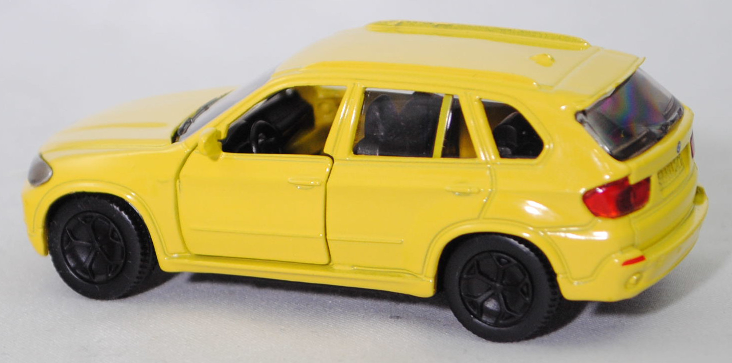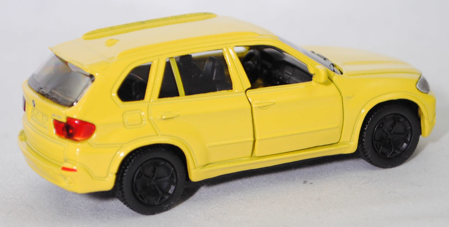 00004 BMW X5 3.0si / xDrive30i (2. Generation, Baureihe X5, interne Baureihenbezeichnung E70, fünftüriges Sport Utility Vehicle (SUV) mit 5 Sitzplätzen, Vorfacelift (vor LCI = vor Life Cycle Impulse bzw. vor Modellpflegemaßnahmen), Frontziergitter mit Nieren-Längsstreben in schwarz mit Chromeinfassung, Front- und Heckschürze nur im oberen Bereich in Wagenfarbe lackiert, breite flache Lüftungsöffnungen unten außen im Stoßfänger, mittlere Lüftungsöffnung im Stoßfänger nur bis auf halber Nummernschildhöhe geführt, runde Nebelscheinwerfer in trichterförmiger Aussparung im Stoßfänger, Stoßfänger hinten durchgehend ohne angedeuteten Diffusor, 2 runde Edelstahl-Auspuffendrohre je eins rechts und links, Ausstattungslinie 3.0si / xDrive30i: Halogen-Scheinwerfer + Nebelscheinwerfer + Frontziergitter mit Nieren-Längsstäben in schwarz, mit Chromeinfassung + Sechszylinder-Motor mit 2996 cm³ und 272 PS + 6-Gang-Automatic-Getriebe und elektronischem Gangwahlschalter inkl. Steptronic und adaptiver Getriebesteuerung + Außenspiegel asphärisch beheizt und elektrisch einstellbar + Innenspiegel automatisch abblendend + Interieurleisten Graphitan matt + Lederlenkrad im 3-Speichen Design mechanisch längs- und höhenverstellbar + Klimaautomatik + Sitzverstellung teilelektrisch für Fahrer und Beifahrer + Polsterung Stoff Twill + Fensterrahmenleiste in schwarz matt + Dachspoiler inkl. dritter Bremsleuchte + Heckklappe zweiteilig, Oberteil nach oben zu öffnen, Heckklappenunterteil manuell entriegelbar, Unterteil auf Ladekantenniveau abklappbar + Heckscheibenwischer + 2 Auspuffendrohre (je eins rechts und links), Edelstahl, rund + Leichtmetallräder Sternspeiche 209 Größe 8,5 J x 18 mit Reifen 255/55 R 18 Runflat, 6-Gang-Automatikgetriebe, Allradantrieb, Motor: BMW Typ N52B30 wassergekühlter Sechszylinder-Reihen-Viertakt-Otto mit Saugrohreinspritzung und zwei obenliegende Nockenwellen (DOHC = Double Overhead Camshaft) sowie 4 Ventile pro Zylinder und 2996 cm³ sowie 272 PS, Radstand 2933 mm, Länge 4854 mm, Modell 2006-2008 als X5 3.0si bzw. 2008-2010 als X5 xDrive30i), zinkgelb, innen schwarz, Sitze schwarz, Lenkrad schwarz, Bpr. 1432 beim linken Vorderrad,ohne Bpr. Licensed by / BMW beim rechten Vorderrad, Bpr. ohne Adresse, ohne Chargendruck auf dem Chassis, B41 schwarz (BMW Leichtmetallräder Sternspeiche 209 (5-Speichen-Design) Größe 8,5 J x 18 ET 46 mit Lochkreis 5 x 120 (Teilenummer 36 11 6 770 200, Farbe silber) und Nabenabdeckung (Ø 67 mm mit Chromrand, Teilenummer 36 13 6 783 536) sowie Reifen 255/55 R 18 109V Runflet), SIKU SUPER, ca. 1:58, m (Vitrinenmodell) (EAN 4006874014323)