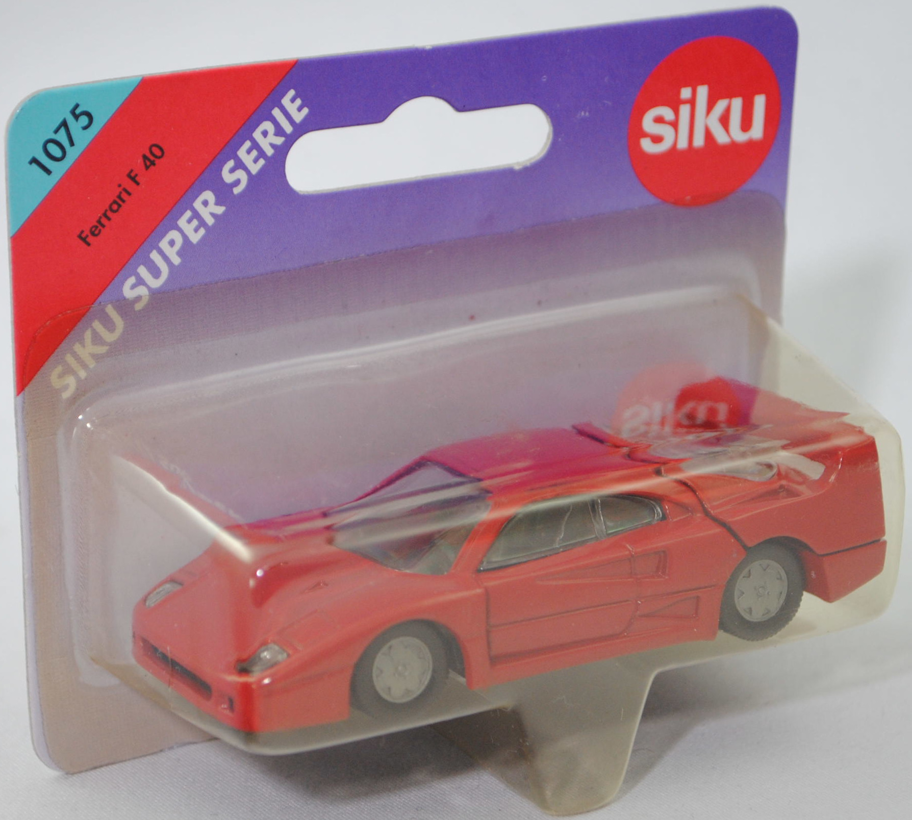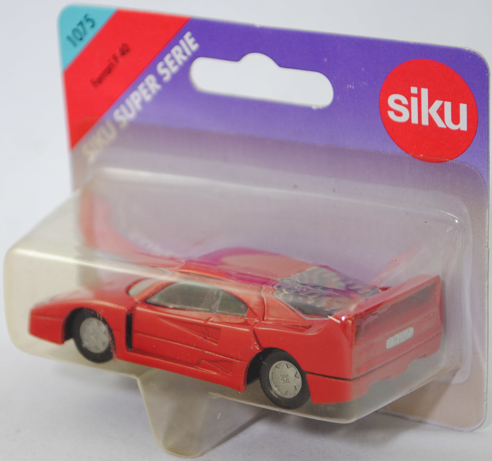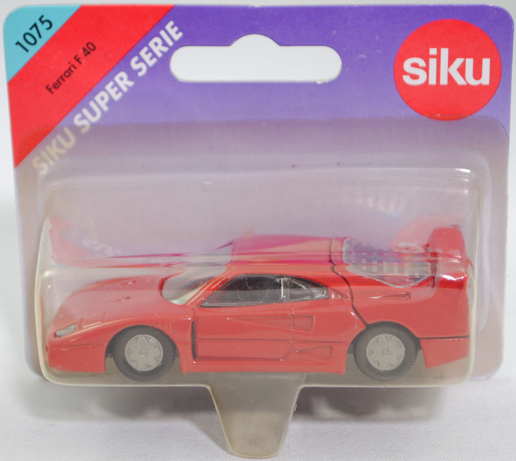 00004 Ferrari F40 (1. Generation, Baureihe F40, interne Baureihenbezeichnung Typ F120, zweitüriger Supersportwagen als Coupé mit 2 Sitzplätzen, Fahrzeug zum 40-jährigen Firmenjubiläum und bestehen des Cavallino Rampante (springendes Pferd), F40: F = Ferrari und 40 = 40. Jahrestag des ersten für den Straßemverkehr zugelassenen Ferrari, Chefingenieur für die Entwicklung Nicola Materazzi bei Ferrari, Design der Karosserie: Pietro Camardella unter der Leitung von Aldo Brovarone beim Designstudio Pininfarina S.p.A., produzierte Fahrzeuge: 1311 Stück, Ausstattungslinie F40: Rohre aus legiertem Stahl integriert mit Elementen aus Verbundwerkstoffen + Fahrgastzelle aus Stahlrohkonstruktion mit zusätzlicher Verbundwerkstoff-Konstruktion stabilisiert + Karosserie Berlinetta (Sportcoupé mit 2 Sitzplätzen) bestehend aus 11 Teilen + Innenraum mit Überrollbügel + mechanisches, längsliegendes Getriebe mit 5 Vorwärts- und 1 Rückwärtsgang sowie einem integrierten Lamellen-Sperrdifferential + längs montierter 90-Grad-V8-Mittelmotor mit 2936 cm³ und 478 PS + Panorama-Heckscheibe + über die gesamte Breite reichender Heckflügel + unabhängige Radaufhängung vorne und hinten + Zahnstangenlenkung + innenbelüftete Scheibenbremsen an allen 4 Rädern + mechanische Handbremse auf die Hinterräder wirkend mit unabhängigen Bremszangen + zweigeteilter 120-Liter-Treibstoffbehälter aus Gummi mit Dämpfungsmatte + zusammenschraubbare Leichtmetallfelgen vorne Größe 8 J x 17 mit Radialreifen Tubless Pirelli P Zero 245/40 ZR 17 bzw. hinten Größe 13 J x 17 mit Radialreifen Tubless Pirelli P Zero 335/35 ZR 17, synchronisiertes 5-Gang-Schaltgetriebe mit Mittelschaltung, Hinterradantrieb, Motor: Ferrari Typ F120A (ohne Katalysator) wassergekühlter Achtzylinder-V-Viertakt-Otto mit zwei wassergekühlte IHI-Turbolader und elektronische Weber-Marelli Einspritzung sowie zwei obenliegende Nockenwellen (DOHC = Double Overhead Camshaft) je Zylinderbank und 4 Ventile pro Zylinder sowie zwei Behr-Ladeluftkühler und 2936 cm³ sowie 478 PS, Radstand 2450 mm, Länge 4358 mm, Modell 1987-1992), karminrot (vgl. ähnlich rosso corsa beim Original, Farbcode FER 300/6), innen schwarz, Sitze schwarz, Lenkrad schwarz, Nummernschild hinten silber, Chassis schwarz, Hong, mit CE-Zeichen, Verglasung klar, B6 (Ferrari zusammenschraubbare zweiteilige Leichtmetallfelgen mit Zentralverschluss im Fünfspeichen-Design (Hersteller Speedline Typ SL 364) vorne Größe 8 J x 17 CH C = -1,4 mit Zentralverschluss (Teilenummer 134250, Fabcode silber) und Radialreifen Tubless Pirelli P Zero 245/40 ZR 17 bzw. hinten Größe 13 J x 17 CH C = 20 mit Zentralverschluss (Teilenummer 134255, Fabcode silber) und Radialreifen Tubless Pirelli P Zero 335/35 ZR 17), SIKU SUPER, ca. 1:56, P26 (Vitrinenmodell, Schachtel vergilbt und mit Lagerspuren) (EAN 4006874010752)