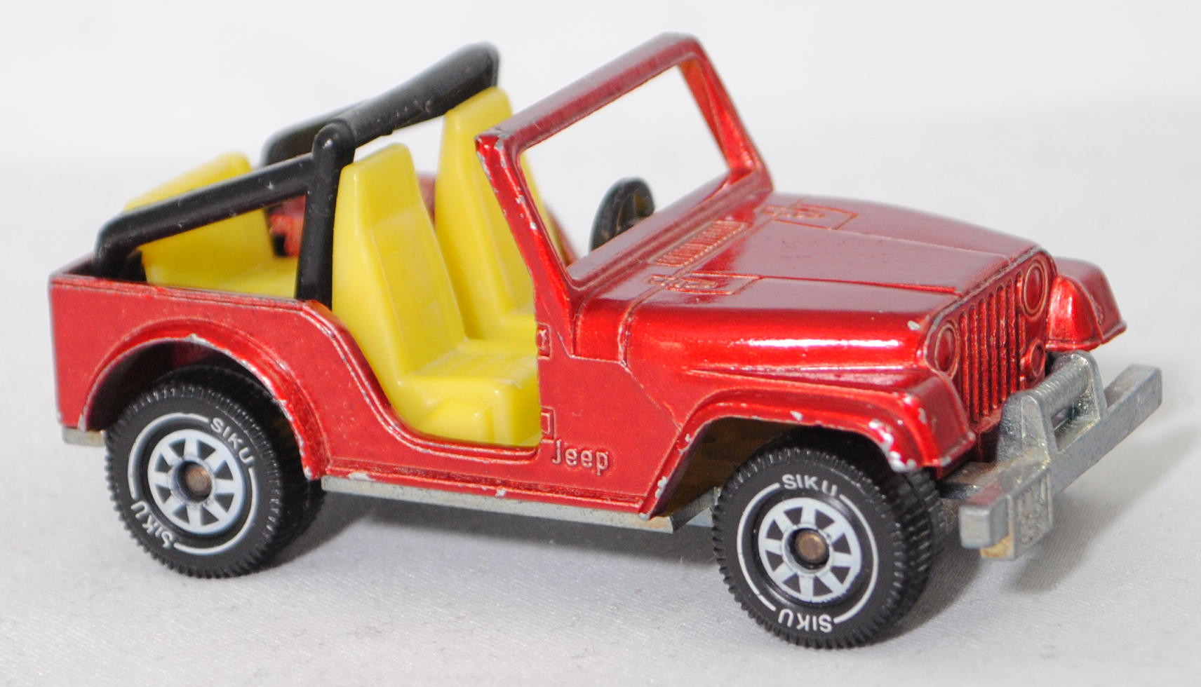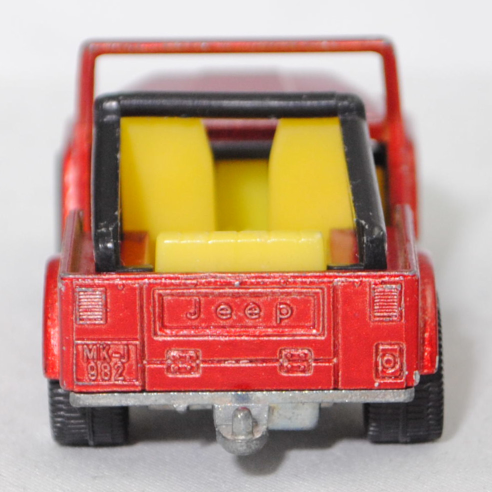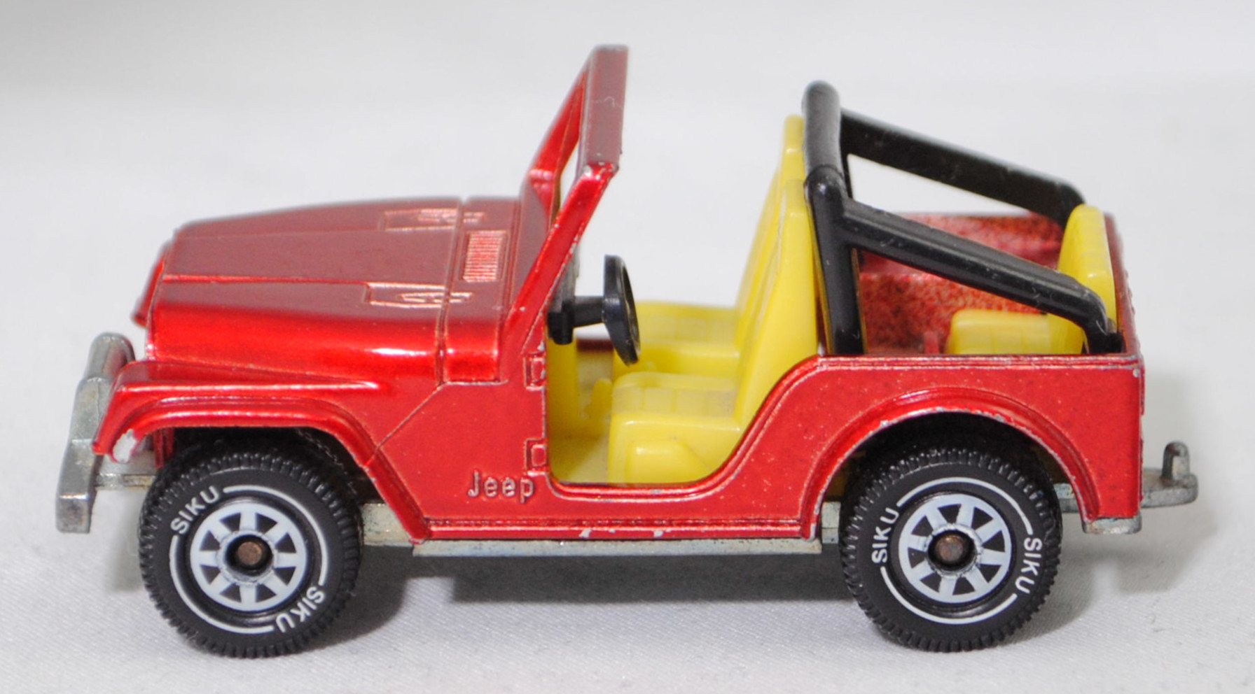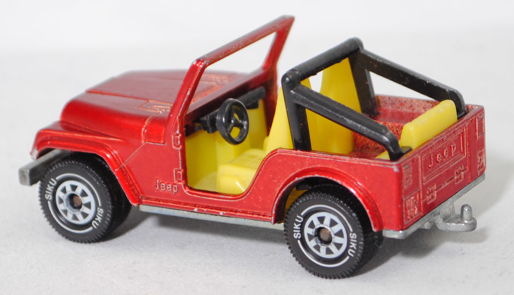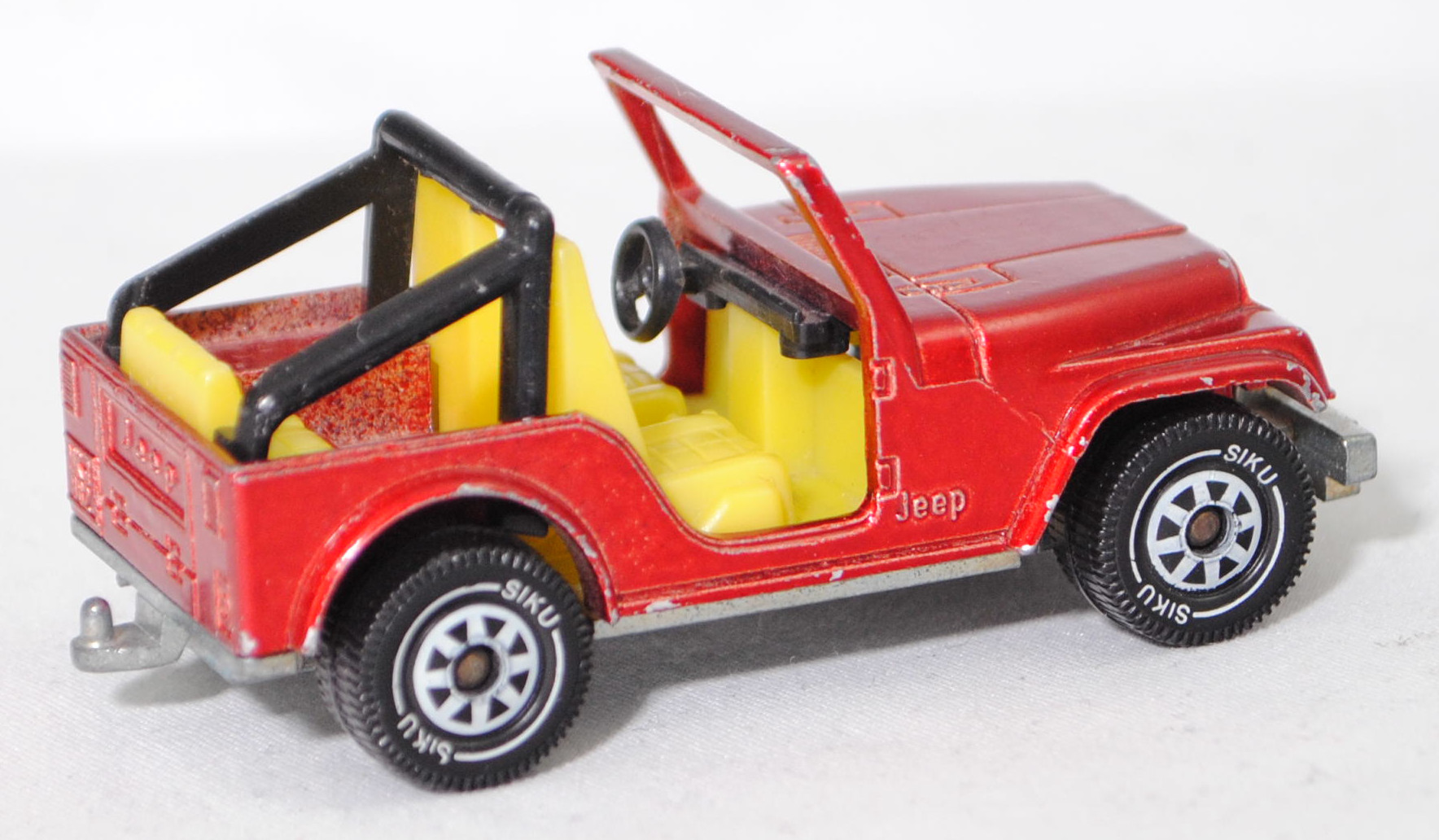 00004 Jeep CJ-5 2.5L (5. Generation, Baureihe Geländewagen der CJ-Serie, CJ = Civilian Jeep, zweitüriger Geländewagen mit 4 Sitzplätzen, kleine im hinteren Bereich abgerundete Türen, kurzer Radstand, ohne Softtop bzw. Fiberglas Hardtop, Änderungen 1979 zum Modelljahr 1980, Einbau des GM Iron Duke Vierzylinder-Reihenmotors, Ausstattungslinie CJ Grundausstattung: H4-Scheinwerfer + Doppelstoßstange vorne lackiert + 2,5 Liter (151 CID) 4-Zylinder-Benzin-Motor mit 88 PS + Außenspiegel auf der Fahrerseite + Innenspiegel 20,3 cm + gepolsterte Sonnenblenden + Beifahrerhaltegriff + energieabsorbierende Lenksäule mit Diebstahlsicherung + elektrische Scheibenwaschanlage und elektrische Scheibenwischer mit zwei Geschwindigkeiten + Schalensitze vorne + Sitzbank hinten + hinten montiertes Reserverad mit fester Rückwand + Unterfahrschutz für Getriebe und Kraftstofftank + Auspuffanlage mit einem Endrohr + 5-Loch Stahlfelgen Größe 38,1 x 15,2 cm mit schlauchlosen Suburbanite X-Grip Reifen H78 x 15B mit schwarzer Seitenwand, Sonderausstattung gegen Mehrpreis: elektrische Seilwinde bis 3,5 t Zugleistung + Überrollbügel + Anhängerkupplung (AHK), vollsynchronisiertes 4-Gang-Schaltgetriebe mit Mittelschaltung von Borg-Warner Corporation Typ SR4, Allradantrieb, Motor: Pontiac Motor Division von General Motors (GM) Typ 151 CID bzw. CUI (auch Iron Duke Motor genannt, Motorcode B151) wassergekühlter Vierzylinder-Reihen-Viertakt-Otto mit einem Rochester Varajet II Fallstrom-Registervergaser und eine zentrale Nockenwelle sowie OHV-Ventilsteuerung (Overhead valve engine) und 2 Ventile pro Zylinder sowie 2471 cm³ und 88 PS, Radstand 2121 mm, Länge 3665 mm, Modell 1979-1983), hell-rubinrotmetallic (vgl. ähnlich cardinal red beim Original), innen schwefelgelb, Sitze schwefelgelb, Lenkrad schwarz, Überrollbügel schwarz, W-Germ, Chassis chrom, ohne CE-Zeichen, B5 (Jeep Stahlfelgen im 4-Schlitz-Design Größe 5,5 x 15 ET 12 mit Lochkreis 5 x 139,7 und Nabendeckel sowie schlauchlose Suburbanite X-Grip Reifen H78 x 15B mit schwarzer Seitenwand), SIKU SUPER, ca. 1:55, m- (Vitrinenmodell, minimale Lackfehler) (EAN 4006874010530)