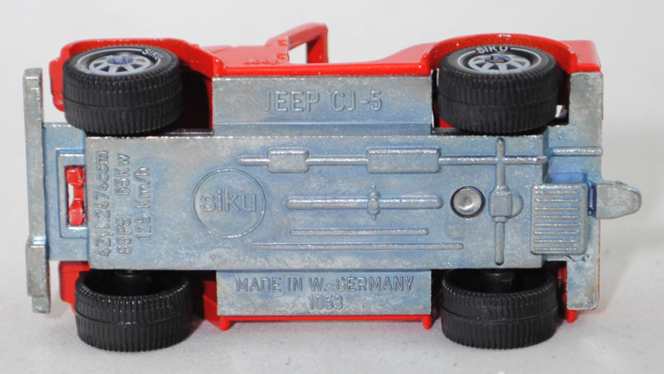 00004 Jeep CJ-5 2.5L (5. Generation, Baureihe Geländewagen der CJ-Serie, CJ = Civilian Jeep, zweitüriger Geländewagen mit 4 Sitzplätzen, kleine im hinteren Bereich abgerundete Türen, kurzer Radstand, ohne Softtop bzw. Fiberglas Hardtop, Änderungen 1979 zum Modelljahr 1980, Einbau des GM Iron Duke Vierzylinder-Reihenmotors, Ausstattungslinie CJ Grundausstattung: H4-Scheinwerfer + Doppelstoßstange vorne lackiert + 2,5 Liter (151 CID) 4-Zylinder-Benzin-Motor mit 88 PS + Außenspiegel auf der Fahrerseite + Innenspiegel 20,3 cm + gepolsterte Sonnenblenden + Beifahrerhaltegriff + energieabsorbierende Lenksäule mit Diebstahlsicherung + elektrische Scheibenwaschanlage und elektrische Scheibenwischer mit zwei Geschwindigkeiten + Schalensitze vorne + Sitzbank hinten + hinten montiertes Reserverad mit fester Rückwand + Unterfahrschutz für Getriebe und Kraftstofftank + Auspuffanlage mit einem Endrohr + 5-Loch Stahlfelgen Größe 38,1 x 15,2 cm mit schlauchlosen Suburbanite X-Grip Reifen H78 x 15B mit schwarzer Seitenwand, Sonderausstattung gegen Mehrpreis: elektrische Seilwinde bis 3,5 t Zugleistung + Fiberglas Hardtop + Anhängerkupplung (AHK), vollsynchronisiertes 4-Gang-Schaltgetriebe mit Mittelschaltung von Borg-Warner Corporation Typ SR4, Allradantrieb, Motor: Pontiac Motor Division von General Motors (GM) Typ 151 CID bzw. CUI (auch Iron Duke Motor genannt, Motorcode B151) wassergekühlter Vierzylinder-Reihen-Viertakt-Otto mit einem Rochester Varajet II Fallstrom-Registervergaser und eine zentrale Nockenwelle sowie OHV-Ventilsteuerung (Overhead valve engine) und 2 Ventile pro Zylinder sowie 2471 cm³ und 88 PS, Radstand 2121 mm, Länge 3665 mm, Modell 1979-1983) ohne Fiberglas Hardtop (von Siku als Jeep CJ-7 bezeichnet), verkehrsrot (vgl. ähnlich cardinal red beim Original), innen schwarz, Sitze schwarz, Lenkrad schwarz, Hardtop weg, W-Germ, Chassis chrom, ohne CE-Zeichen, B5 (Jeep Stahlfelgen im 4-Schlitz-Design Größe 5,5 x 15 ET 12 mit Lochkreis 5 x 139,7 und Nabendeckel sowie schlauchlose Suburbanite X-Grip Reifen H78 x 15B mit schwarzer Seitenwand), SIKU SUPER, ca. 1:55, m (Vitrinenmodell, Hardtop weg) (EAN 4006874010585)