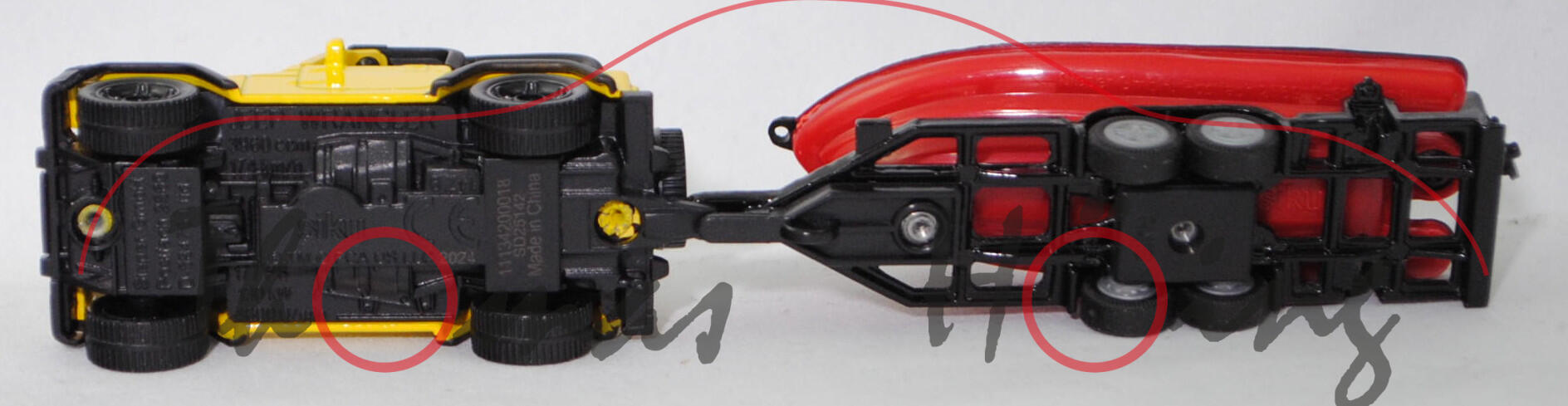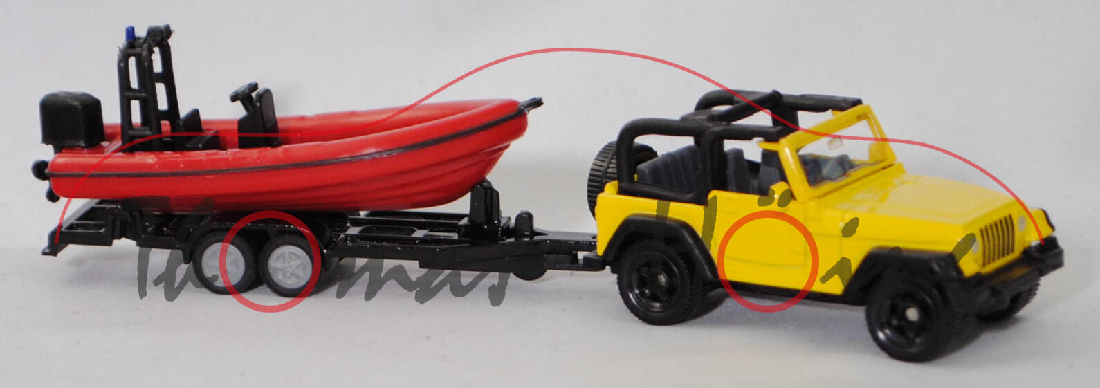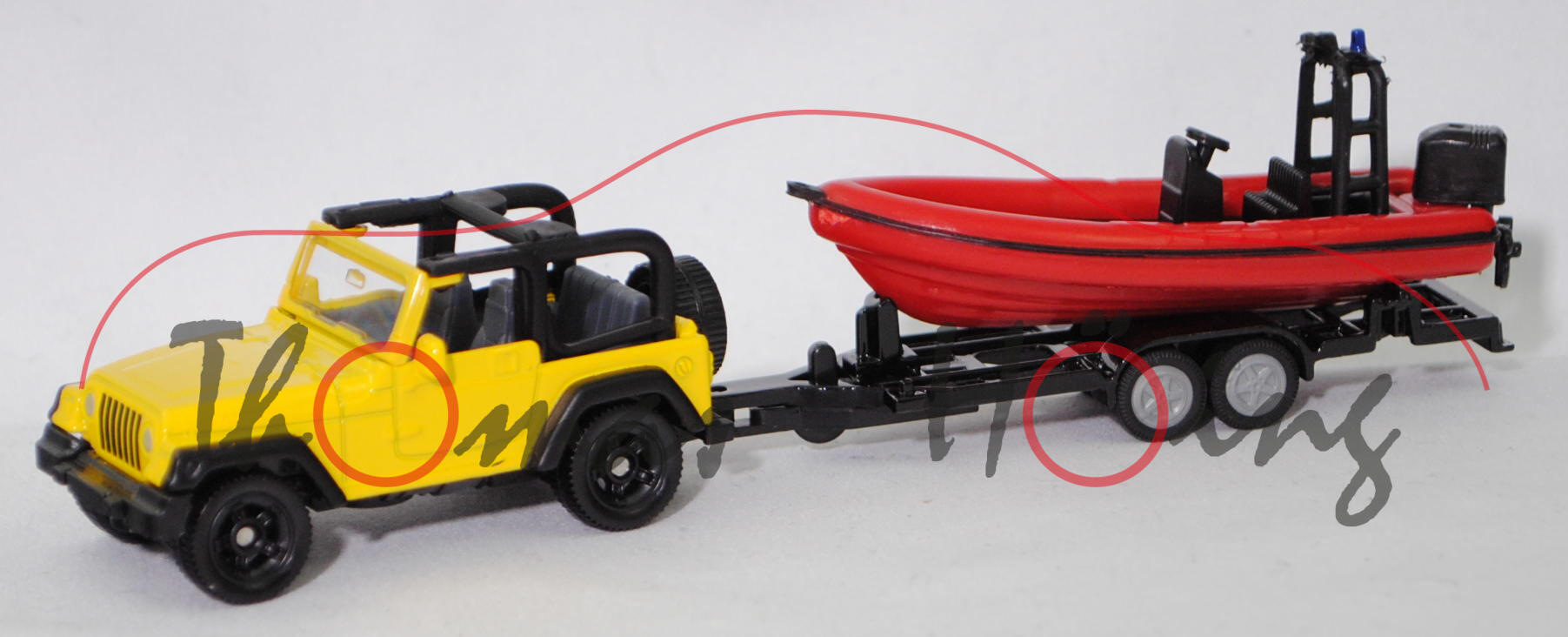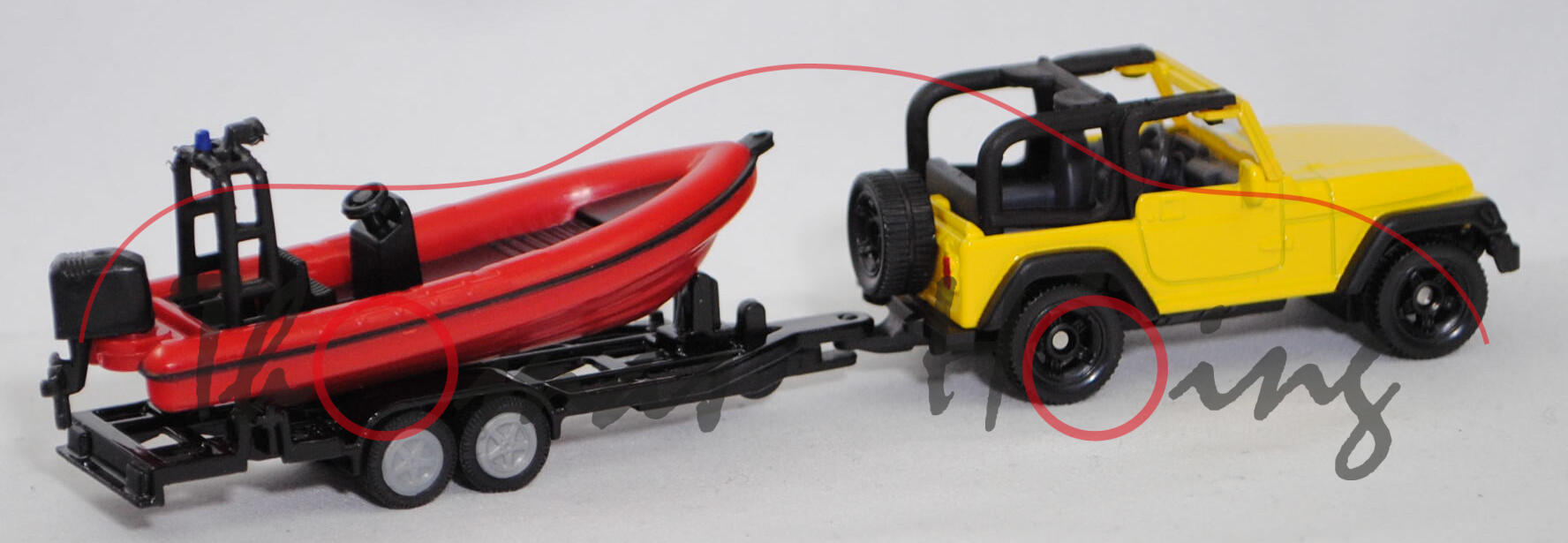 00004 Jeep Wrangler Sport 4.0 (2. Generation, Baureihe TJ, zweitüriger Geländewagen mit 4 Sitzplätzen, Facelift 2002, Außenspiegel in Kunststoffgehäuse, Radioeinfassung rechteckig mit abgerundeten Ecken, Kotflügelverbreitungen in medium grey/black, 6-Gang-Schaltgetriebe, zuschaltbarer Allradantrieb Command-Trac®, Motor: AMC (American Motors Corporation) 4.0L PowerTech 16 wassergekühlter Sechszylinder-Reihen-Viertakt-Otto mit sequenzieller Multipoint-Einspritzung und einer zentralen Nockenwelle sowie OHV-Ventilsteuerung (Overhead valve engine) und 2 Ventile pro Zylinder sowie 3960 cm³ und 177 PS, Radstand 2373 mm, Länge 3883 mm, Modell 2002-2006) mit HARBECK® BT 2500 MWS Motorbootanhänger (Typ Tandemfahrwerk, Fahrgestellrahmen aus verzinktem Stahl, Nutzlast 2000 kg, Gesamtanhängelast 2500 kg, Hersteller: Hermann Harbeck Fahrzeugbau GmbH & Co. KG Gewerbestraße 7 83329 Waging am See, Standard-Rahmenlänge ohne Deichsel 6800 mm) und Mehrzweckboot MZB 72/AB (Typ Außenbordversion, Hersteller: Lehmar GmbH, Am Mirower Kanal 9, 17248 Rechlin, 10 Sitzplätze, bis 3 Personen liegend, maximale Kapazität: 15 Personen, Motor: 1 Außenborder MERCURY F300 L VERADO wassergekühlter Achtzylinder-V-Viertakt-Otto mit elektronischer Einspritzung (EFI) und zwei obenliegende Nockenwellen (DOHC = Double Overhead Camshaft) sowie 4 Ventile pro Zylinder und 4572 cm³ sowie 300 PS, Trimmsystem L für lang Powertrimm, Rumpflänge 7200 mm, Länge über alles 7800 mm, Modell 2005-), Zugfahrzeug: Karosserie verkehrsgelb (vgl. solar yellow beim Original), Kotflügelverbreitungen mattschwarz (vgl. medium grey/black beim Original), innen basaltgrau, Sitze basaltgrau, Lenkrad basaltgrau, Kühlergrill mit minimaler Vertiefung zwischen den Rippen, Überrollbügel mattschwarz, Stoßstangen und Chassis mattschwarz, Bpr. siku mittig auf dem Chassis und CE-Zeichen dahinter vor der Hinterachse sowie mit Adresse unter der Vorderachse und ohne Artikelnummer, Druck Chargennummer auf dem Chassis, B28 schwarz (Jeep Stahlräder im 5-Arm-Design Größe 7 J x 15 ET 31,75 mit Lochkreis 5 x 114,3 (Teilenummer 4610482) und Reifen 215/75 R 15), ca. 1:55; Anhänger: Fahrgestell mit Deichsel schwarz, Radkästen schwarz, Deichselunterseite im Bereich der Öse abgerundet, Bpr. siku auf der Achshalterung, ohne Bpr. CE-Zeichen, C46 silbergrau (HARBECK® Stahlfelgen im 18-Loch-Design Größe 5,5 J x 14 H2 ET 30 mit Lochkreis 5 x 112 und Reifen 195/70 R 14 RF), ca. 1:93; Ladegut: Boot oben und unten verkehrsrot, innen schwarz, Druck umlaufender Streifen in schwarz, Doppelsitzbank schwarz, Steuerstand schwarz, Lenkrad schwarz, Geräteträger schwarz, Lautsprecher schwarz, 1 Blaulicht, Außenbordmotor schwarz, Bpr. siku hinten auf dem Rumpf, ohne Bpr. CE-Zeichen, Bpr. Adresse links unter dem Bootsoberteil, ca. 1:96, SIKU SUPER, P29f (EAN 4006874016587)