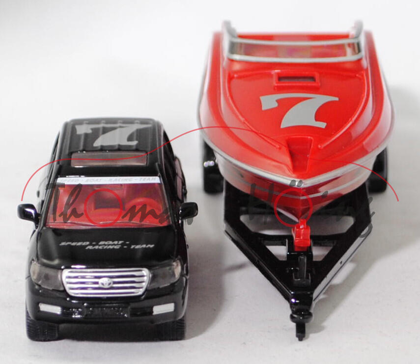 00004 Toyota Land Cruiser V8 Executive (5. Generation, Baureihe Land Cruiser, interne Baureihenbezeichnung J20 (J = Gelängewagen), fünftüriger Geländewagen mit 5 Sitzplätzen, Vorfacelift, Kühlergrill mit 4 waagerechten Lamellen, Lüftungsschlitze im vorderen Stoßfänger durchgehend zwischen den Nebelscheinwerfern, Ausstattungslinie Executive: Lederausstattung mit elektrischer Sitzverstellung und Sitzheizung für Fahrer und Beifahrer + elektrisches Glas-Schiebe-/Hebedach mit Auf-/Zu-Automatik und Einklemmschutz + Leichtmetallfelgen Größe 8,5 J x 20 mit Bereifung 285/50 R 20, 6-Gang-Automatikgetriebe, permanenter Allradantrieb, Motor: Toyota Typ 4,5-V8-D-4D wassergekühlter Achtzylinder-V-Viertakt-Turbo-Diesel mit Common-Rail-Direkteinspritzung und zwei obenliegende Nockenwelle (DOHC = Double Overhead Camshaft) sowie 4 Ventile pro Zylinder und 4461 cm³ sowie 286 PS, Motorcode 1VD-FTV, Radstand 2850 mm, Länge 4950 mm, Modell 2008-2012) mit Tandem-Bootstrailer und Motorboot PERFORMANCE 807 (Motorboot, Typ Offshore Speedboot, Ausstattung: 8 Sitzplätze und 1 Kabine mit 2 Kojen sowie separater Nasszelle mit Dusche und elektrischem WC, Hersteller: Performance Marine International GmbH in Porlezza am Luganer See / Italien, Z-Antrieb, Motor: 2 Stück Mercury Racing Bravo One XR z-drivers wassergekühlter Achtzylinder-V-Viertakt-Otto mit sequentieller elektronischer Kraftstoffeinspritzung (MPI = Multi-point Electronic Fuel Injection) und eine obenliegende Nockenwelle (SOHC = Single Overhead Camshaft) sowie 2 Ventile pro Zylinder und 8570 cm³ sowie 500 PS, Länge 8657 mm (28,4 Fuß), Modell 2002-2014), Zugfahrzeug: schwarz, innen signalrot, Sitze signalrot, Lenkrad signalrot, Druck SPEED - BOAT - / RACING - TEAM in silber auf den vorderen Türen und der Motorhaube, Druck SPEED - BOAT - RACING - TEAM in silber auf Streifen in reinweiß oben auf der Windschutzscheibe, Druck 7 in silber von vorne aus lesbar auf dem Dach, Nebelscheinwerfer silber, Bpr. ohne Adresse, B44 silbergrau (Toyota Leichtmetallfelgen im 5-Doppelspeichen-Design Größe 8,5 J x 20 ET 60 mit Lochkreis 5 x 150 (Teilenummer 4261160680, Farbcode silber) und Radzierkappe / Nabendeckel (Teilenummer 4260B60040, Farbcode silber mit Toyota-Logo in chrom) sowie Reifen 285/50 R 20 112V), ca. 1:55; Bootsanhänger: schwarz, Chassis mit Prägung siku-Logo, B21 silbergrau, ca. 1:57; Motorboot: signalrot, innen reinweiß, Sitze signalrot, Lenkrad schwarz, Instrumententafel schwarz, Druck PERFORMANCE 807 in silber oben auf den Seiten des Rumpfes, Druck SPEED - BOAT - / RACING - TEAM und Streifen in silber unten auf den Seiten des Rumpfes, Druck 7 in silber von vorne aus lesbar vorne auf dem Deck, Prägung 2543 / siku und CE-Zeichen auf der Unterseite, ca. 1:55, SIKU SUPER 1:55, L17mpK (EAN 4006874025435)