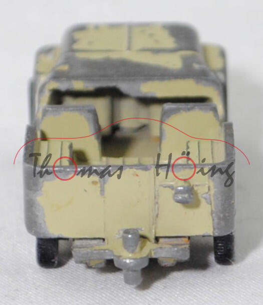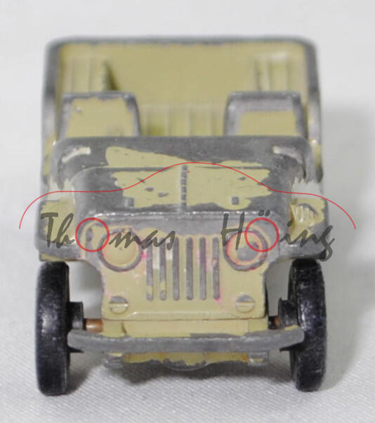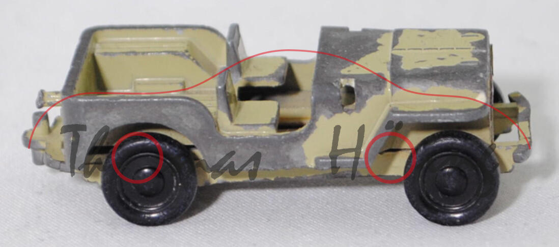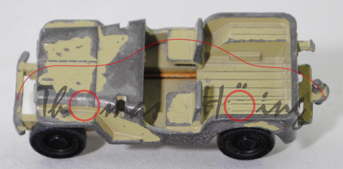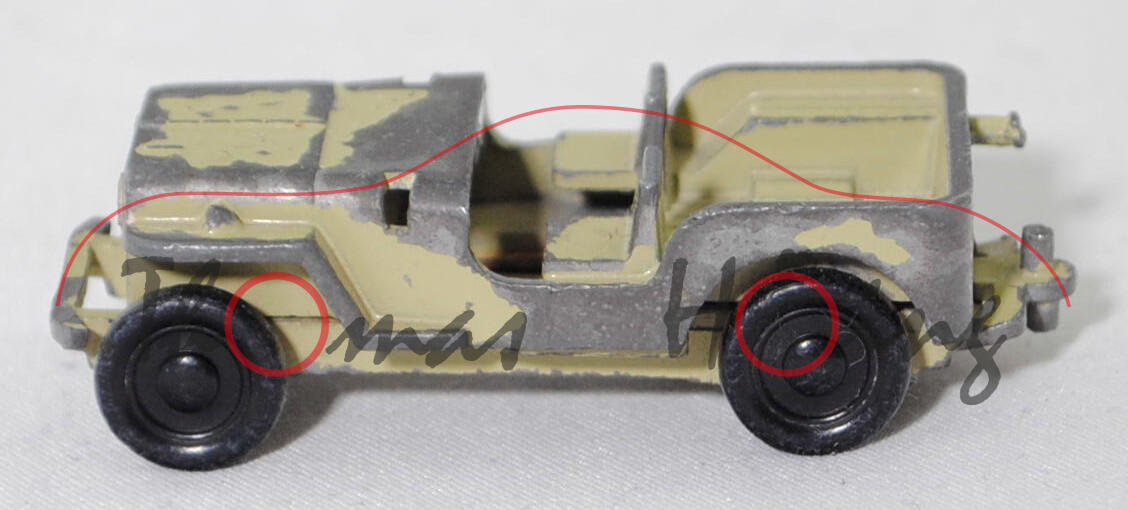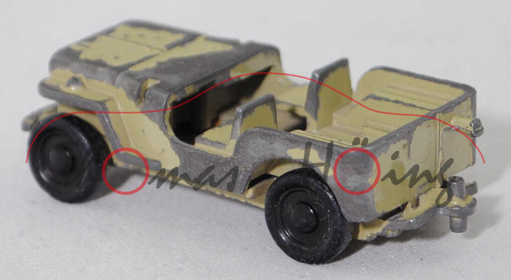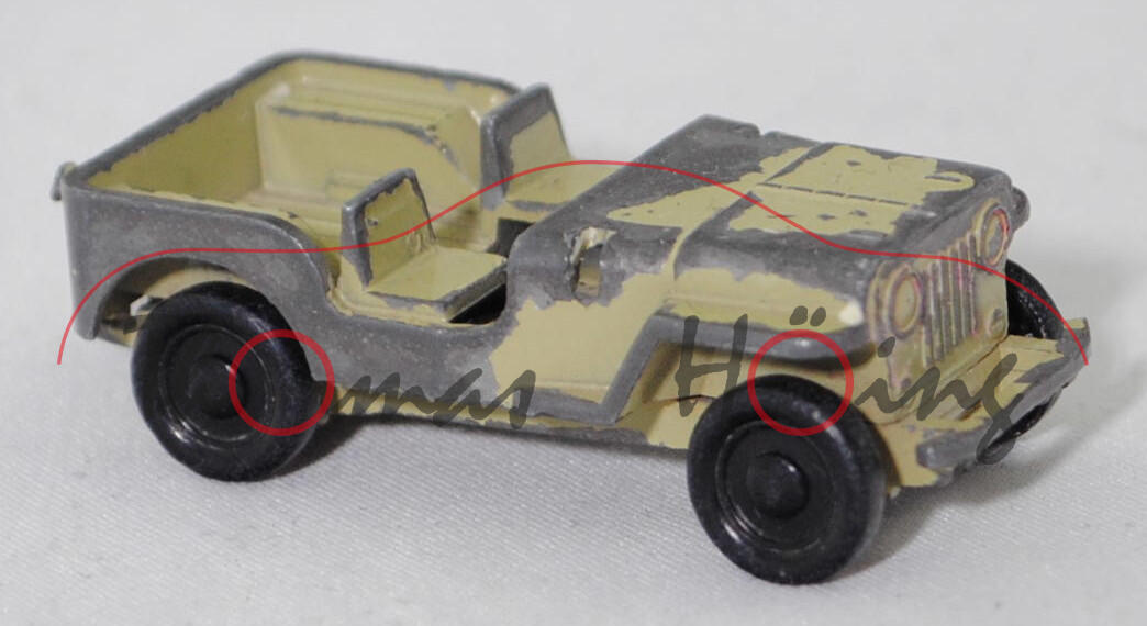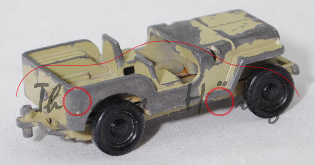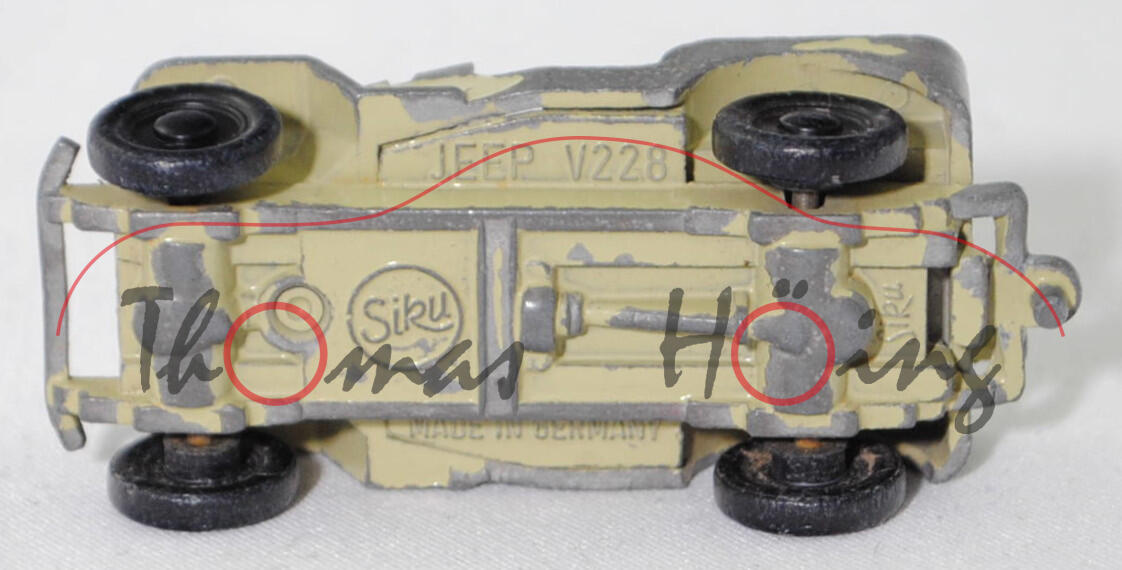 00004 Willys Jeep CJ-3A (MC, Modell 1949-1953), grünbeige, R1, SIKU-SUPER-ZINKGUSS 1:60 (V-SERIE), 1:60, sc (Frontscheibe und Ersatzrad weg, Lackschäden)