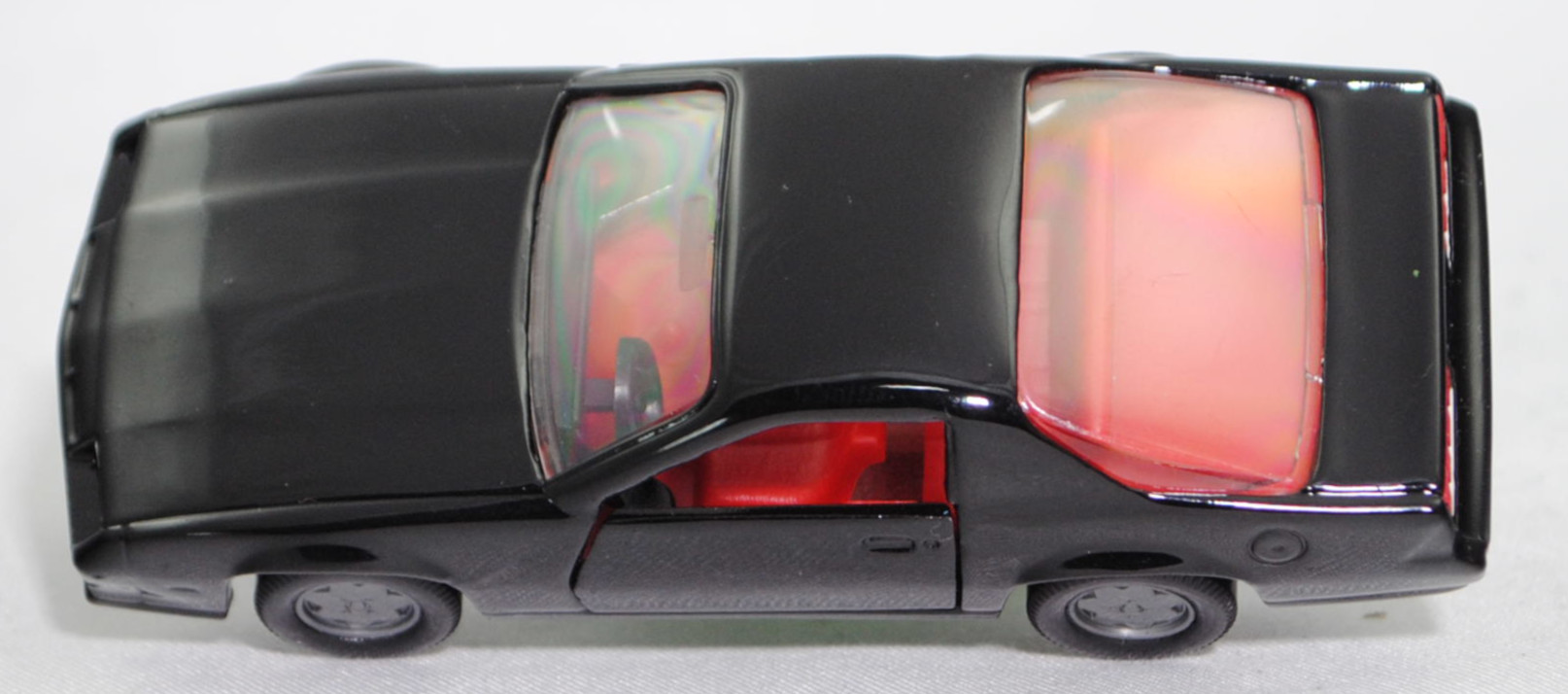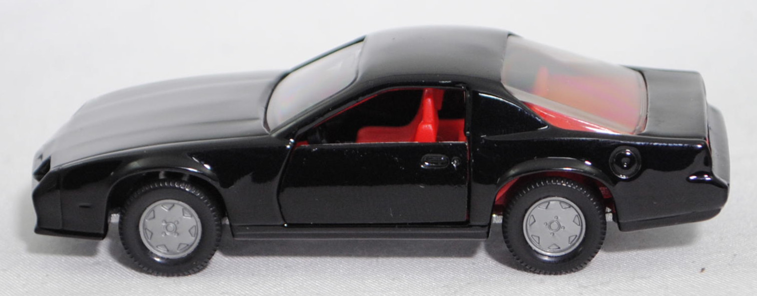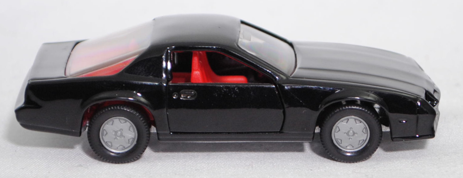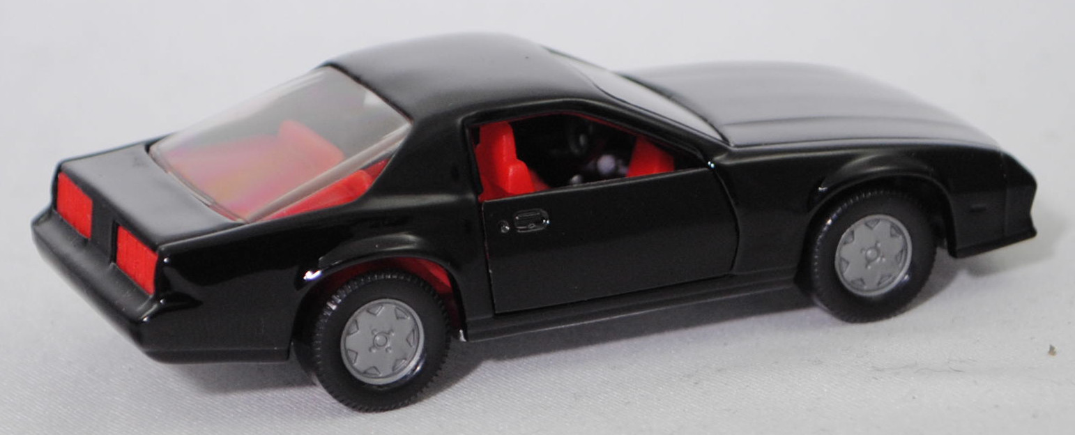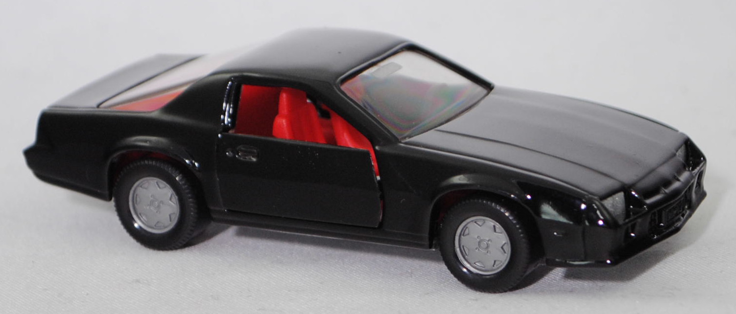 00005 Chevrolet Camaro Berlinetta 5.0L V8 (3. Generation, Baureihe Camaro, F-Body-Plattform der 3. Generation, zweitüriger Sportwagen als Coupé mit 4 Sitzplätzen, Vorfacelift, Frontschürze vorne leicht abgewinkelt und nicht so tief heruntergezogen, Ausstattungslinie Berlinetta: schwarz lackierte Scheinwerferhöhlen + Stoßfänger vorne mit 3 Lüftungsschlitzen zwischen den Frontscheinwerfern + Blinker im Stoßfänger vorne quadratisch + Stoßfänger vorne und hinten in Wagenfarbe + Motorhaube ohne Lüftungsschlitze + Sportspiegel in Wagenfarbe, links elektrisch verstellbar und rechts manuell + vollständige Instrumentierung mit Tachometer, Drehzahlmesser, Tageskilometerzähler, Kraftstoff-, Voltmeter-, Öl- und Temperaturanzeigen + elektrische Quarz-Analoguhr + abgedecktes Staufach + gepolstertes Lenkrad mit quadratischer Nabe + Zweiklang Hupe + verstellbare Vordersitze und umklappbare Rücksitzlehne + Türverkleidungen unten mit Teppichbezug + mit Teppich bezogene Radkästen und Seitenwände + Innenraumbeleuchtung + Zierstreifen in gold/schwarz unten rundherum + Deluxe-Gepäckraumverkleidung + Heckscheibe mit schwarzem Rand + Tankdeckel + goldfarbene Embleme und Typenbezeichnungen + spezielles komfortables Fahrwerk + 14'' x 7'' Aluminiumfelgen im Flossen-Design gold akzentuiert + Stahlgürten-Radialreifen 205/70 R 14, Sonderausstattung gegen Mehrpreis: Chevrolet 5,0 Liter 4-Bbl. V8 Motor mit 5001 cm³ und 147 PS (1982) bzw. 152 PS (1982-1984) + 3-Gang Automatikgetriebe, 3-Gang Automatikgetriebe, Hinterradantrieb, Motor: General Motors-Chevrolet Motor Division Typ 5.0 Liter 4-Bbl. V8 (Turbo-Fire V-8, Small Block mit 305,2 cui, Bestellcode LG4) wassergekühlter Achtzylinder-V-Viertakt-Otto mit einem Fallstrom-Doppel-Registervergaser Rochester E4ME-4 barrel und eine zentrale Nockenwelle sowie OHV-Ventilsteuerung (OHV = overhead valves) und 2 Ventile pro Zylinder sowie 5001 cm³ und 147 PS (1982) bzw. 152 PS (1982-1984), Radstand 2565 mm, Länge 4770 mm, Modell 1982-1984), schwarz (vgl. black beim Original, Verkaufskennzeichen 19, Farbcode WA848 / W5A848), innen verkehrsrot, Sitze verkehrsrot, Lenkrad schwarz, Bpr. CAMARO Z 28, Hong, Chassis silber, mit CE-Zeichen, Verglasung rauch, B6 (Chevrolet Aluminiumfelgen im Flossen-Design mit 15 Speichen gold akzentuiert Größe 7 J x 14 ET 8,6 mit Lochkreis 5 x 120,65 (Teilenummer 14048328, Farbcode gold akzentuiert (chrom/gold)) und Nabendeckel / Radzierdeckel (Teilenummer Deckel 14035580 mit Farbcode chrom sowie Teilenummer Abdeckkappe 14035578 mit Farbcode schwarz und Schriftzug berlinetta in gold) sowie Stahlgürten-Radialreifen 205/70 R 14), SIKU SUPER, ca. 1:59, m (Vitrinenmodell) (EAN 4006874010516)
