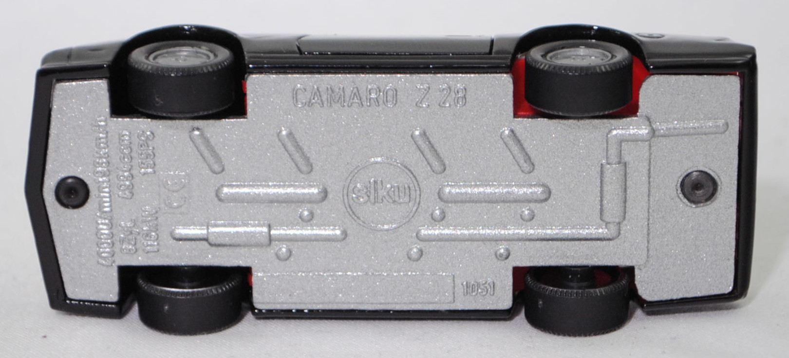 Produktinformationen "00005 Chevrolet Camaro Berlinetta 5.0L V8 (3. Generation, Vorfacelift, Modell 1982-1984), schwarz, Bpr. CAMARO Z 28, Hong, Chassis silber, mit CE-Zeichen, B6, SIKU SUPER, 1:59, m"