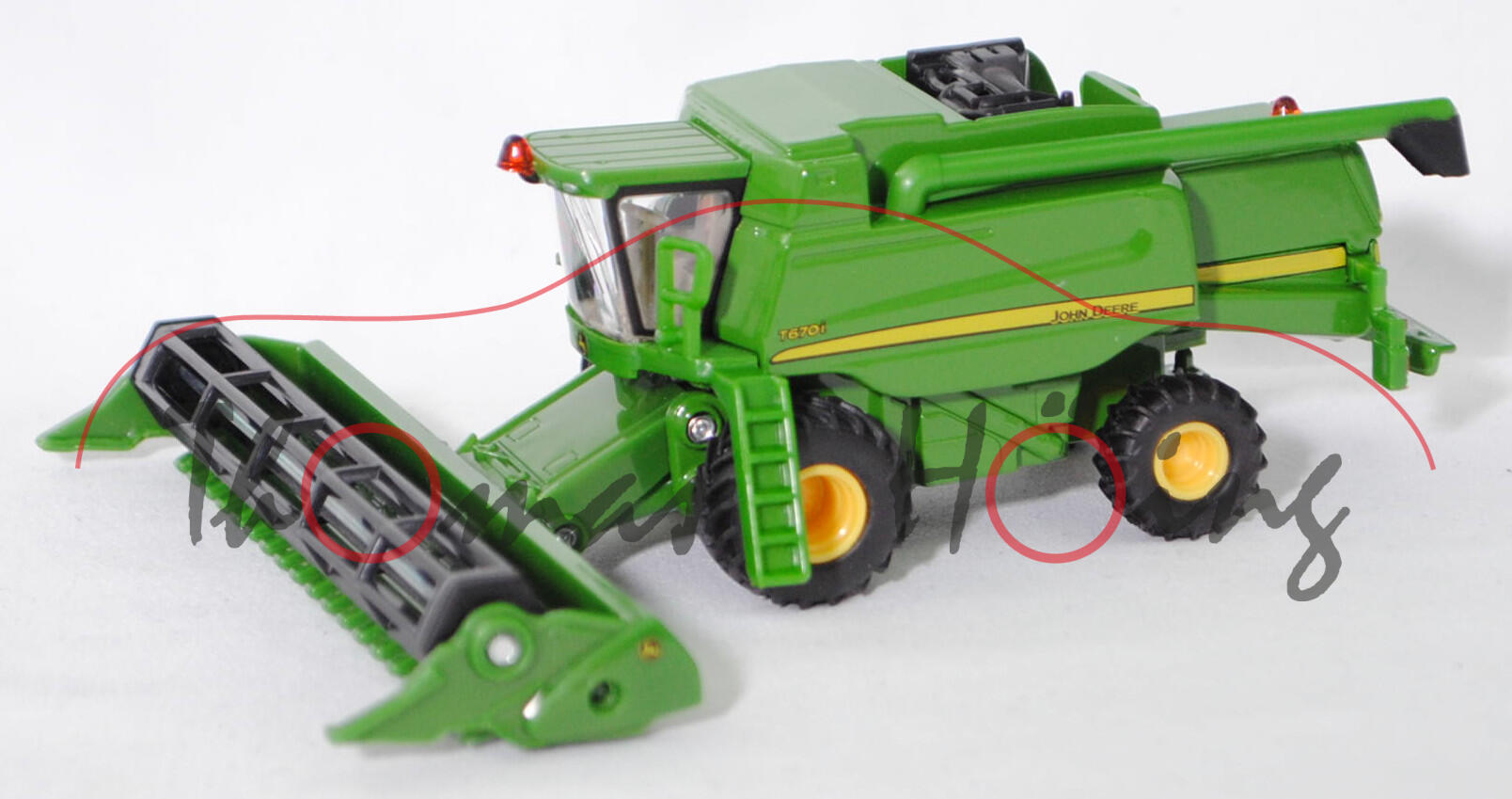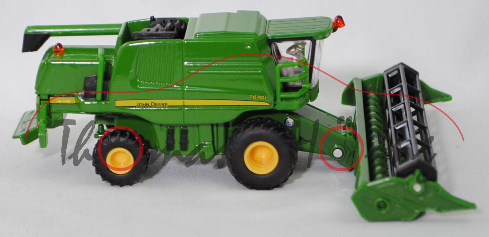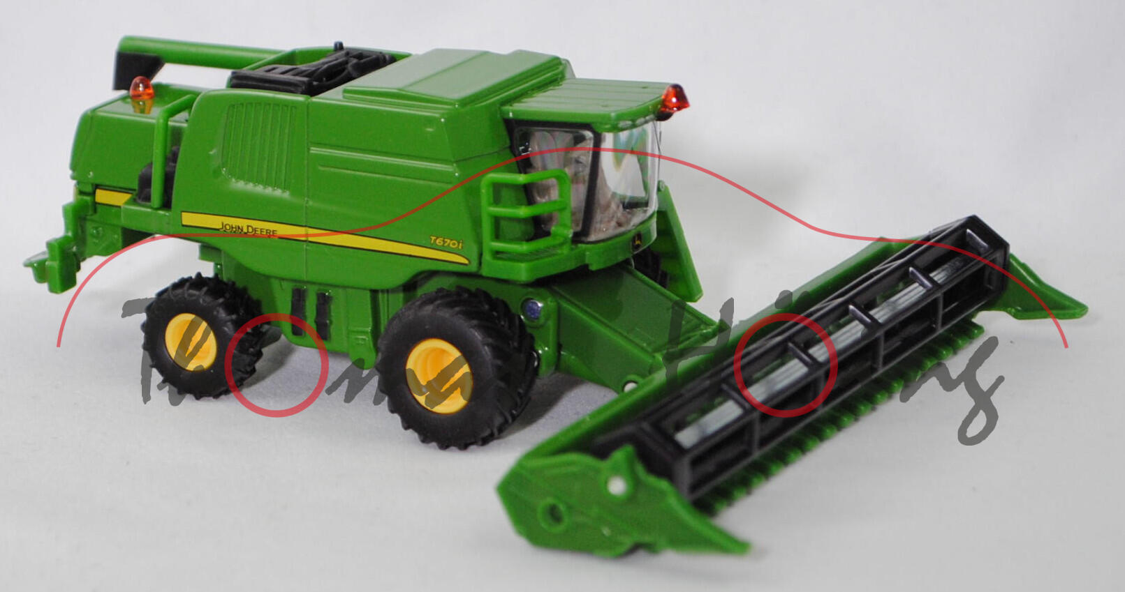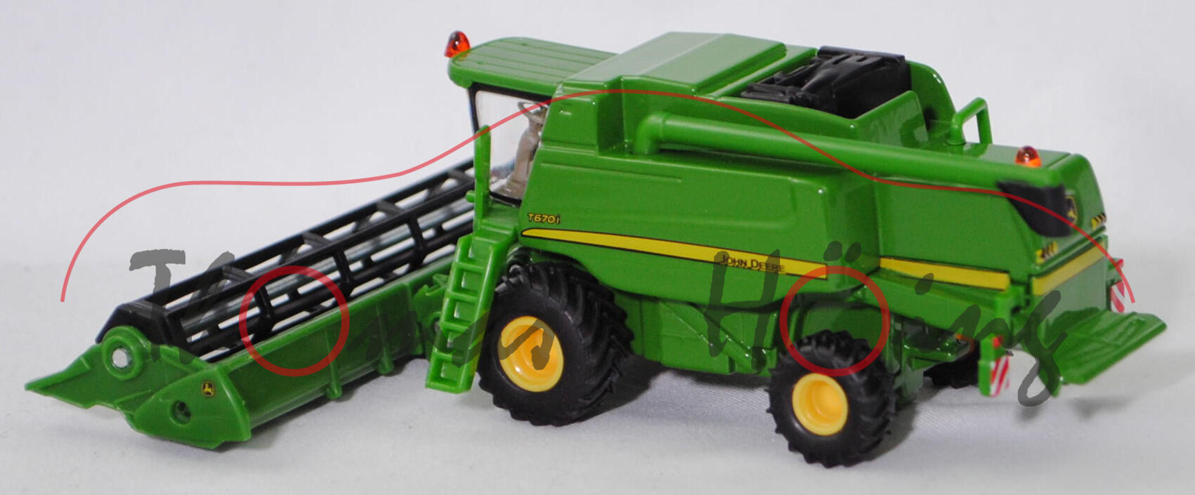 00005 John Deere T 670i (Motor: John Deere 6090HZ003D, i = Ausstattungspakt u.a. mit Feuchtigkeits- und Ertragsmessung, Modell 2008-2015) Mähdrescher mit John Deere 630R Erntevorsatz (Typ starres Schneidwerk, Arbeitsbreite 9,15 m), smaragdgrün, innen graubeige, Sitz graubeige, Lenkrad graubeige, Druck T 670i JOHN DEERE in zinkgelb/schwarz und zinkgelb/schwarze Streifen auf den Seiten, Druck John Deere-Logo und Streifen in zinkgelb/schwarz hinten, orange Rundumleuchte vorne und hinten, Bpr. siku im Bereich des rechten Vorderrades und CE-Zeichen im Bereich des linken Vorderrades sowie Adresse mittig und Chargennummer mittig auf der linken Seite beim Mähdrescher, Bpr. siku-Logo und CE-Zeichen mittig 90° versetzt zur Fahrtrichtung beim Schneidwerk, 87M14 verkehrsgelb / 87M15 verkehrsgelb, SIKU FARMER 1:87, ca. 1:87, L17mpK (EAN 4006874018765)