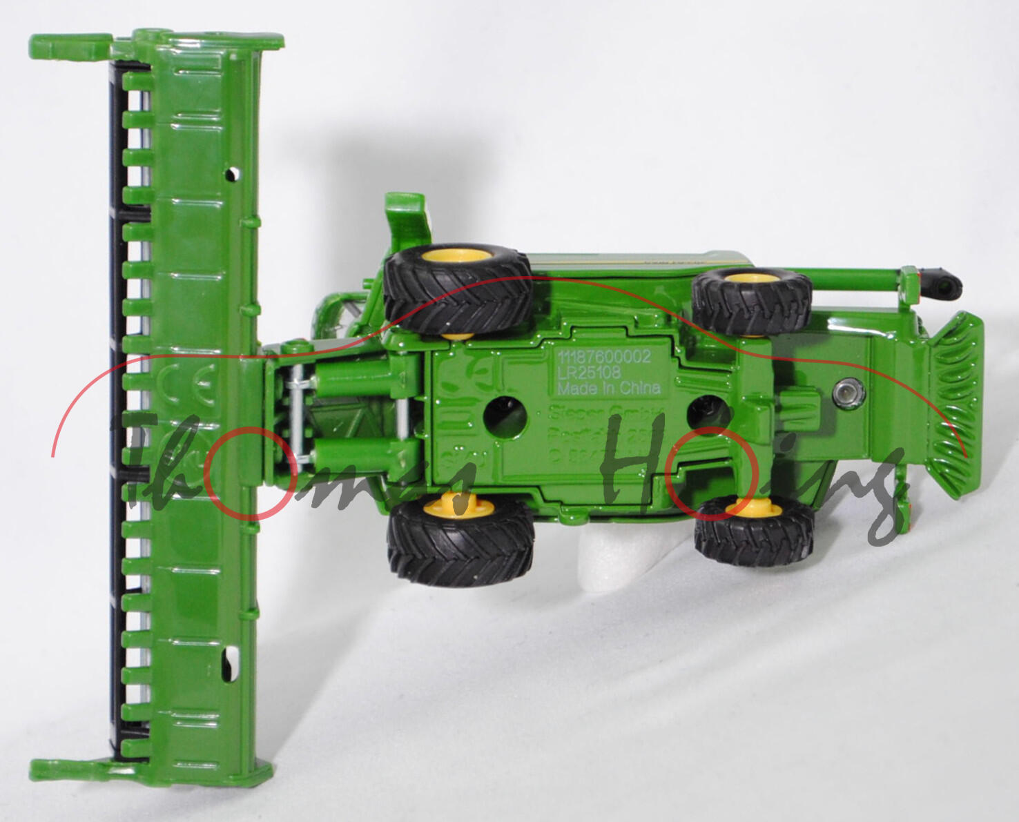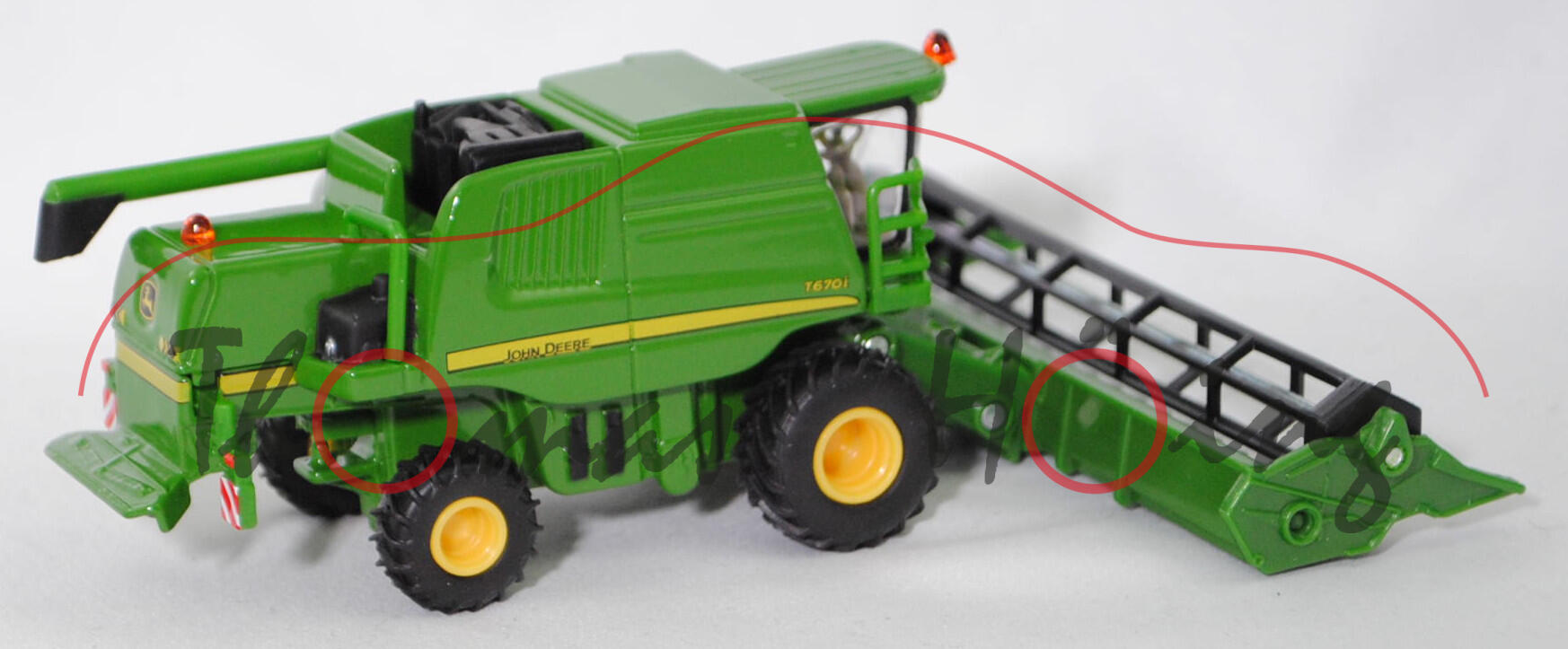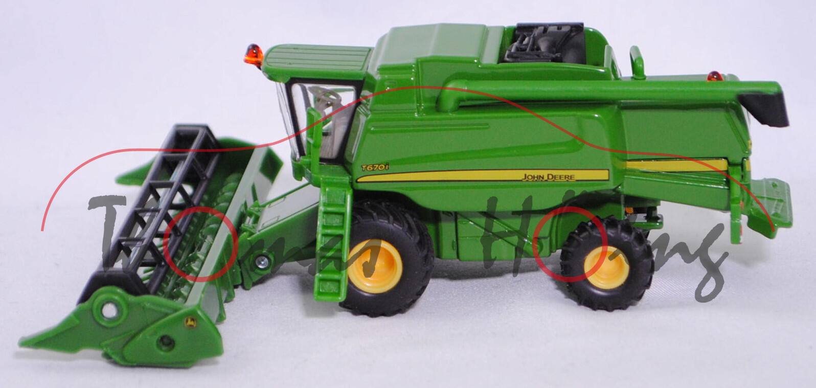 00005 John Deere T 670i (Motor: John Deere 6090HZ003D, i = Ausstattungspakt u.a. mit Feuchtigkeits- und Ertragsmessung, Modell 2008-2015) Mähdrescher mit John Deere 630R Erntevorsatz (Typ starres Schneidwerk, Arbeitsbreite 9,15 m), smaragdgrün, innen graubeige, Sitz graubeige, Lenkrad graubeige, Druck T 670i JOHN DEERE in zinkgelb/schwarz und zinkgelb/schwarze Streifen auf den Seiten, Druck John Deere-Logo und Streifen in zinkgelb/schwarz hinten, orange Rundumleuchte vorne und hinten, Bpr. siku im Bereich des rechten Vorderrades und CE-Zeichen im Bereich des linken Vorderrades sowie Adresse mittig und Chargennummer mittig auf der linken Seite beim Mähdrescher, Bpr. siku-Logo und CE-Zeichen mittig 90° versetzt zur Fahrtrichtung beim Schneidwerk, 87M14 verkehrsgelb / 87M15 verkehrsgelb, SIKU FARMER 1:87, ca. 1:87, L17mpK (EAN 4006874018765)