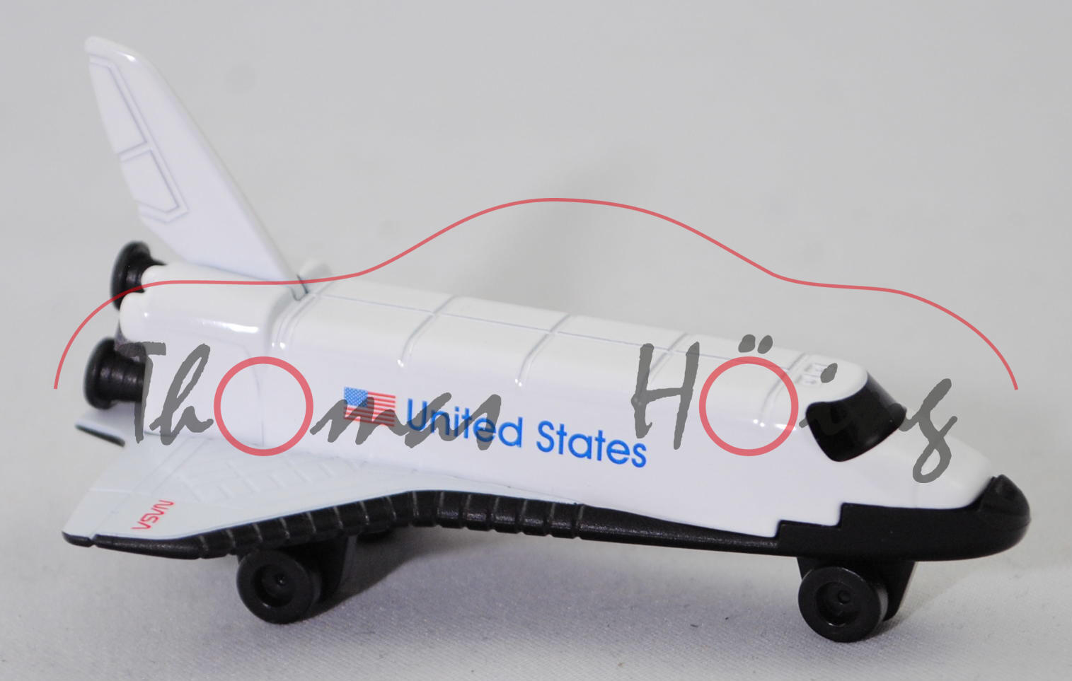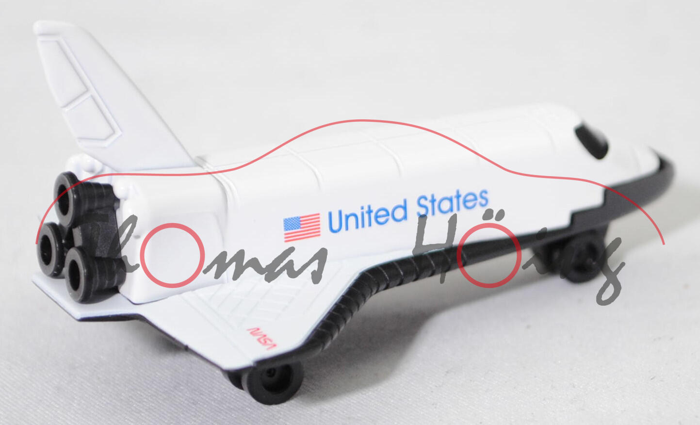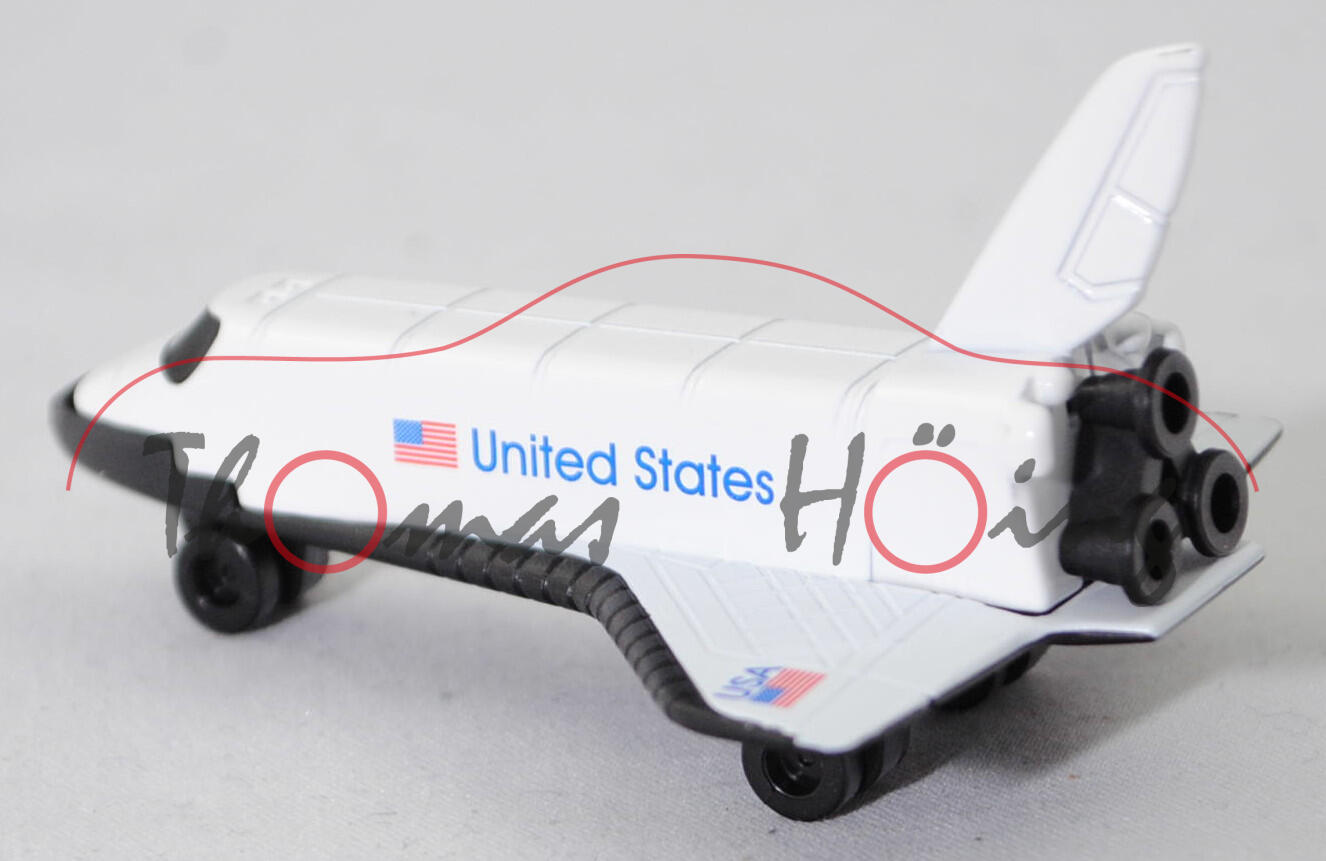 00005 NASA Space Shuttle Columbia (Typ Orbiter Vehicle OV-102, Modell 12.04.1984 - 01.02.2003) Raumfähre, reinweiß, Druck amerikanische Staatsflagge und United States in ultramarinblau auf den Seiten, Druck USA in ultramarinblau und amerikanische Staatsflagge auf der linken Tragfläche, Druck NASA in verkehrsrot auf der rechten Tragfläche, Raumfähre vorne geschlossen und im Bereich der Verglasung geschwärzt, Bpr. siku unter der linken Tragfläche und CE-Zeichen unter der rechten Tragfläche, Bpr. Adresse hinter dem hinteren Fahrwerk, Druck Chargennummer mittig auf dem Chassis, Prägung Made in China auf dem Chassis, Plastik-Chassis schwarz, Fahrwerk schwarz, Räder schwarz, SIKU SUPER, ca. 1:532, P29f (EAN 4006874008179)