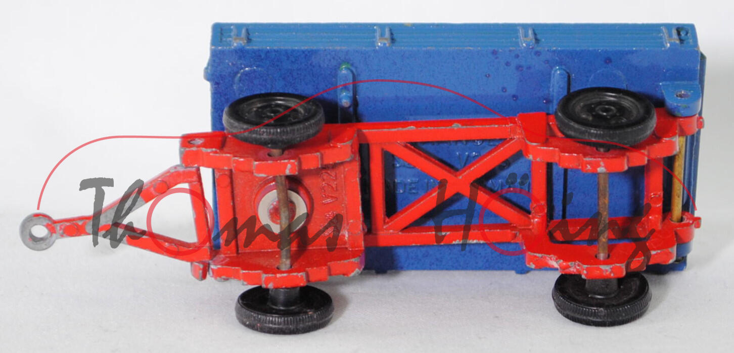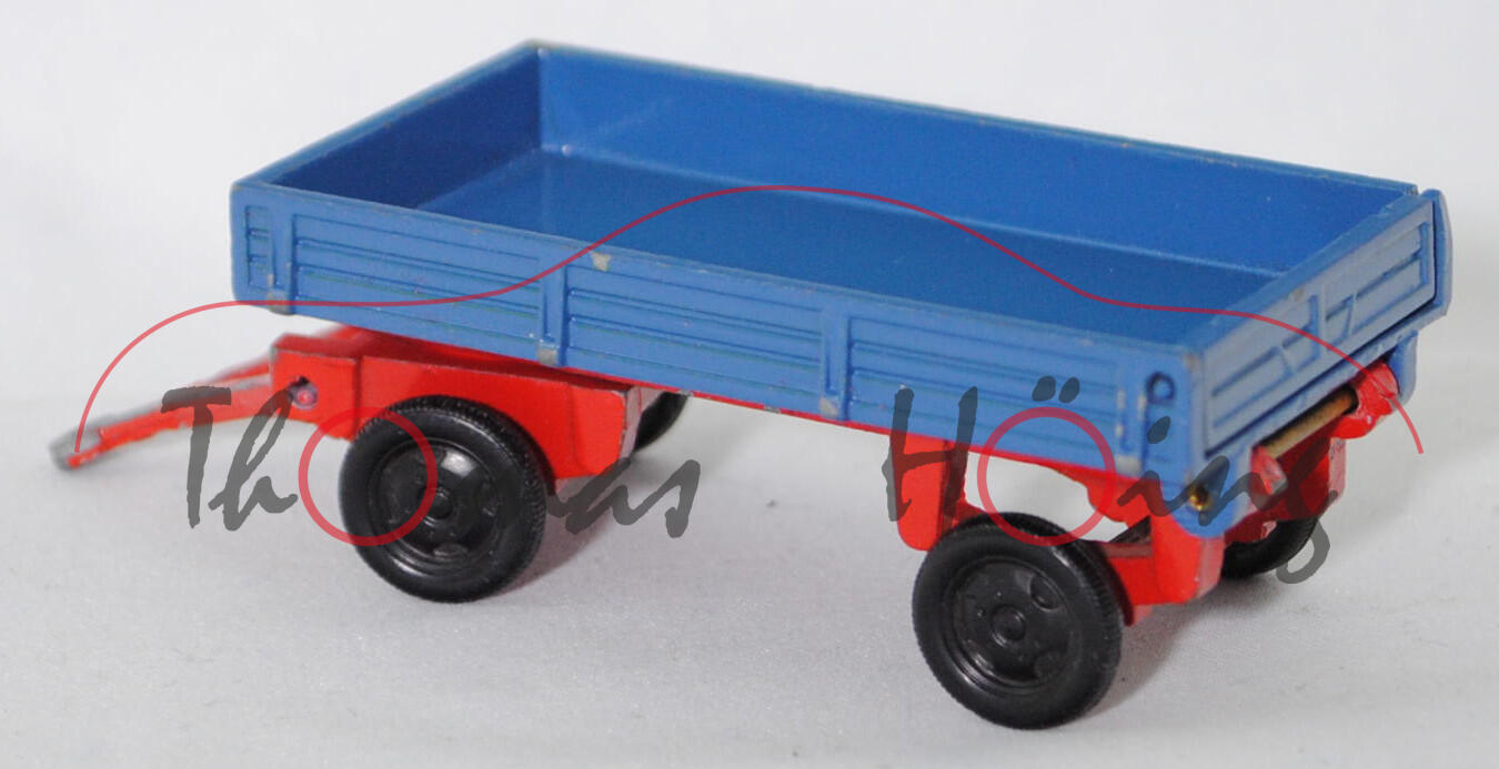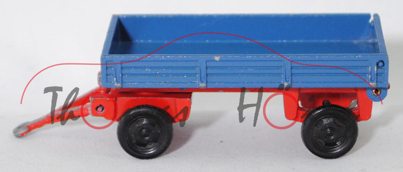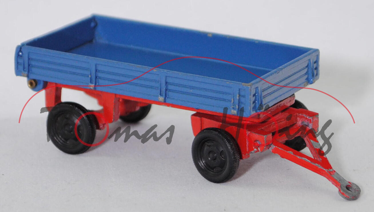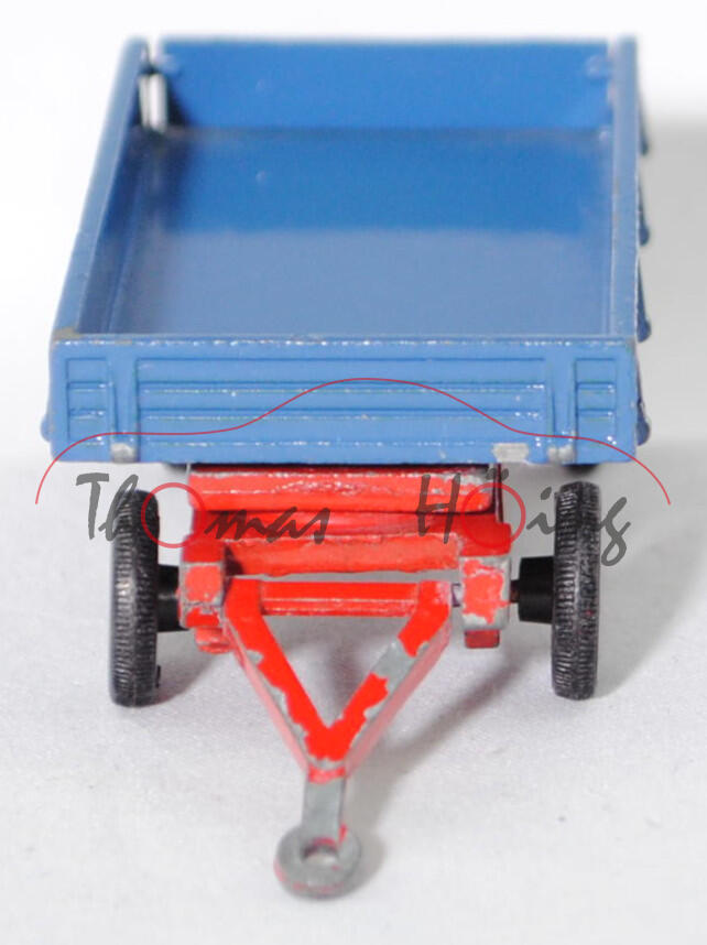 00005 Umbau, 2-Achs-Kippanhänger für LKW und Traktor (Typ 2-achsiger Drehschemelanhänger mit Kippbrücke als Hinterkipper, Radstand 2650 mm, Länge Kippbrücke 4085 mm, Baujahr 1963), Kippbrücke hell-violettblau, Heckklappe (Pendelklappe) mit zwei schrägen Streben bei der unteren Verbretterung, Drehschemel mit Deichsel und Fahrgestell verkehrsrot, Abschlepploch in der Deichsel mit Ø 2,5 mm, mit geschlossenem Loch oben im Fahrgestell im Bereich der Vollniete, Drehschemel am Fahrgestell mit Unterlegscheibe zwischen Drehschemel und Vollniete gehalten, Fahrgestell mit Blattfedern und X-Verstrebung mittig in verkehrsrot, X-Verstrebung im Fahrgestell hinten ohne Verstärkung, Bpr. Siku V225 hinten auf dem Drehschemel und mittig unter der Kippbrücke, Germ, LKW1, SIKU-SUPER-ZINKGUSS 1:60 (V-SERIE), ca. 1:60, m- (Umbau, Vitrinenmodell, Kippbrücke neu lackiert, minimale Lackfehler) (EAN 4006874002252)