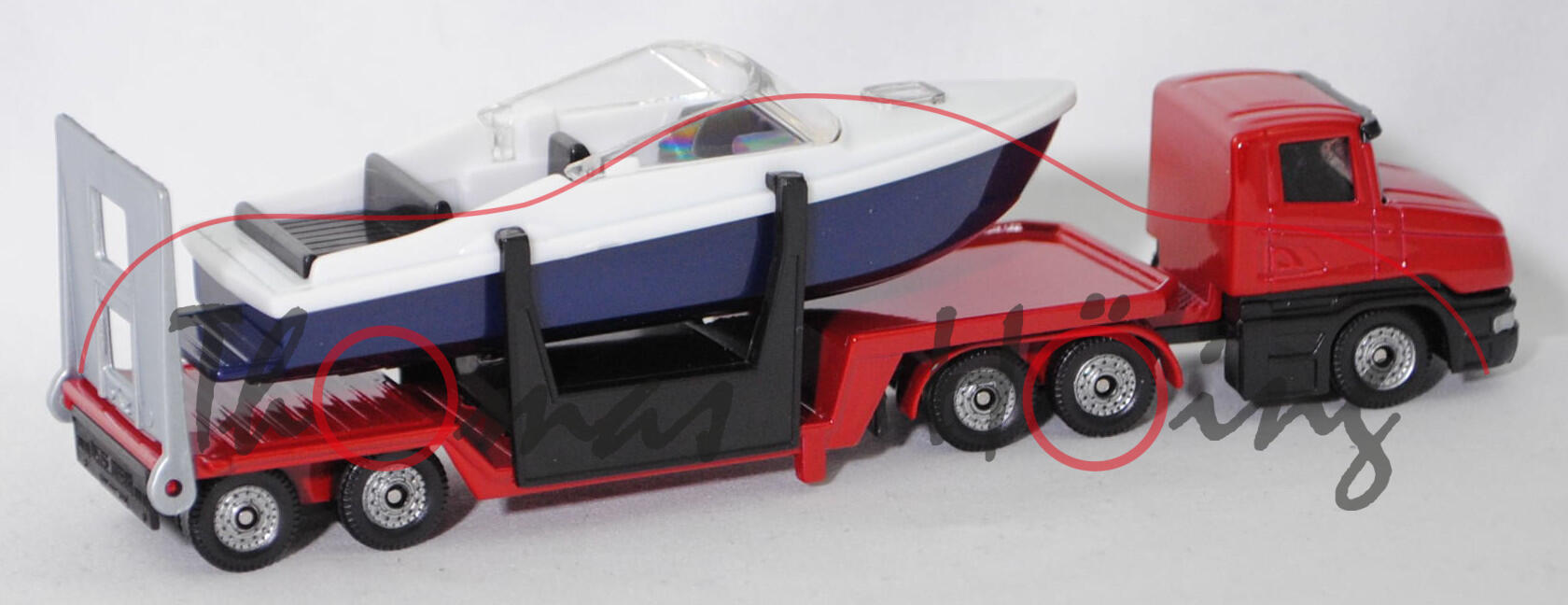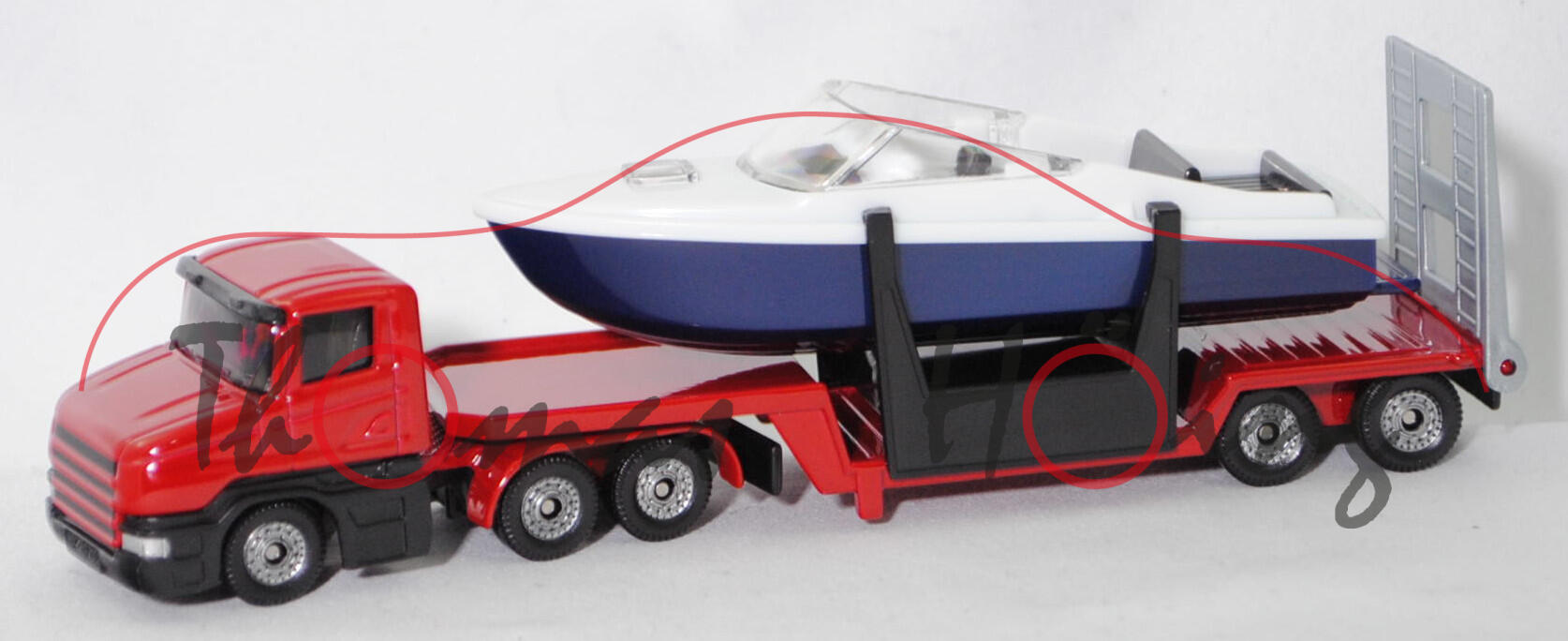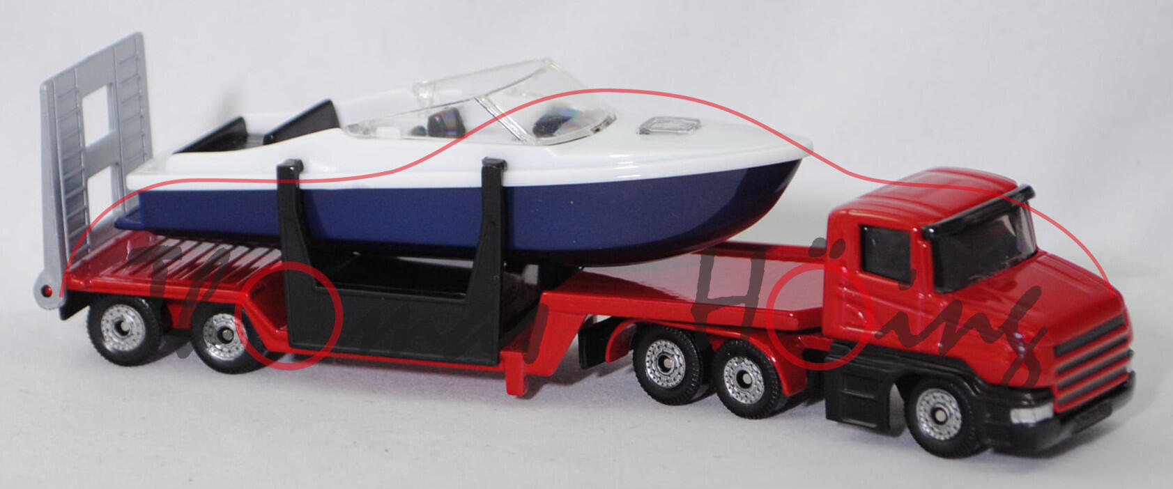 Produktinformationen "00006 Scania T114GA 6x4 NZ 340 (Baureihe Serie 4, Modell 1995-1998) mit 2-Achs-Tiefbett Sattelauflieger und Boot, dunkel-verkehrsrot + reinweiß/saphirblau, SIKU SUPER, P29f"