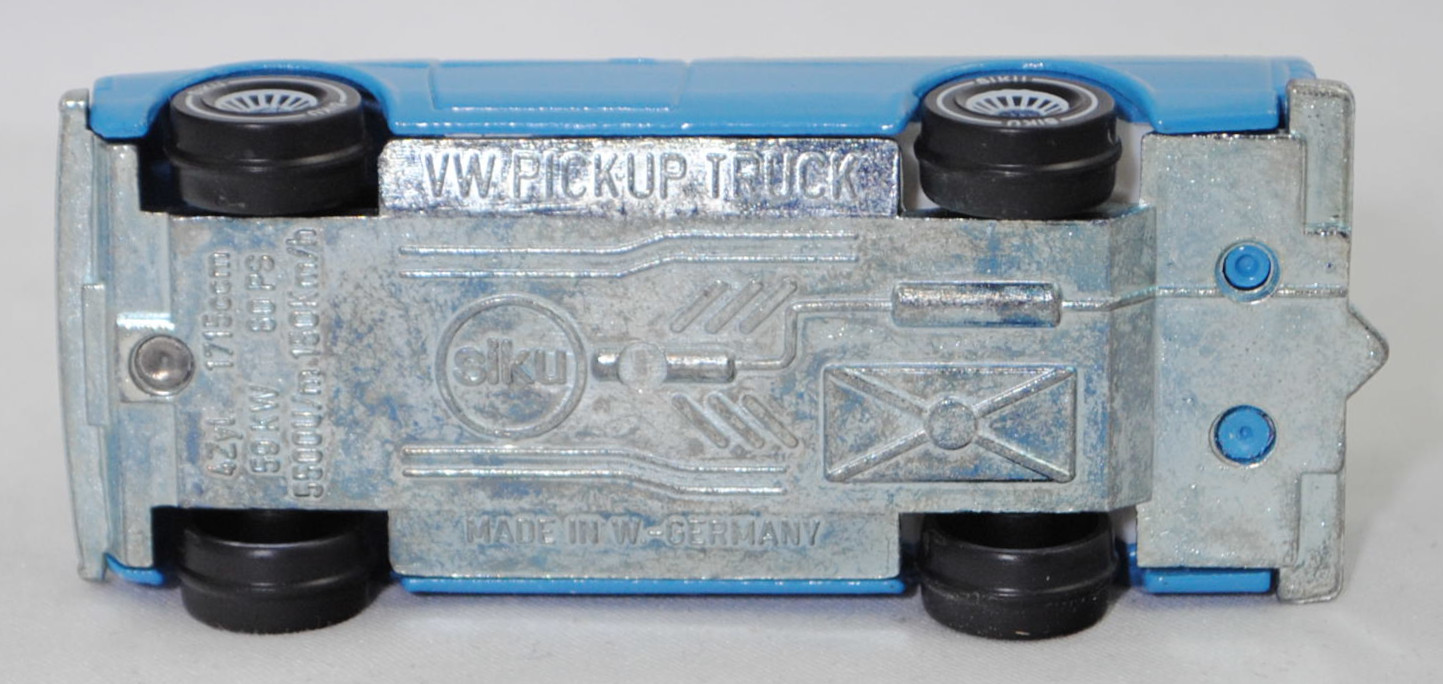 00006 VW Pickup Truck LX (vgl. VW Caddy I) (1. Generation, Baureihe Pickup Truck / Caddy, interne Baureihenbezeichnung 14D, Typ 147 (LHD = left-hand drive bzw. Linkslenker), zweitüriger Pritschenwagen mit 2 Sitzplätzen, Ausstattungslinie LX: Halogenscheinwerfer als Rechteckscheinwerfer + Blinker vorne neben den Scheinwerfern + verchromte Stahlstoßfänger mit Kastenprofil vorne + verchromter geteilter Stahlstoßfänger mit Kastenprofil hinten mit Trittstufe mittig + Stoßfänger vorne und hinten mit Aufprallleisten + Armaturenbrettfarbe farblich abgestimmt + Instrumententafel mit zwei runden Instrumenten für Geschwindigkeitsanzeige einschl. Kilometer- und Tageskilometerzähler sowie Quarzuhr einschl. Wassertemperaturanzeige und Tankanzeige + klapp- und schwenkbare Sonnenblenden mit Make-up-Spiegel auf der Beifahrerseite + abblendbarer Sicherheitsinnenspiegel + AM/FM-Radio mit Druckknopf + anatomisch geformte Schalensitze mit Stoffsitzbezug in Tweed-Struktur-Streifen + Sitzscharnierabdeckung farblich abgestimmt + Handschuhfach abschließbar und beleuchtet + getönte Scheiben + Ausstellfenster + Scheibenwischersteuerung mit Intervallschaltung + 2 Kleiderhaken + strapezierfähiger Nylon-Teppichboden + vollsynchronisiertes 3+E-Schaltgetriebe mit Hochschaltanzeige + Katalysator + AGR-System (Abgasrückführung) + Stahl-Lochscheibenräder Größe 5 J x 13 mit Radial-Stahlgürtelreifen P165/75 R 13, Hersteller: Volkswagen Westmoreland Assembly 1001 Technology Drive 15666 Westmoreland in Pennsylvania USA, vollsynchronisiertes Viergang-Schaltgetriebe als Mittelschaltung, Frontantrieb, Motor: Audi Typ VW EA827 wassergekühlter Vierzylinder-Reihen-Viertakt-Otto mit kontinuierlicher Einspritzung (CIS = Continuous Injection System) und eine obenliegende Nockenwelle (SOHC = Single Overhead Camshaft) sowie 2 Ventile pro Zylinder und 1715 cm³ sowie 78 PS, Motorkennbuchstabe WT, Radstand 2625 mm, Länge 4346 mm, Modell 1981-1983) mit Kastenaufbau, lichtblau (vgl. lago blue beim Original, Verkaufskennzeichen K8, Lacknummer LE5B), innen reinweiß, Sitze reinweiß, Lenkrad schwarz, Druck VOLKSWAGEN in reinweiß auf der Heckklappe, Kastenaufbau reinweiß, ohne Loch in der Bodenplatte (2. Ausführung), Chassis chrom mit Anhängerkupplung (AHK), Bpr. ohne CE-Zeichen, B4 (VW gestylte Stahl-Lochscheibenräder mit Tiefbettfelge im 8-Loch-Design Größe 5 J x 13 H2 ET 45 mit Lochkreis 4 x 100 (Teilenummer 321 601 025 K, Farbcode chromfarben) und Radzierkappen (Teilenummer 321 601 151 B, verchromt) sowie Radial-Stahlgürtelreifen P165/75 R 13), SIKU SUPER, ca. 1:58, m (Vitrinenmodell) (EAN 4006874010493)