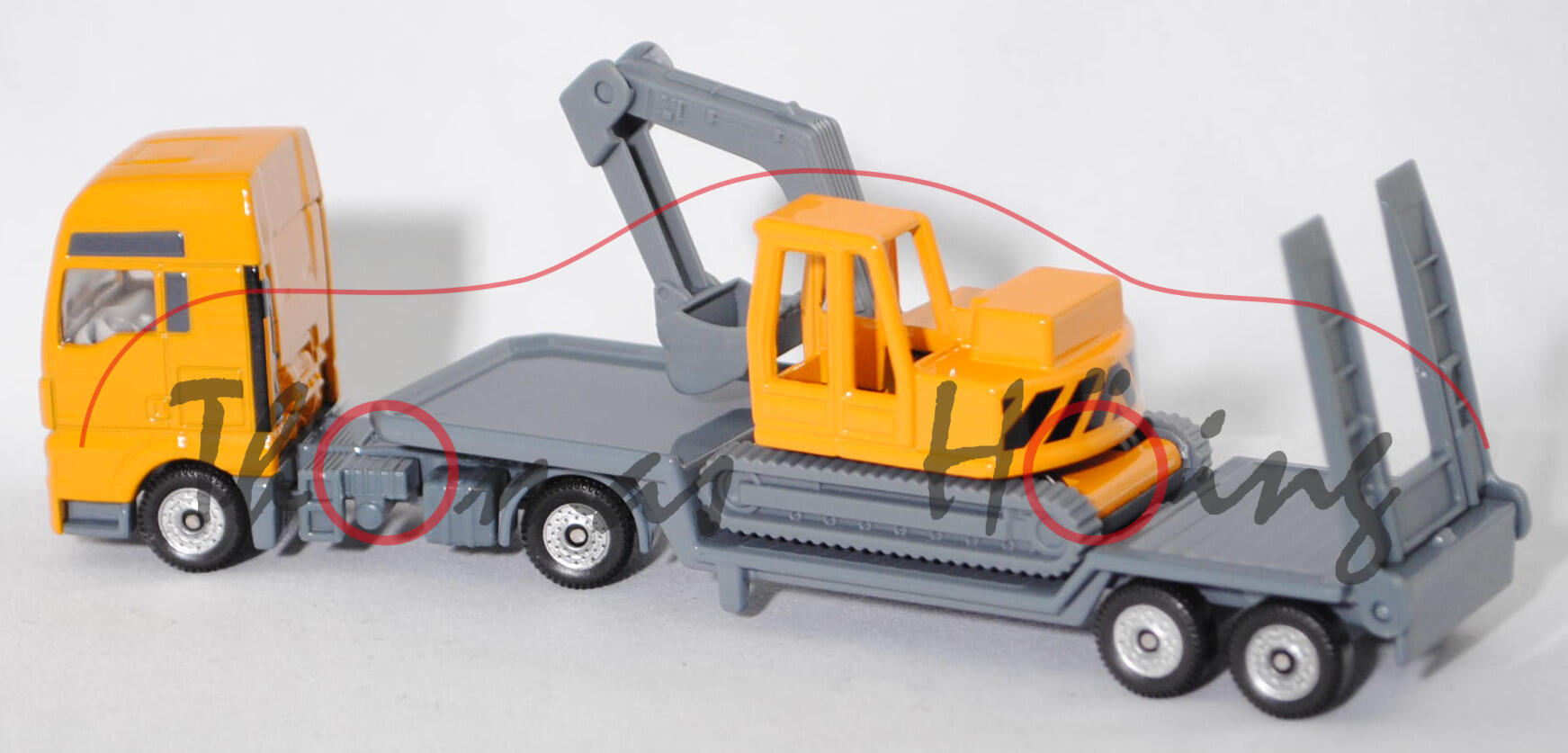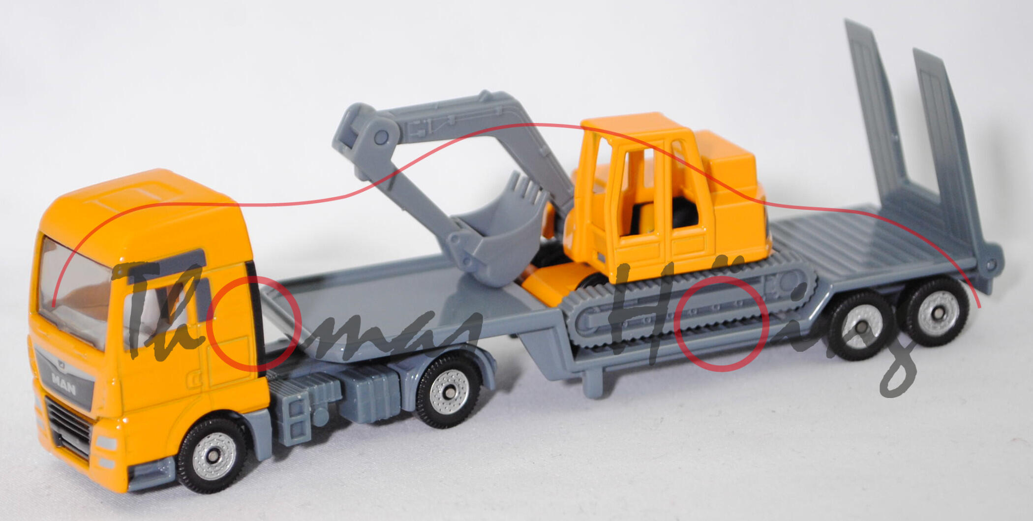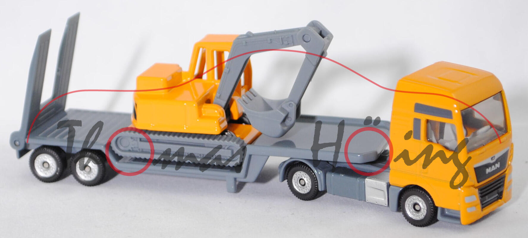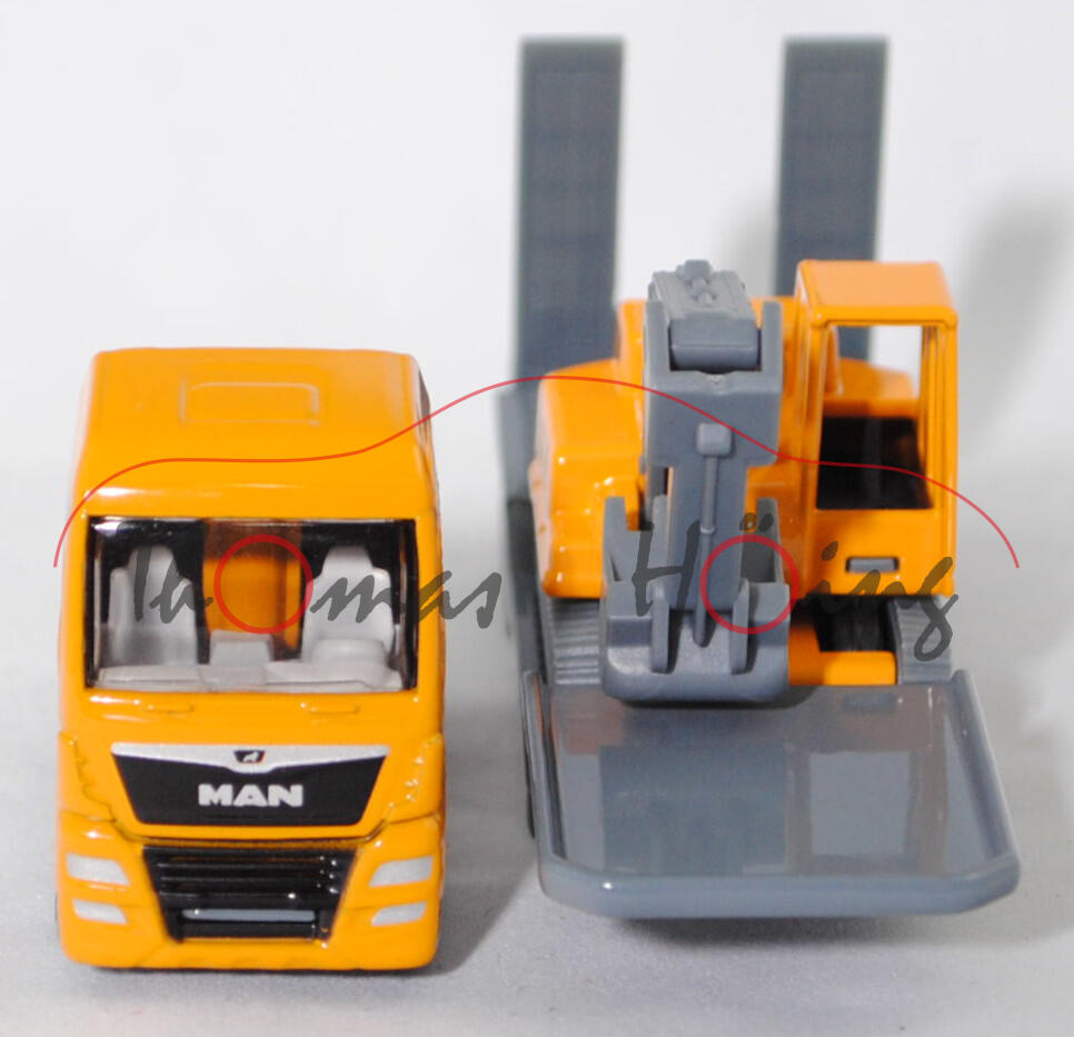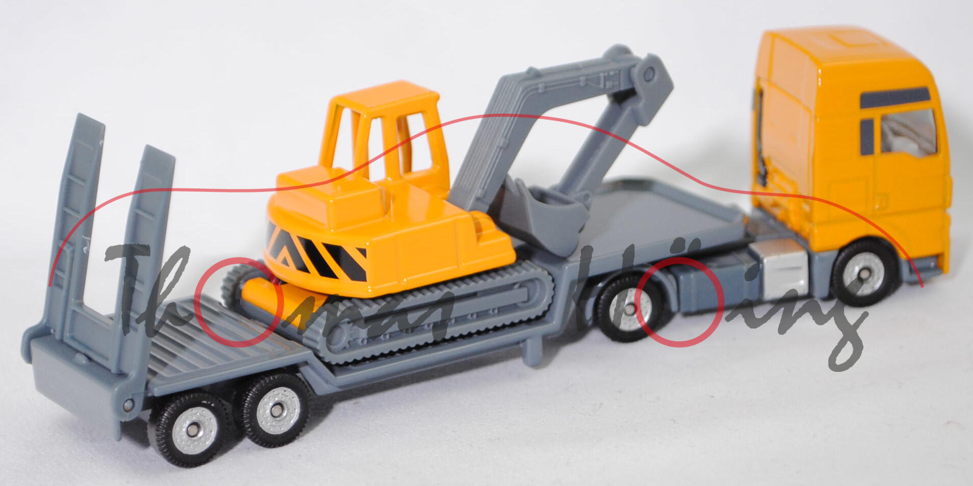 00010 MAN TGX 26.580 D38 XXL 4x2 (1. Generation, Baureihe TGX, Fahrerhaus XXL, Facelift 2017, Fahrerhaus vorne mit Chromspange und Löwe auf schwarzem Grund, 2 zusätzliche Kühlrippen zwischen den Frontscheinwerfern, Hinterradantrieb, Motor: MAN Typ D3876 wassergekühlter Sechszylinder-Reihen-Viertakt-Turbo-Diesel mit Bosch Common-Rail-Hochdruckeinspritzung und eine obenliegende Nockenwelle sowie 4 Ventile pro Zylinder und Ladeluftkühlung sowie 15248 cm³ und 580 PS, Radstand 3600 mm, Länge 5875 mm, Modell 2017-2019) Sattelzugmaschine mit 2-Achs-Tiefbett Sattelauflieger (Typ Tieflader mit gekröpftem Tiefbett) und Ladegut Bagger, Sattelzugmaschine: Fahrerhaus und Stoßstange vorne chromgelb, innen lichtgrau, Sitze lichtgrau, Lenkrad integriert, Radkästen und Fahrgestell hell-blaugrau, Chassis hell-blaugrau mit Schalldämpfer der Auspuffanlage auf der rechten Seite hinter dem Fahrerhaus in weißaluminiummetallic und AHK (Anhängerkupplung), Bpr. mit Adresse hinter der Vorderachse, Druck Teil der Chargennummer unter der Vorderachse auf dem Chassis, Bpr. CE-Zeichen mittig auf der linken Seite und siku unter der Hinterachse, C36, ca. 1:87; Sattelauflieger: Tieflader hell-blaugrau, zweispurige Rampe mit Querstrebe am oberen Ende, Längsträger auf der Unterseite der Ladefläche nach innen versetzt, Achshalterung beim Auflieger mit Versprung unter jeder Achse, Bpr. Adresse auf der linken Seite neben dem Längsträger und CE-Zeichen mittig sowie siku-Logo dahinter, Druck Teil der Chargennummer mittig vorne auf dem Tiefbett, Prägung Made in China unter der Chargennummer, C36; Ladegut: Bagger chromgelb, Fensterrahmen der Kabine 1,5 mm dick, Monoblockausleger und Löffelstiel mit Tieflöffel dunkel-silbergrau, Druck Streifen in schwarz auf dem Heck, Unterwagen oben chromgelb und unten dunkel-silbergrau, Laufwerk mit 8 Stützrollen, Treibrad hinten mit deutlich geprägten Zähnen, Raupenfahrwerk dunkel-silbergrau, Bpr. siku mittig auf der linken Seite zwischen den Rädern und CE-Zeichen auf der rechten Seite zwischen den Rädern sowie Adresse mittig zwischen den Vorderrädern, Druck Chargennummer mittig zwischen den Hinterrädern, Prägung Made in China unter der Chargennummer, Räder schwarz, SIKU SUPER, P29f (EAN 4006874016112)