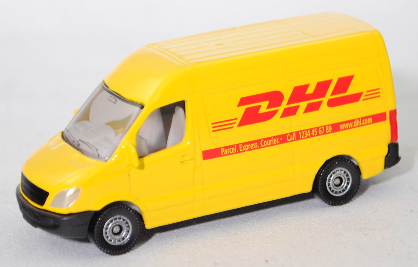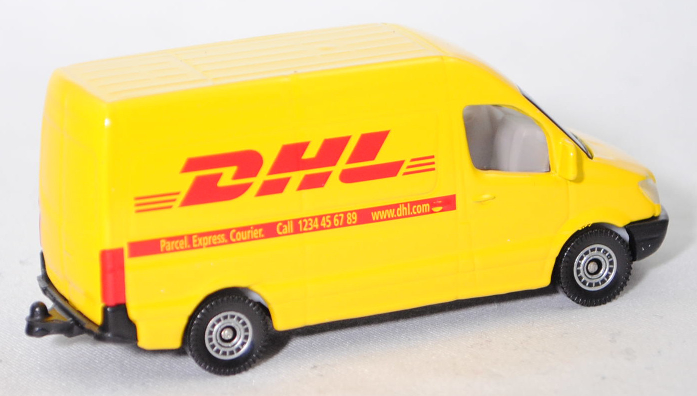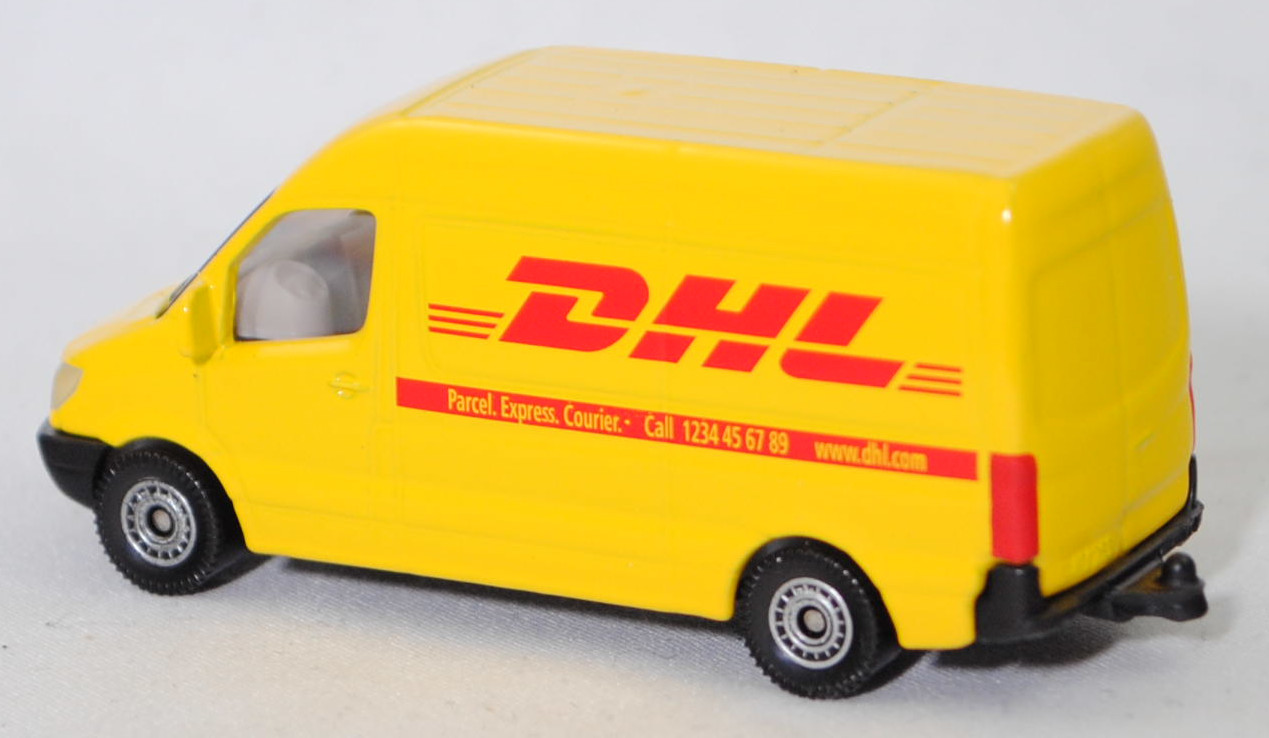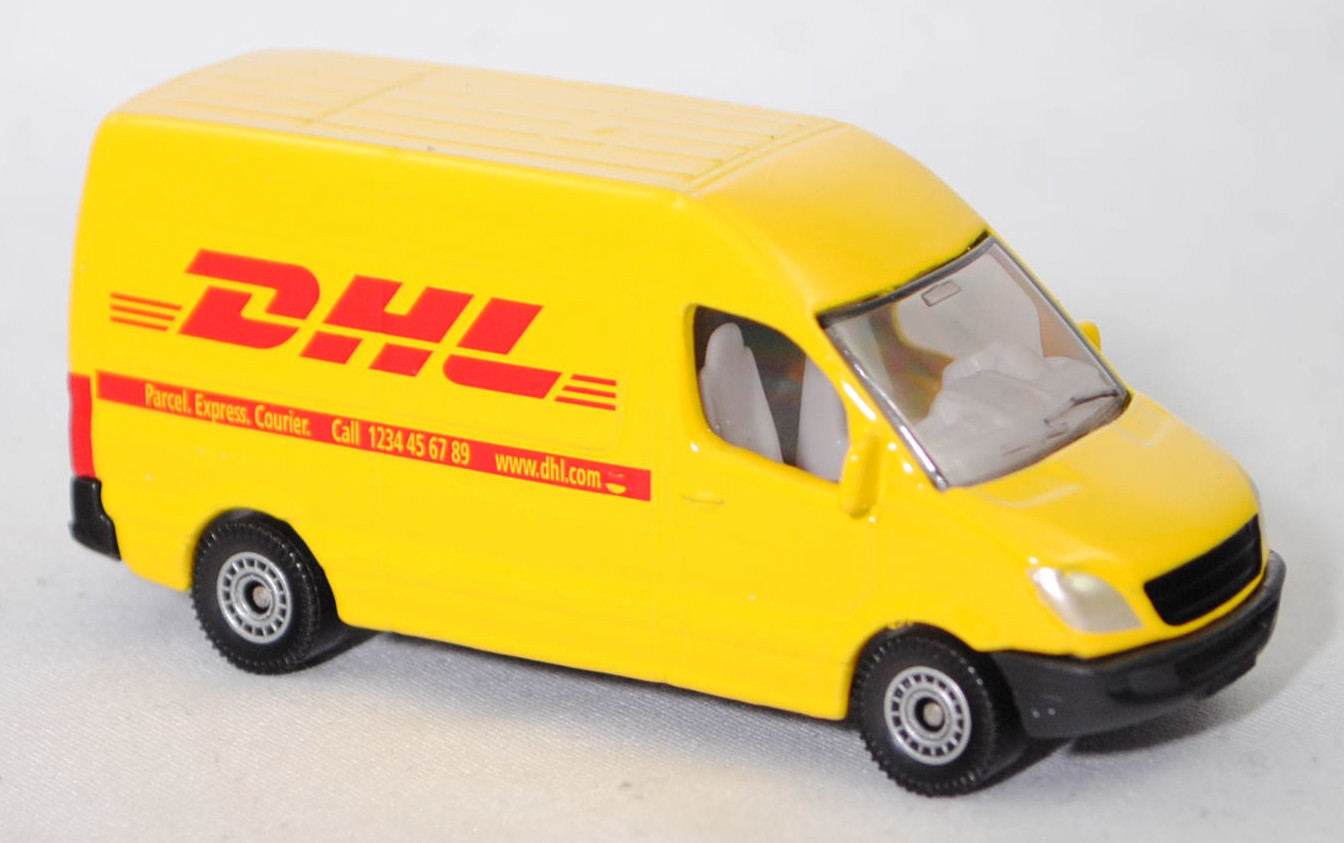 00010 Mercedes-Benz Sprinter II (2. Generation, interne Baureihenbezeichnung NCV 3 (NCV = New Concept Van), Baureihe Sprinter W 906, Typ Standard L2H2 mit mittlerem Radstand und Hochdach, Vor-MoPf (vor Modellpflege, Vorfacelift), Kühlergrill mit 2 waagerechten Lamellen, untere Kühlergrillverkleidung bis unter die Frontscheinwerfer verbreitert, Stoßfänger vorne in einer Höhe zum Radkasten geführt, Stoßfänger vorne mittig in Form eines offenen Mundes mit Ausbuchtungen für die Nebelscheinwerfer, Hinterradantrieb, Motor: Mercedes-Benz OM 646 DE 22 LA wassergekühlter Vierzylinder-Reihen-Viertakt-Diesel mit Bosch Common-Rail-Direkteinspritzung und Abgasturbolader mit variabler Turbinen-Geometrie (VTG) sowie zwei obenliegende Nockenwellen (DOHC = Double Overhead Camshaft) und 4 Ventile pro Zylinder sowie Ladeluftkühler und 2148 cm³ sowie 129 PS, Baumuster Motor 646.986, Radstand 3665 mm, Laderaumlänge 3265 mm, Gesamtlänge 5910 mm, Modell 2006-2009) 213 CDI / 313 CDI Kastenwagen Postwagen, hell-verkehrsgelb, innen reinweiß, Lenkrad integriert, Druck DHL in himbeerrot und himbeerroter Streifen auf den Seiten wobei Parcel. Express. Courier. Call 1234 45 67 89 www.dhl.com in Wagenfarbe durchschimmert, ohne Mercedes-Stern im Grill, C80 schwarz mit silbernem Druck (Mercedes-Benz Stahlscheibenräder im 18-Loch-Design Größe 5,5 J x 16 H2 ET 51 mit Lochkreis 6 x 130 (Teilenummer A 001 401 35 02 9206, Farbcode silber) und Nabenkappe / Radschraubenabdeckung (Teilenummer A 906 401 00 25, Farbcode 9B51 anthrazit) sowie Reifen LT 205/75 R 16 110/108R 6PR), SIKU SUPER, ca. 1:77, P29f (EAN 4006874010851)