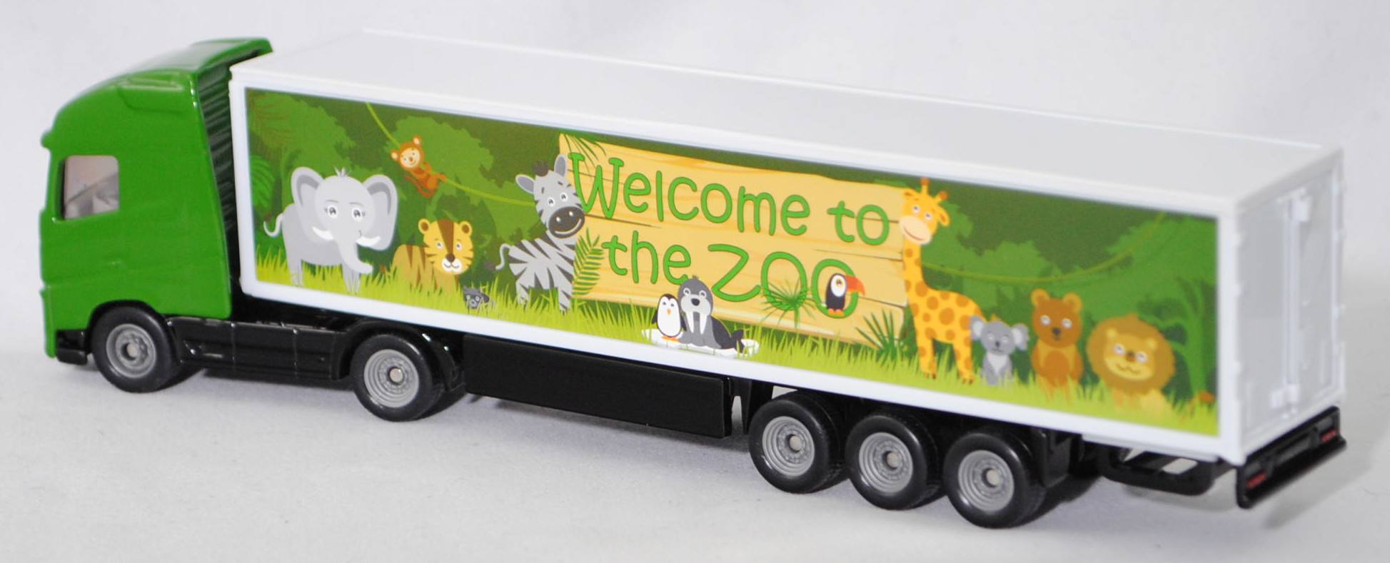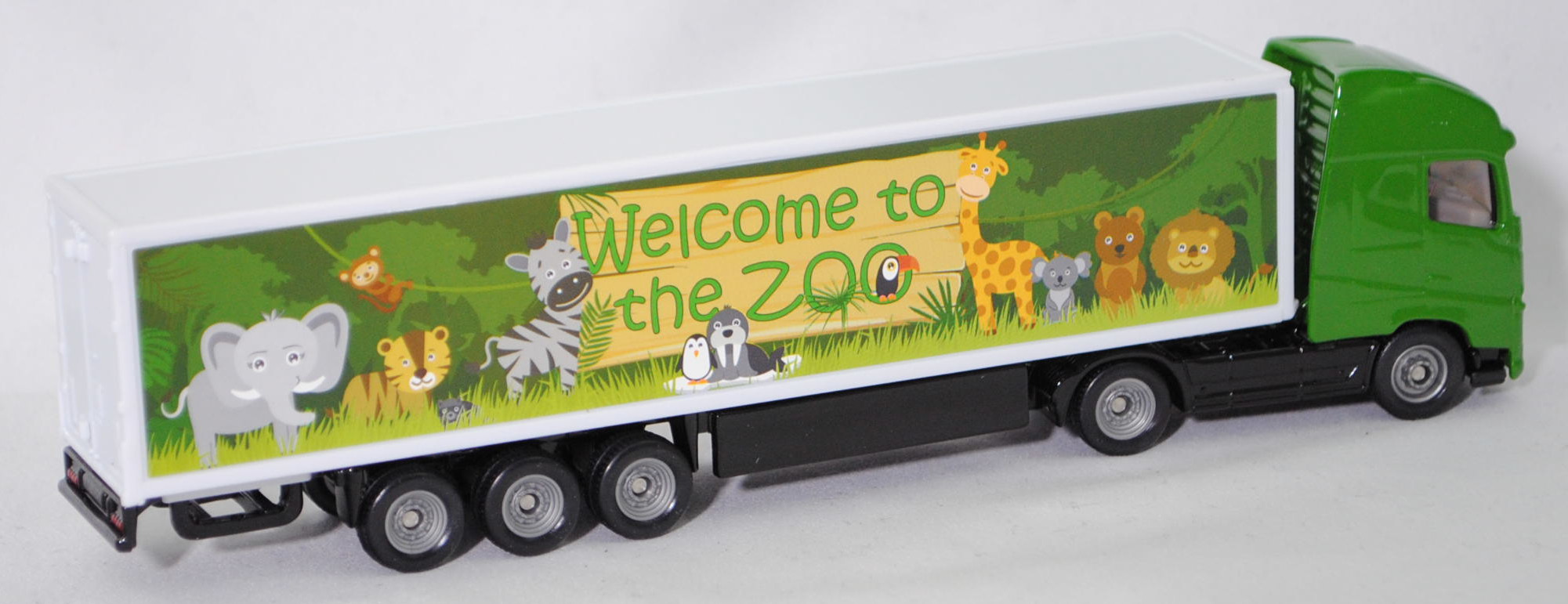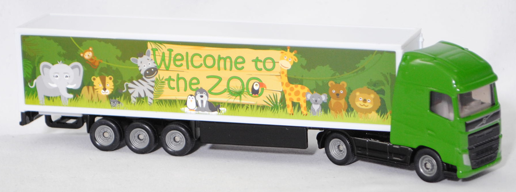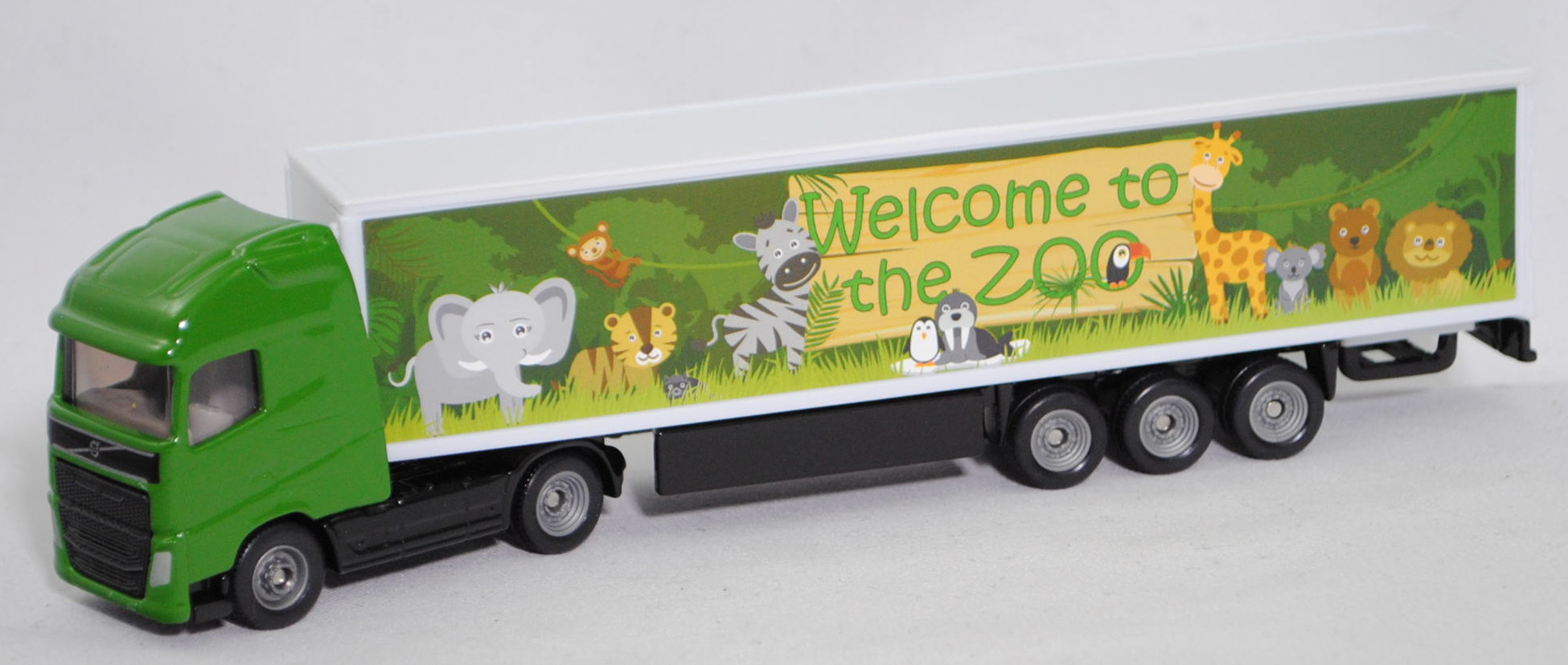 00011 Volvo FH16 750 Globetrotter-XL 4x2 (3. Generation, Baureihe FH, Globetrotter XL-Fahrerhaus (CAB-XHSL), Vorfacelift, Kühlergrillgitter mit zwei hohen Lüftungsschlitzen, große trapezförmige Frontscheinwerfer und Nebelscheinwerfer, analoge Anzeigen für Geschwindigkeit und Drehzahl, Hinterradantrieb, Motor: Volvo Tyo D16K750 Abgasstufe Euro 5 wassergekühlter Sechszylinder-Reihen-Viertakt-Biturbo-Diesel mit Common-Rail-Einspritzung und eine obenliegende Nockenwelle (OHC = Overhead Camshaft) sowie 4 Ventile pro Zylinder und 16120 cm³ sowie 750 PS, Radstand 3500 mm, Länge 5690 mm, Modell 2013-2020) Sattelzugmaschine mit 3-Achs-Koffer-Sattelauflieger (Koffer-Sattelzug), Sattelzugmaschine: Fahrerhaus und Stoßfänger hell-grasgrün, innen lichtgrau, Sitze lichtgrau, Lenkrad integriert, Fahrgestell und Chassis schwarz, C27c / C28c geschlossen silbergrau; Auflieger: Kofferaufbau reinweiß, Aufkleber Welcome to / the ZOO und Tiere aus dem Zoo auf den Seiten des Koffers, Fahrgestell schwarz, seitliche geschlossene Schutzvorrichtung schwarz, C28c geschlossen silbergrau, SIKU SUPER, ca. 1:87, P29f (EAN 4006874016273)