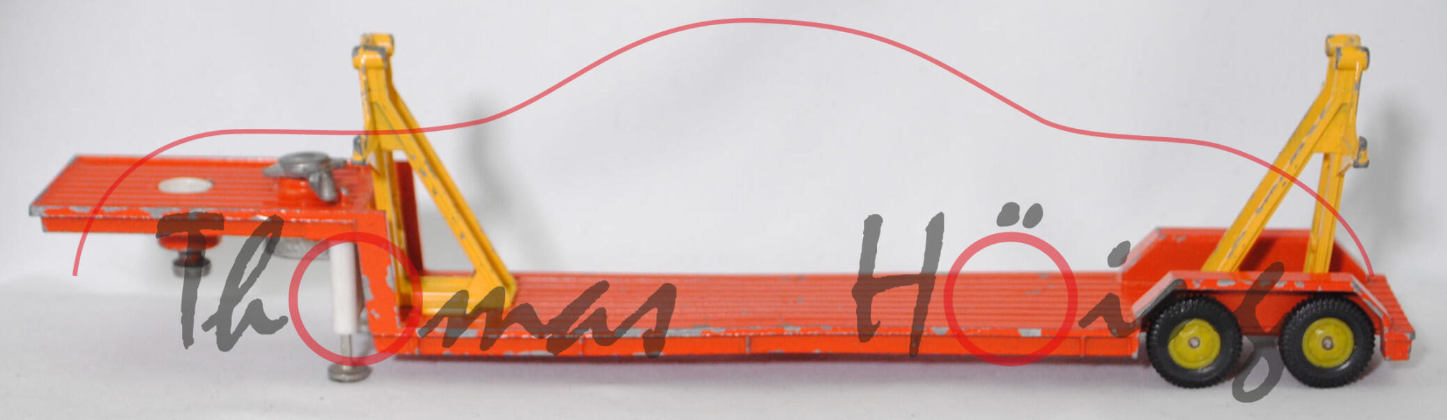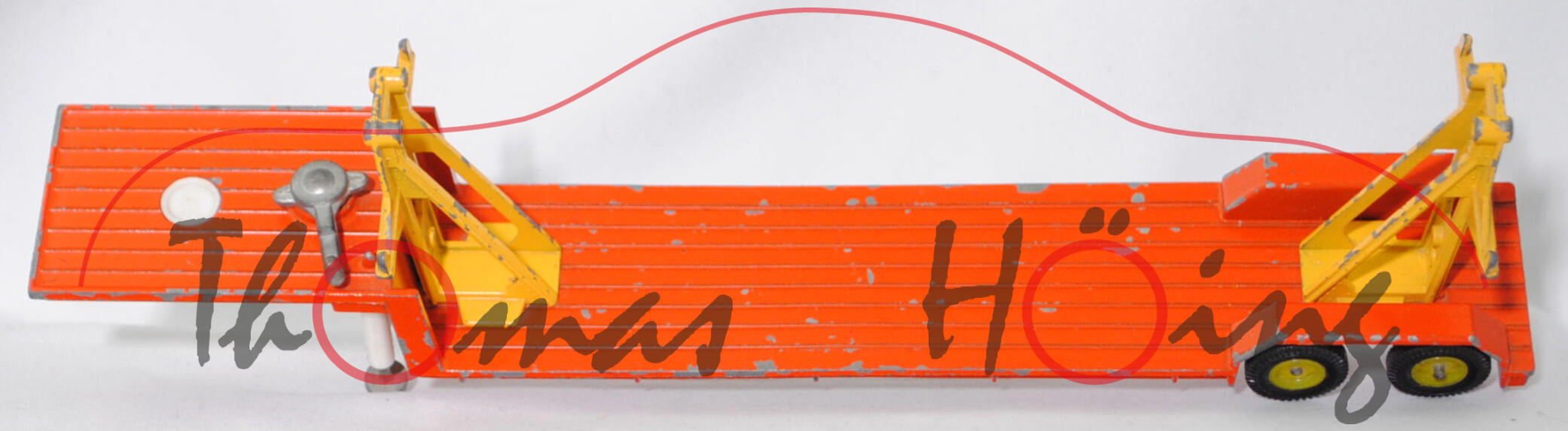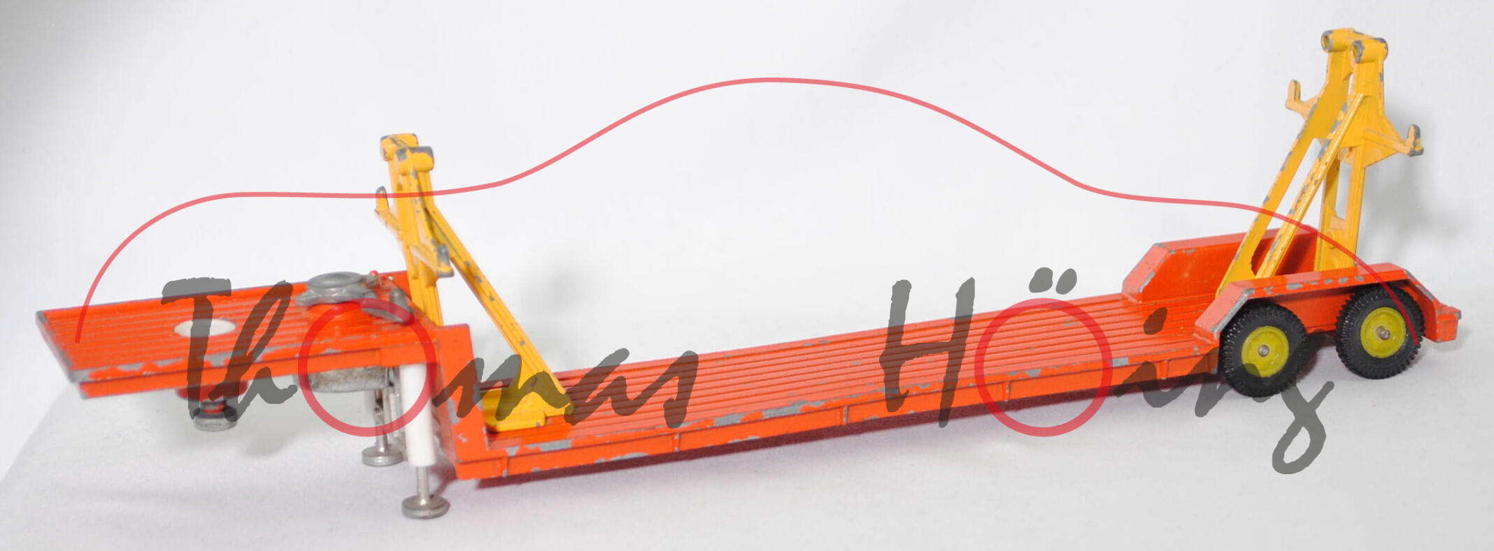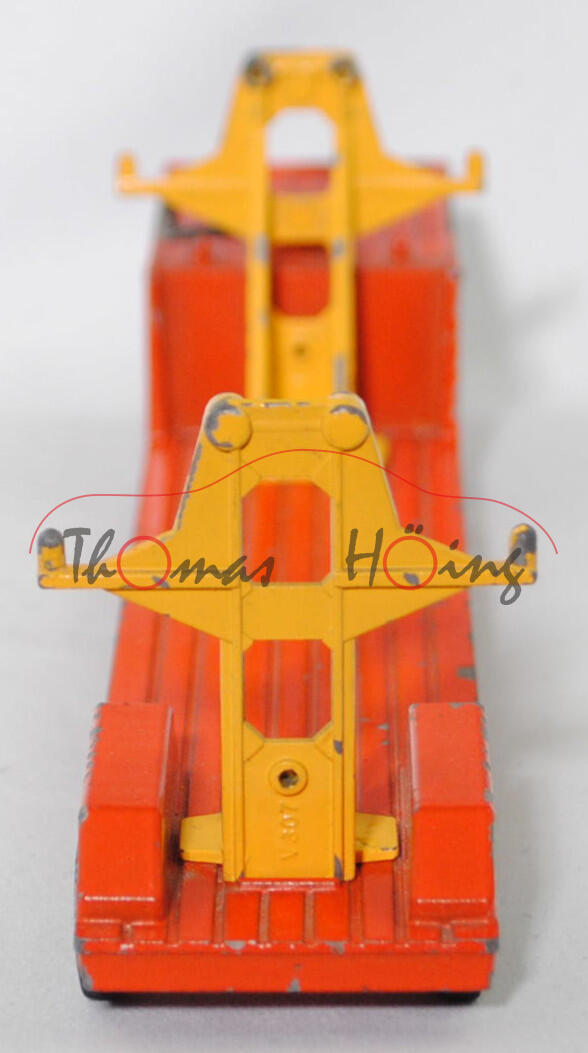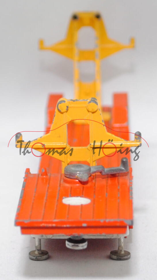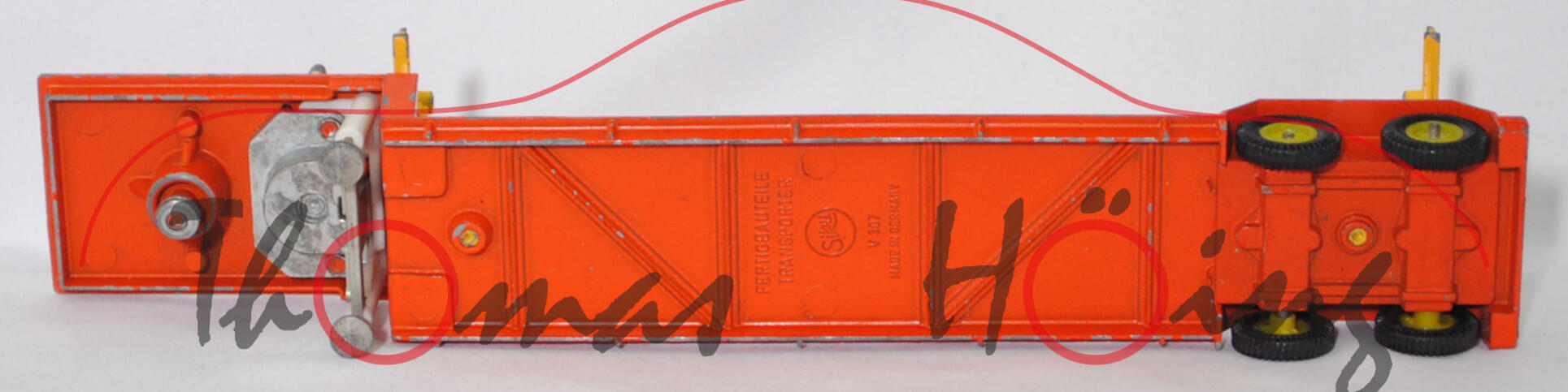 00012a Sattelauflieger für Fertigbauteile der 4-fach-Garage, Tieflader reinorange, Hydraulikstempel reinweiß, Garagenhalterung signalgelb, Garagenhalterung am Fuß mit jeweils einem geschlossenen Loch, Garagenhalterung am unteren senkrechten Steg der Füße mit geschlossenem Loch, 2 runde Metall-Haltestangen oben an den Garagenhalterungen, 2 breite Metall-Haltebalken außen an den Garagenhalterungen zur Ladungssicherung, Bpr. V 307, Germ, hintere Achshalterung vom Auflieger vorne mit geschlossenem Loch, Plastikfelgen schwefelgelb mit mittelgroßen Gummireifen; ohne Ladegut, SIKU-SUPER-ZINKGUSS 1:60 (V-SERIE), ca. 1:58, sc (Modell mit Farbabplatzer, Hanomag-Henschel F 201 S-2A mSk weg, Metall-Haltestangen und breite Metall-Haltebalken weg, Ladegut fehlt, Bauanleitung weg) (EAN 4006874003075)