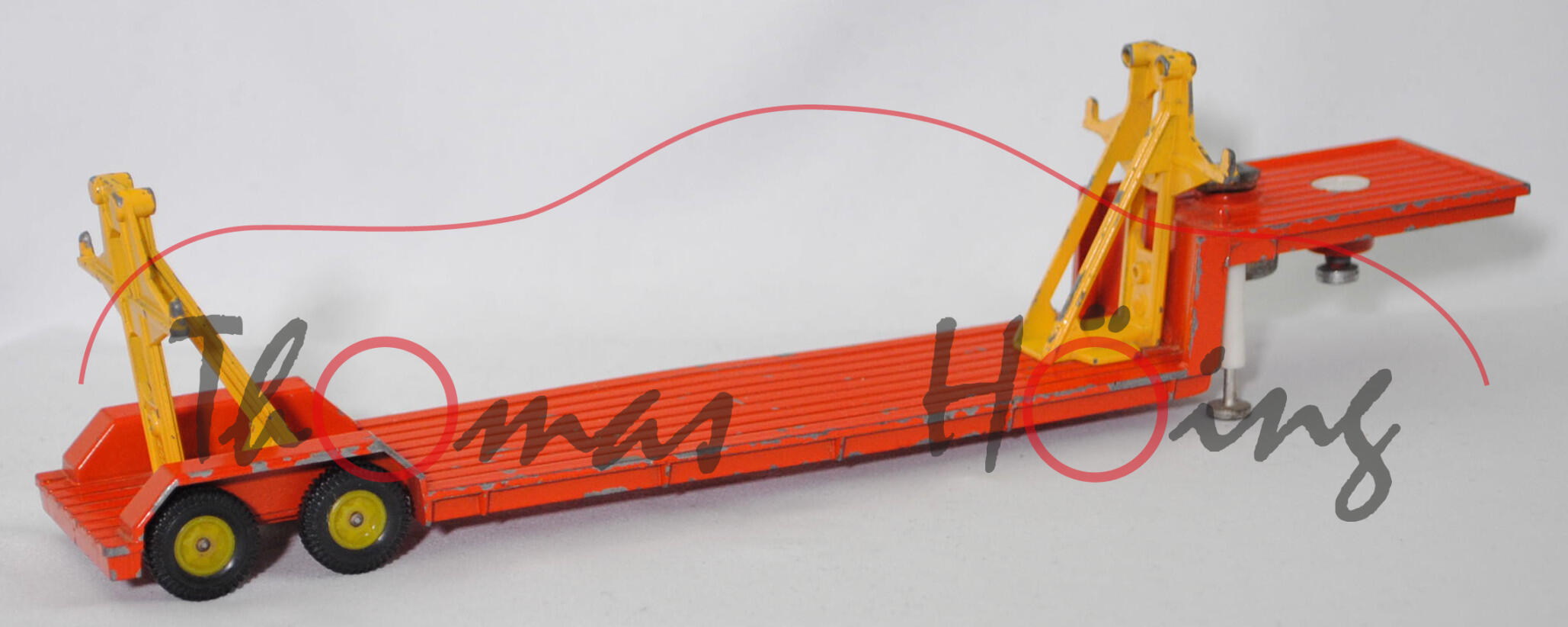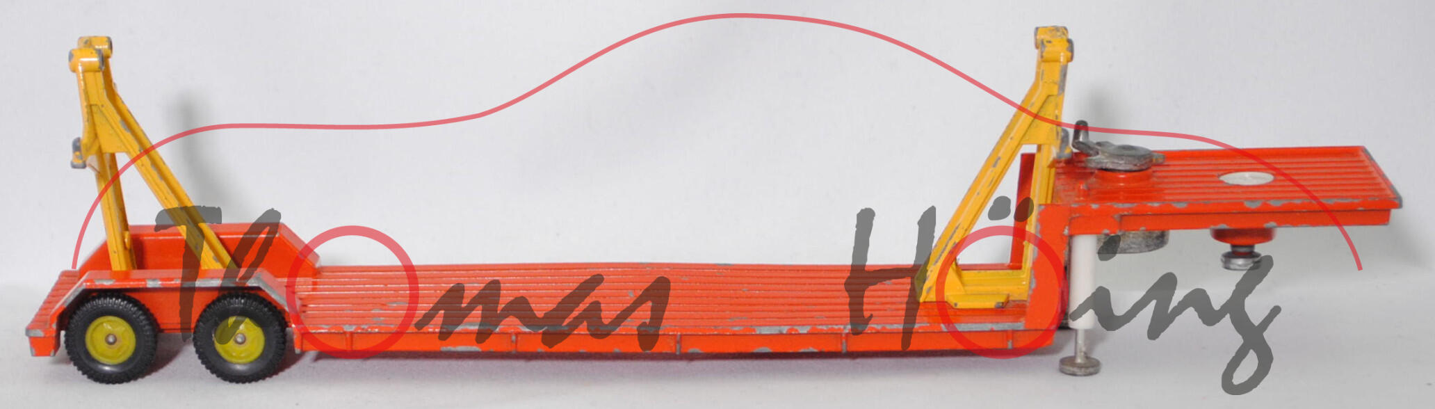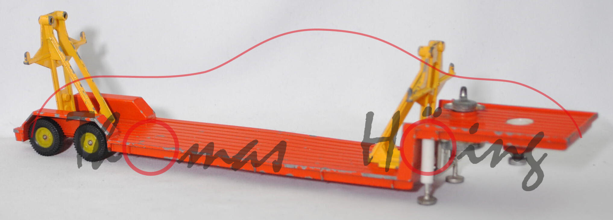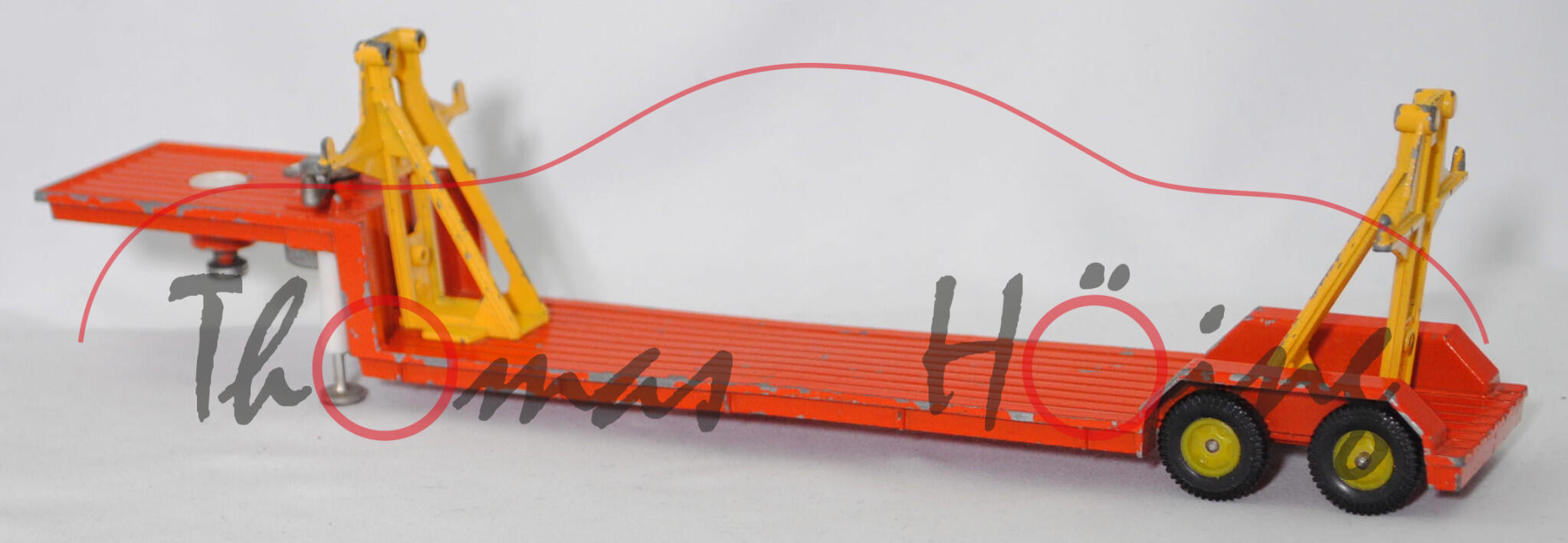 00012a Sattelauflieger für Fertigbauteile der 4-fach-Garage, Tieflader reinorange, Hydraulikstempel reinweiß, Garagenhalterung signalgelb, Garagenhalterung am Fuß mit jeweils einem geschlossenen Loch, Garagenhalterung am unteren senkrechten Steg der Füße mit geschlossenem Loch, 2 runde Metall-Haltestangen oben an den Garagenhalterungen, 2 breite Metall-Haltebalken außen an den Garagenhalterungen zur Ladungssicherung, Bpr. V 307, Germ, hintere Achshalterung vom Auflieger vorne mit geschlossenem Loch, Plastikfelgen schwefelgelb mit mittelgroßen Gummireifen; ohne Ladegut, SIKU-SUPER-ZINKGUSS 1:60 (V-SERIE), ca. 1:58, sc (Modell mit Farbabplatzer, Hanomag-Henschel F 201 S-2A mSk weg, Metall-Haltestangen und breite Metall-Haltebalken weg, Ladegut fehlt, Bauanleitung weg) (EAN 4006874003075)