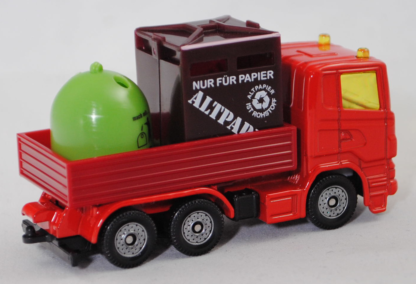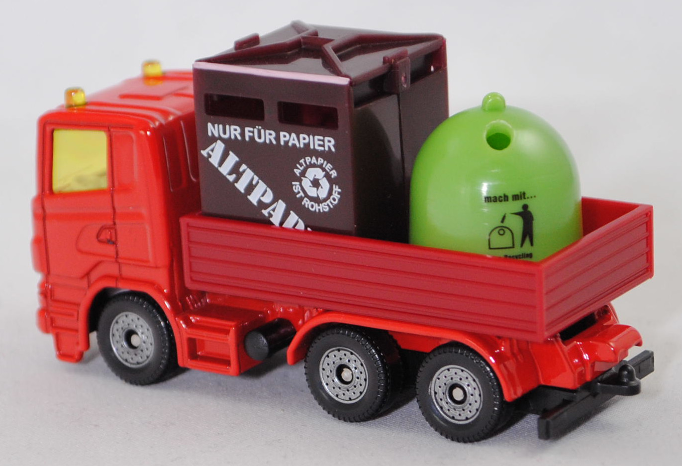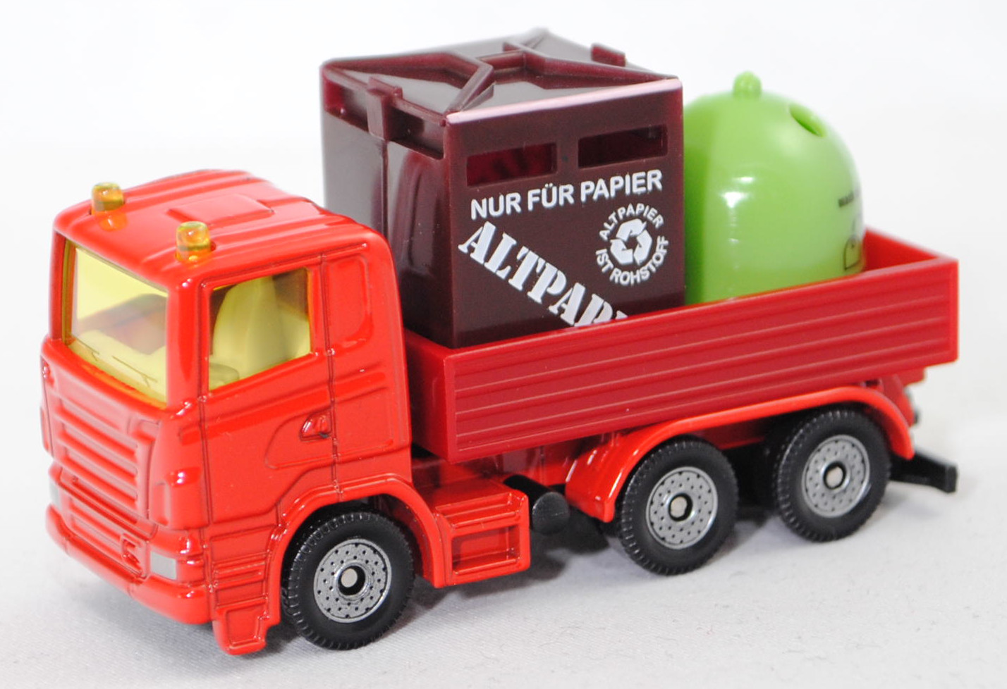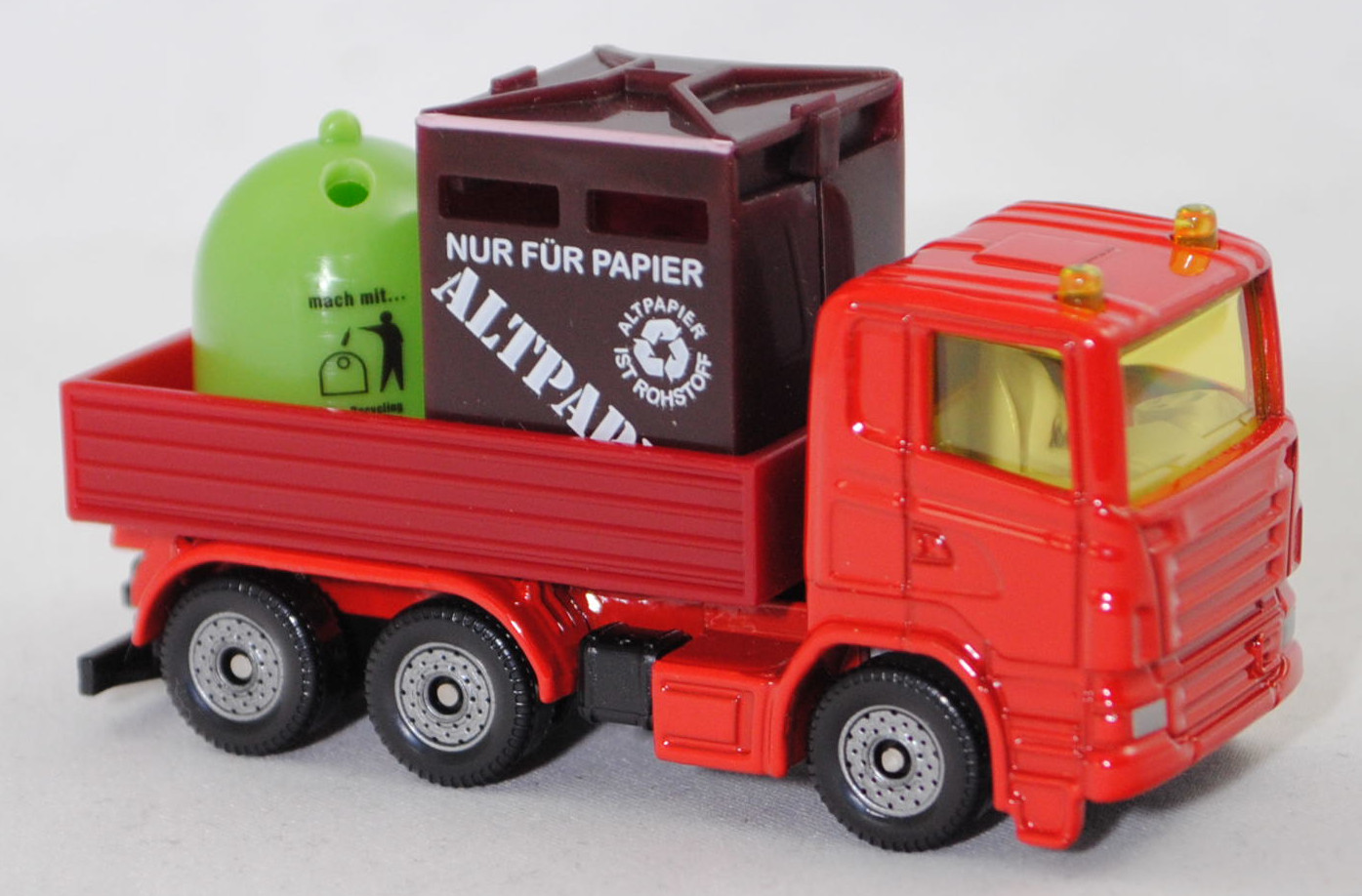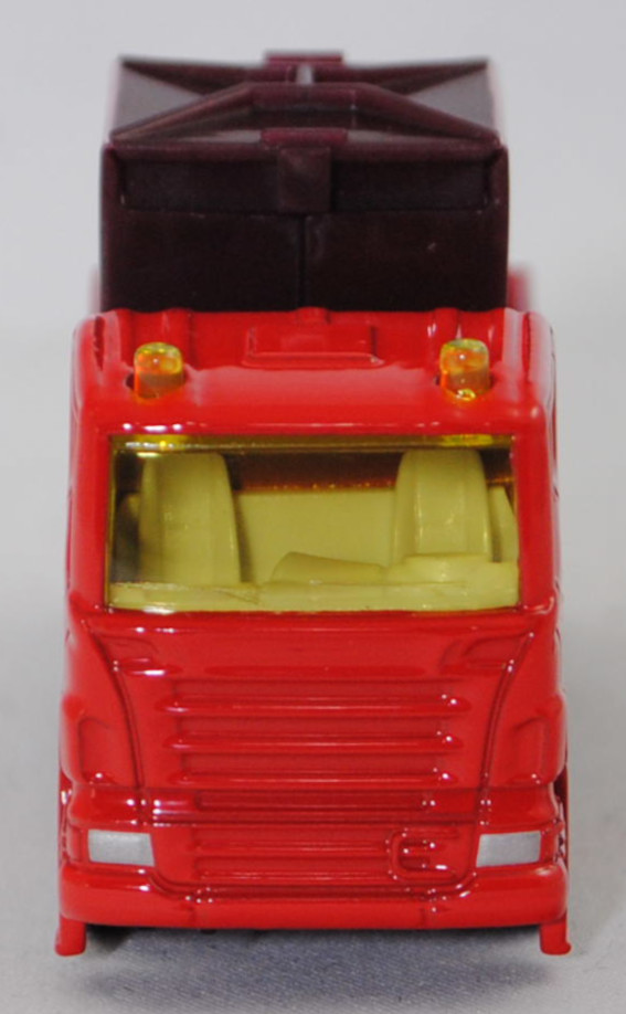 00013 Scania R380 (Scania Serie 5 bzw. PRT-Serie, 1. Generation R-Serie, Baureihe R für hoch montierte Frontlenker-Fahrerhäuser, Typ CR16, Day cab, mittellanges niedriges Frontlenker-Fahrerhaus (für niedriges Gewicht und hohes Ladevolumen), Kühlergrill mit 6 Lüftungsschlitzen, Motor: Scania Typ DC 12 18 380 (Euro 5) wassergekühlter Sechszylinder-Reihen-Viertakt-Diesel mit elektrisch und hydraulisch gesteuerter Pumpe-Düse-Einspritzung HPI) sowie Abgasturbolader (ATL) mit variabler Turbinen-Geometrie (VTG) und eine zentrale Nockenwelle sowie OHV-Ventilsteuerung (Overhead valve engine) und 4 Ventile pro Zylinder sowie Ladeluftkühler und 11716 cm³ sowie 380 PS, Modell 2007-2009) Recycling-Transporter, dunkel-verkehrsrot, innen reinweiß, Sitze reinweiß, Lenkrad integriert, 2 Gelblichter auf dem Dach des Fahrerhauses, Frontscheinwerfer silber, unterer Teil des Kühlergrills mit zusätzlicher Prägung eines liegenden U-Bügels auf der linken Seite, Stoßfänger vorne durchgehend, Chassis geht bis an die Hinterkante des Stoßfängers, CE-Zeichen vor der Vorderachse von hinten aus lesbar, Bpr. mit Adresse, Druck Chargennummer auf dem Chassis, Verglasung gelb, C36, Ladegut: Container für Altpapier und Altglas, SIKU SUPER, ca. 1:89, P29f (EAN 4006874008285)