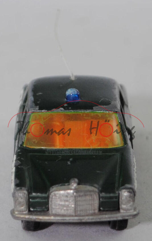 00015 Mercedes-Benz 250/8 (1. Generation, Baureihe W 114, Serie 1, viertürige Stufenheck-Limousine mit 5 Sitzplätzen, Konstruktionsbezeichnung W 114 V 25, Baumuster 114.010, auch Strich-Acht genannt, schmale hohe Kühlermaske, Nummernschild vorne unter der Stoßstange, mit Dreiecks-Ausstellfenstern vorne, glatte Rückleuchten, Hinterradantrieb, Motor: Mercedes-Benz Typ M 114 V 25 wassergekühlter Sechszylinder-Reihen-Viertakt-Otto mit 2 Register-Fallstromvergaser Zenith 35/40 INAT und Startautomatik sowie eine obenliegende Nockenwelle (SOHC = Single Overhead Camshaft) und 2 Ventile pro Zylinder sowie 2496 cm³ und 130 PS, Motor Baumuster 114.920, Radstand 2750 mm, Länge 4680 mm, Modell 1967-1972) Peterwagen (Polizei Hamburg, Typ Funkstreifenwagen FuStW), Karosserie tannengrün (vgl. RAL 6009 beim Original), Kotflügel vorne und hinten cremeweiß, innen rotorange, Sitze rotorange, Lenkrad rotorange, 1 Blaulicht vorne mittig auf dem Dach, transparente Antenne hinten mittig auf dem Dach, Bpr. V309, Germ, Verglasung gelbgrün, R9 (Mercedes-Benz Stahlblechräder mit Tiefbettfelgen Größe 5,5 J x 14 HB ET 30 und Lochkreis 5 x 112 sowie Reifen 175 H 14 (6 PR) und verchromte Radkappen / Radzierblenden im 12-Loch-Design mit Lackierung in Wagenfarbe mittig und verchromter Mercedes-Benz-Stern in der Mitte), SIKU-SUPER-ZINKGUSS 1:60 (V-SERIE), ca. 1:61, vsc (mit Lackschäden) (EAN 4006874002504)