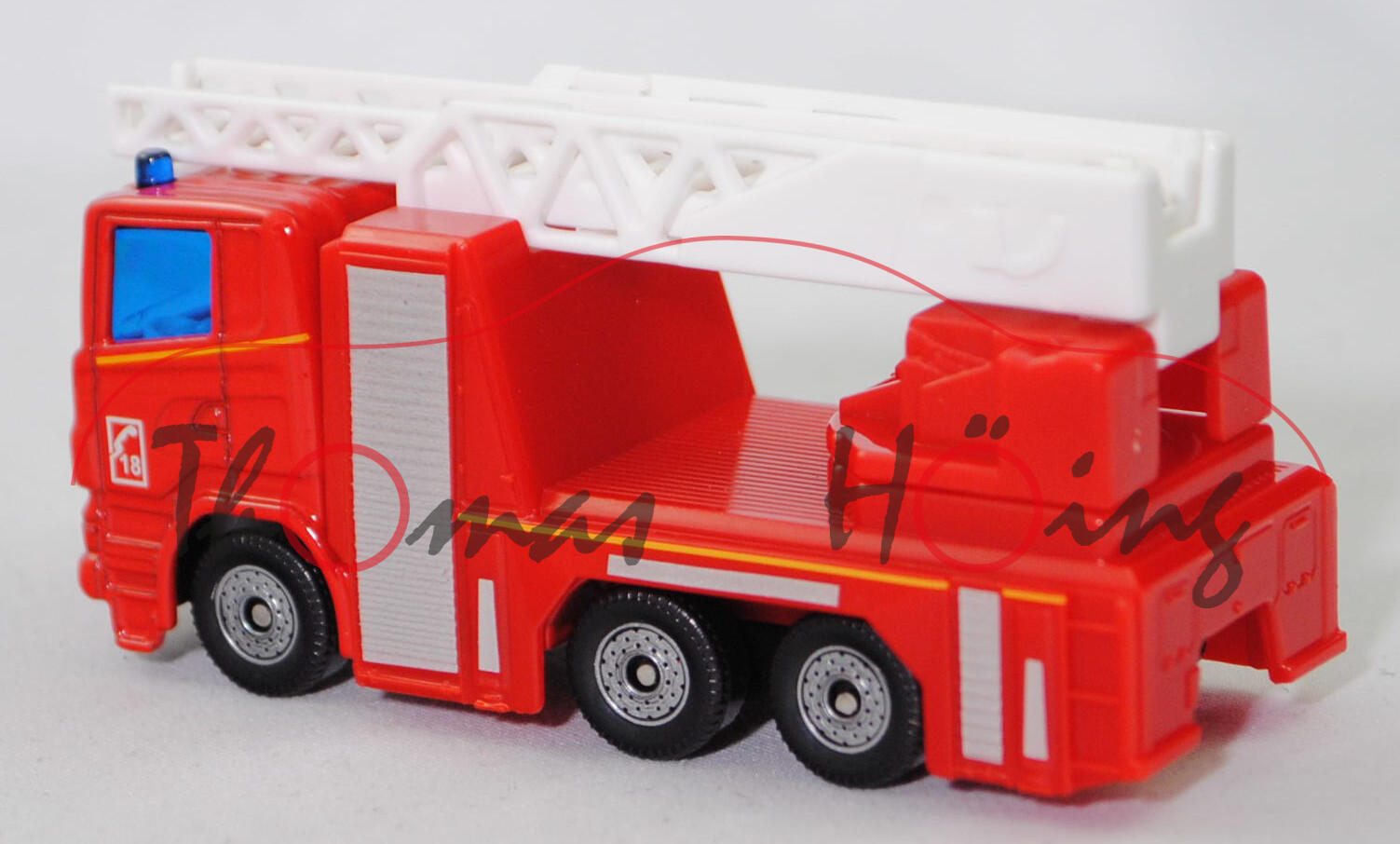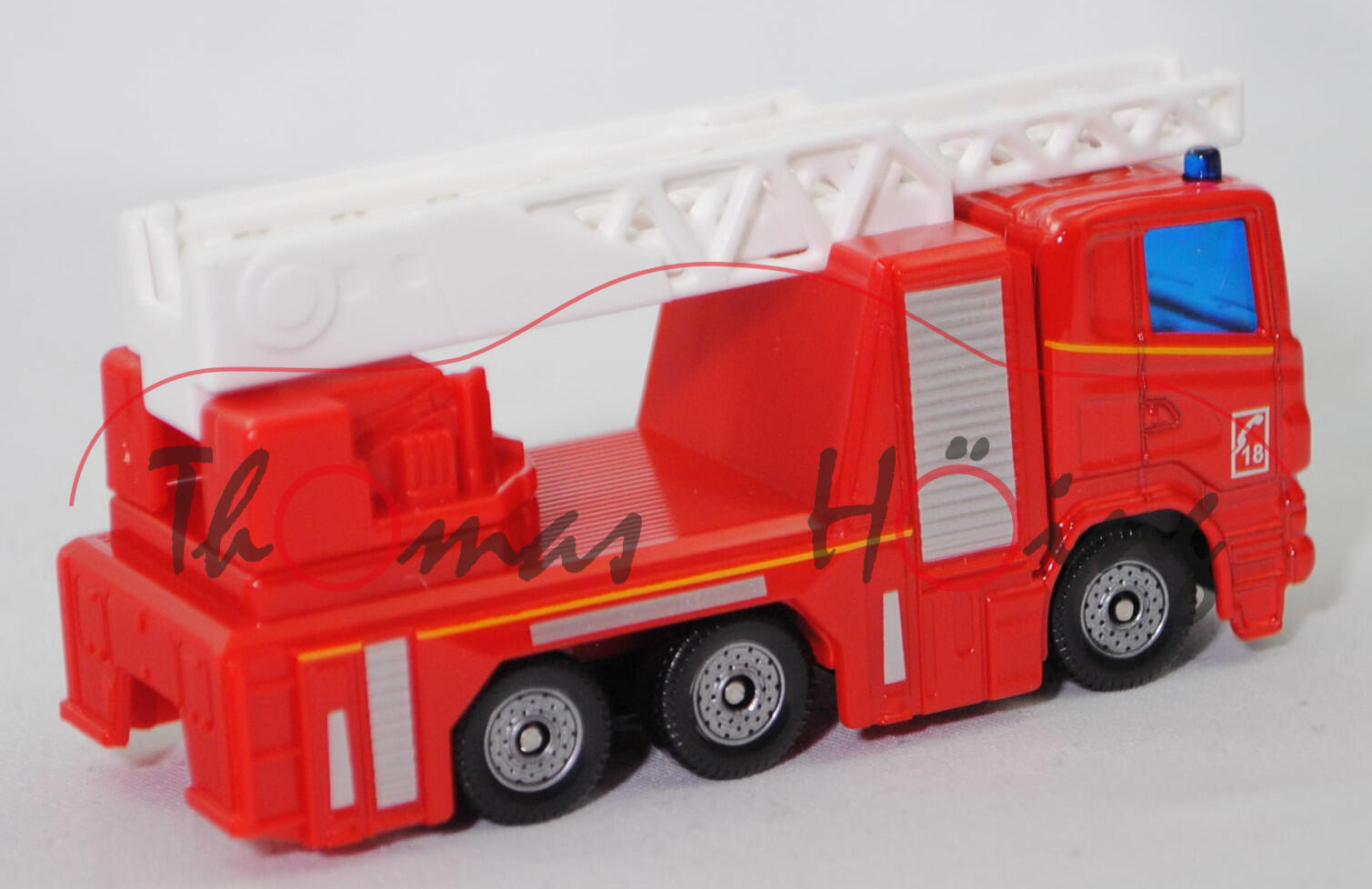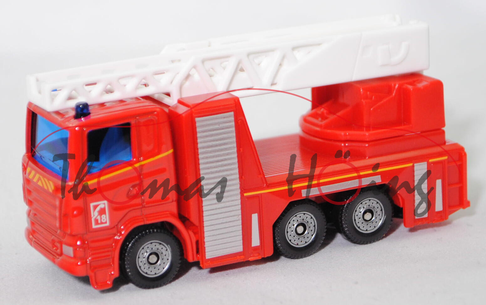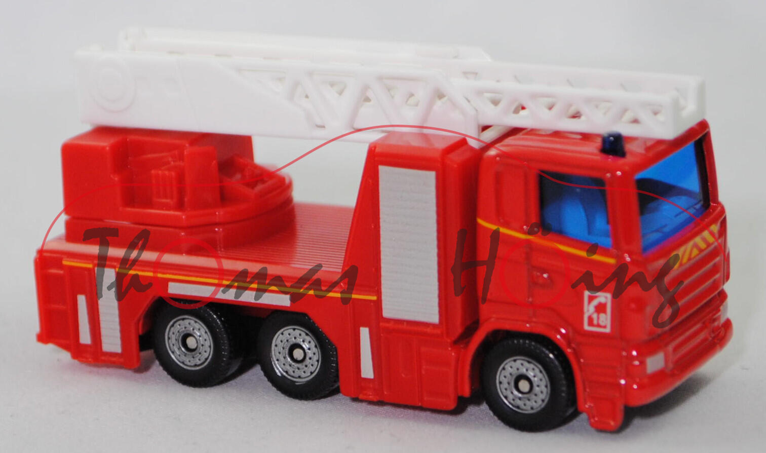 00100 F Scania R380 (Scania Serie 5 bzw. PRT-Serie, 1. Generation R-Serie, Baureihe R für hoch montierte Frontlenker-Fahrerhäuser, Typ CR16, Day cab, mittellanges niedriges Frontlenker-Fahrerhaus (für niedriges Gewicht und hohes Ladevolumen), Kühlergrill mit 6 Lüftungsschlitzen, Motor: Scania Typ DC 12 18 380 (Euro 5) wassergekühlter Sechszylinder-Reihen-Viertakt-Diesel mit elektrisch und hydraulisch gesteuerter Pumpe-Düse-Einspritzung HPI) sowie Abgasturbolader (ATL) mit variabler Turbinen-Geometrie (VTG) und eine zentrale Nockenwelle sowie OHV-Ventilsteuerung (Overhead valve engine) und 4 Ventile pro Zylinder sowie Ladeluftkühler und 11716 cm³ sowie 380 PS, Modell 2007-2009) Fire Truck (Feuerwehr-Drehleiter), verkehrsrot, innen reinweiß, Lenkrad integriert, Druck C 18 in grauweiß auf den Türen, Druck maisgelbe Streifen vorne und auf den Seiten des Fahrerhauses sowie auf den Seiten des Aufbaues, seitliche Rolläden und angedeutete Stützen silber bedruckt, unterer Teil des Kühlergrills mit zusätzlicher Prägung eines liegenden U-Bügels auf der linken Seite, Chassis verlängert durch Bügel bis zum vorderen Stoßfänger zur Befestigung des Fahrerhauses, CE-Zeichen vor der Vorderachse von hinten aus lesbar, Bpr. mit Adresse, Druck Chargennummer auf dem Chassis, C36, SIKU SUPER, ca. 1:89, P29f (Limited Edition / FRANCE SPECIAL) (EAN 4006874110148)