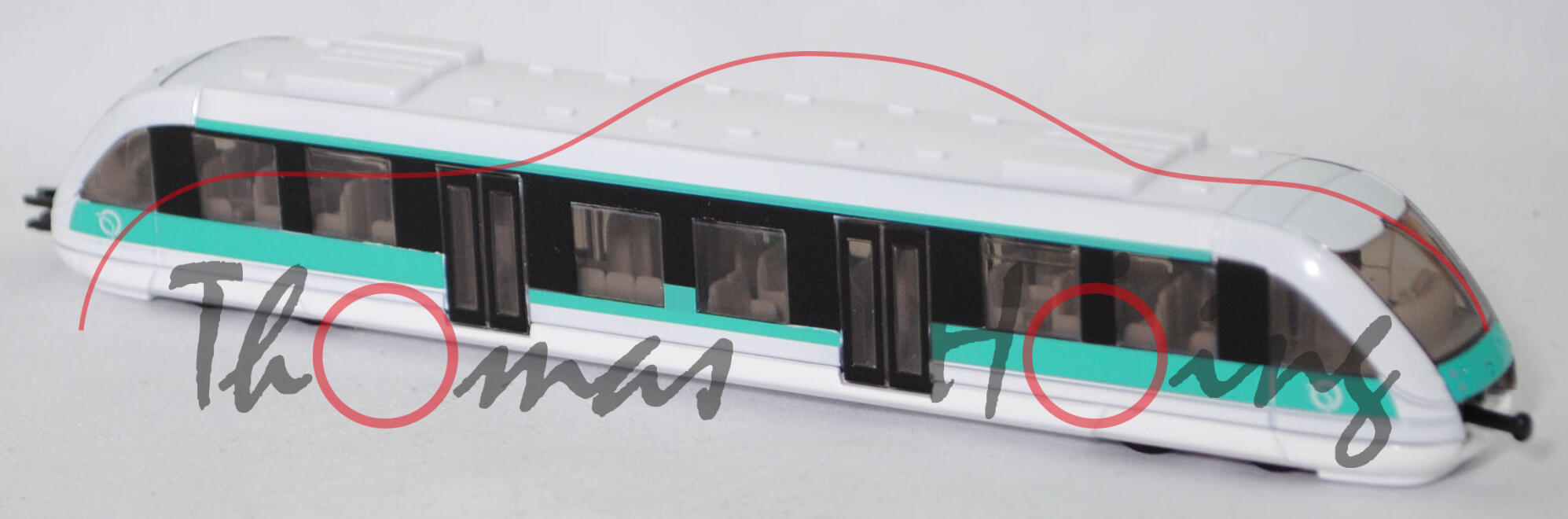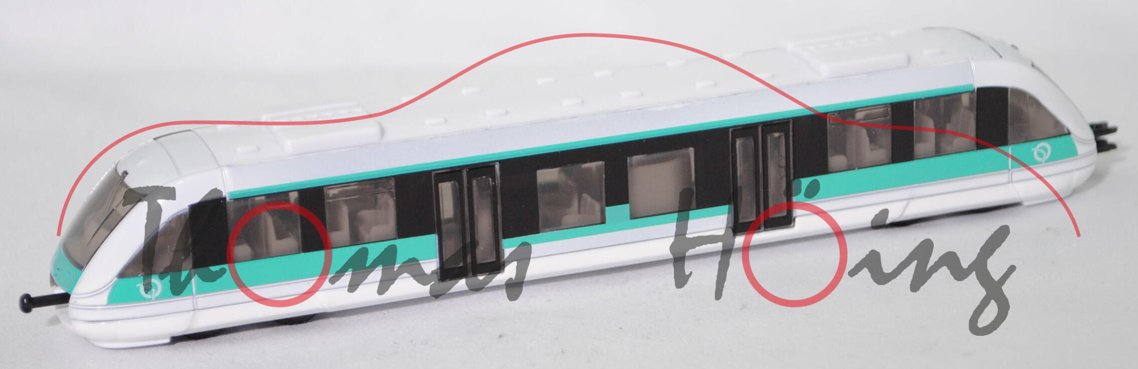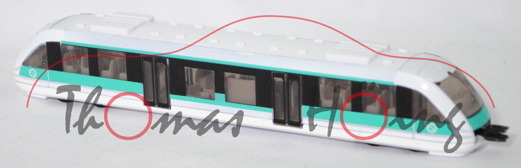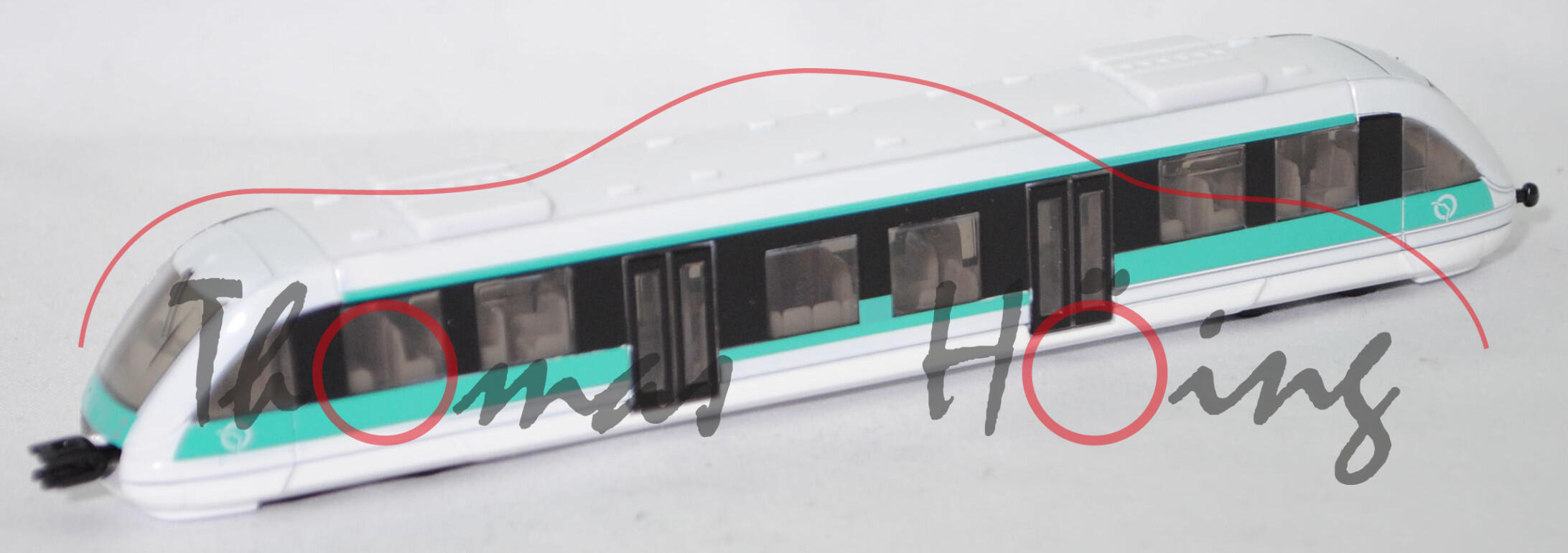 00103 F Nahverkehrszug (vgl. Regionaltriebwagen Alstom Coradia LINT 27, Baureihe 640, einteiliger Dieseltriebwagen, Modell von Siku um 2 Seitenfenster gekürzt, Modell 1999-, Epoche V), reinweiß, innen kieselgrau, Druck blass-türkisblauer Streifen auf den Seiten über und unter den Fenstern wobei RATP-Logo in Wagenfarbe im unteren Bereich an den Enden durchschimmert, Druck blass-türkisblauer Streifen vorne und hinten, seitliche Fensterrahmen schwarz, Dach im vorderen und hinteren Bereich reinweiß bedruckt, Dach mittig reinweiß, Kupplung mit seitlichen Führungen, Bpr. CE-Zeichen vorne zwischen den hinteren Schienenrädern und Adresse im hinteren Teil, Bpr. ohne Art.-Nr., Druck Chargennummer in schwarz auf dem Chassis, schwarze Schienenräder, SIKU SUPER 1:120, ca. 1:114, P29f (Limited Edition / FRANCE SPECIAL) (EAN 4006874116461)