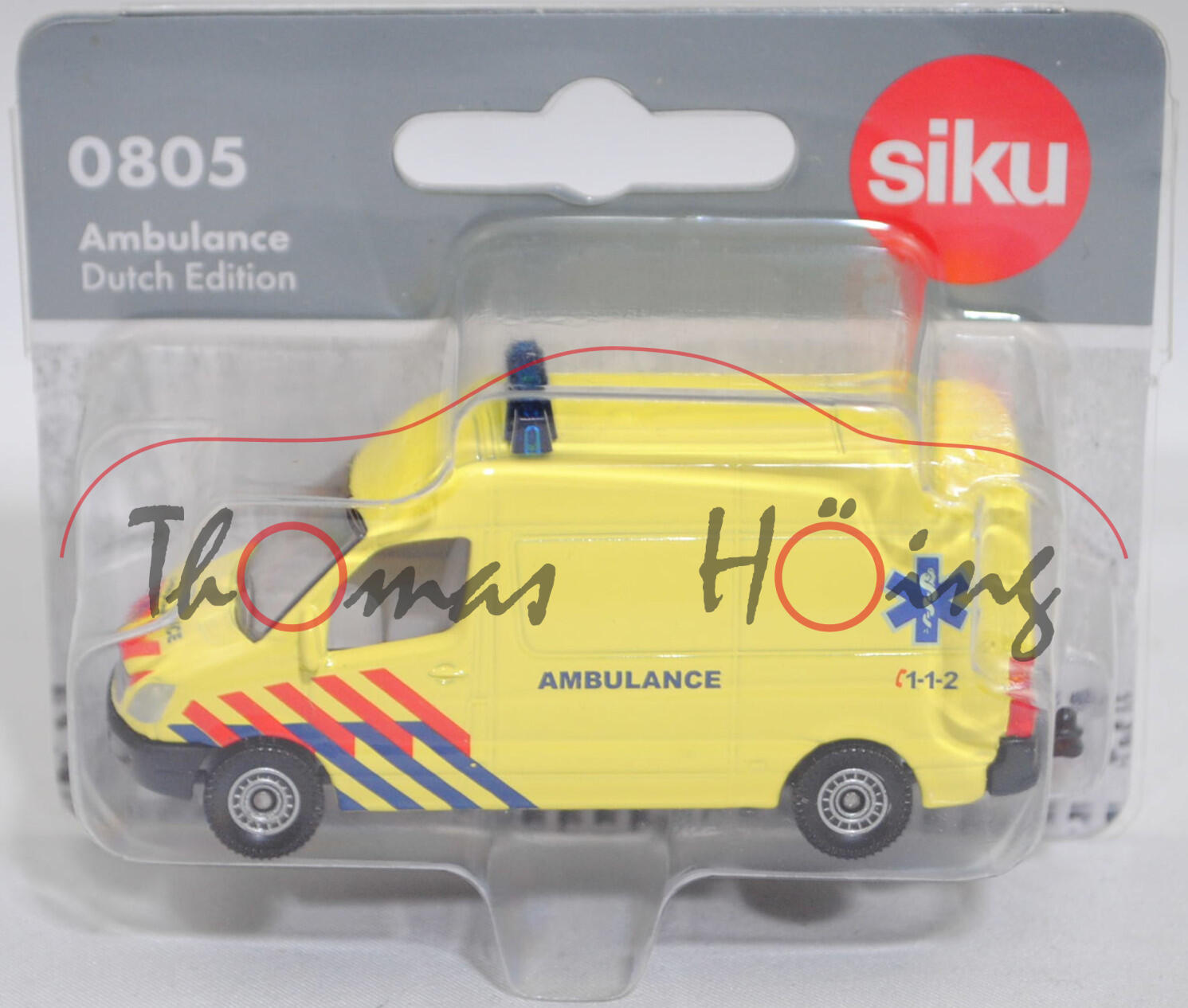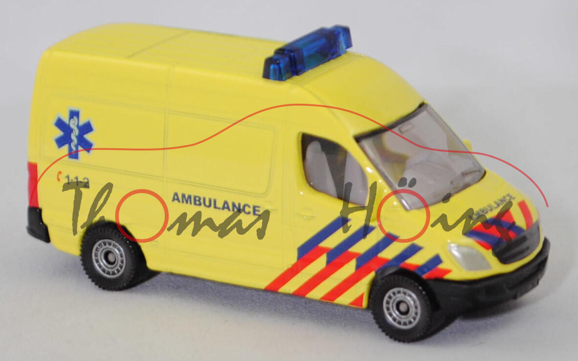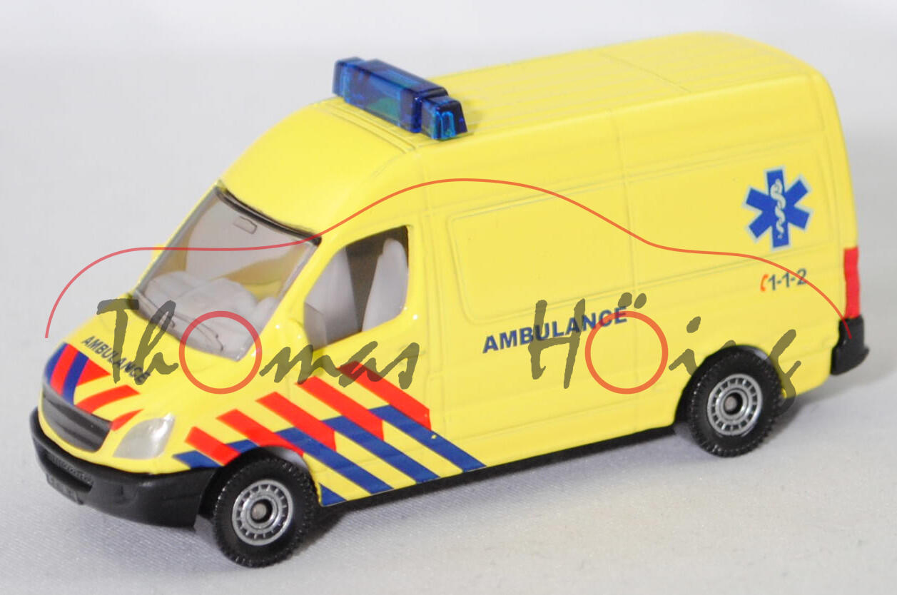 00305 NL5 Mercedes-Benz Sprinter II (2. Generation, interne Baureihenbezeichnung NCV 3 (NCV = New Concept Van), Baureihe Sprinter W 906, Typ Standard L2H2 mit mittlerem Radstand und Hochdach, Vor-MoPf (vor Modellpflege, Vorfacelift), Kühlergrill mit 2 waagerechten Lamellen, untere Kühlergrillverkleidung bis unter die Frontscheinwerfer verbreitert, Stoßfänger vorne in einer Höhe zum Radkasten geführt, Stoßfänger vorne mittig in Form eines offenen Mundes mit Ausbuchtungen für die Nebelscheinwerfer, Hinterradantrieb, Motor: Mercedes-Benz OM 646 DE 22 LA wassergekühlter Vierzylinder-Reihen-Viertakt-Diesel mit Bosch Common-Rail-Direkteinspritzung und Abgasturbolader mit variabler Turbinen-Geometrie (VTG) sowie zwei obenliegende Nockenwellen (DOHC = Double Overhead Camshaft) und 4 Ventile pro Zylinder sowie Ladeluftkühler und 2148 cm³ sowie 129 PS, Baumuster Motor 646.986, Radstand 3665 mm, Laderaumlänge 3265 mm, Gesamtlänge 5910 mm, Modell 2006-2009) 213 CDI / 313 CDI Kastenwagen Krankenwagen, leuchtgelb, innen reinweiß, Sitze reinweiß, Lenkrad integriert, Druck AMBULANCE C 1-1-2 in saphirblau/karminrot und Äskulap Stab in hell-ultramarinblau/reinweiß auf den Seiten, Druck AMBULANCE in saphirblau auf der Motorhaube, Druck AMBULANCE C 1-1-2 in saphirblau/karminrot und 2x Äskulap Stab in hell-ultramarinblau/reinweiß hinten auf den Türen, Druck Streifen in saphirblau/karminrot auf allen Seiten, Frontscheinwerfer silber lackiert, ohne Mercedes-Stern im Kühlerrill, hohe unbedruckte Blaulichtleiste auf dem Dach, Heckleuchten rot lackiert, Bpr. mit Adresse, Druck Chargennummer auf dem Chassis, C80 schwarz mit silbernem Druck (Mercedes-Benz Stahlscheibenräder im 18-Loch-Design Größe 5,5 J x 16 H2 ET 51 mit Lochkreis 6 x 130 (Teilenummer A 001 401 35 02 9206, Farbcode silber) und Nabenkappe / Radschraubenabdeckung (Teilenummer A 906 401 00 25, Farbcode 9B51 anthrazit) sowie Reifen LT 205/75 R 16 110/108R 6PR), SIKU SUPER, ca. 1:77, P29f (Limited Edition / DUTCH SPECIAL) (EAN 4006874508051)