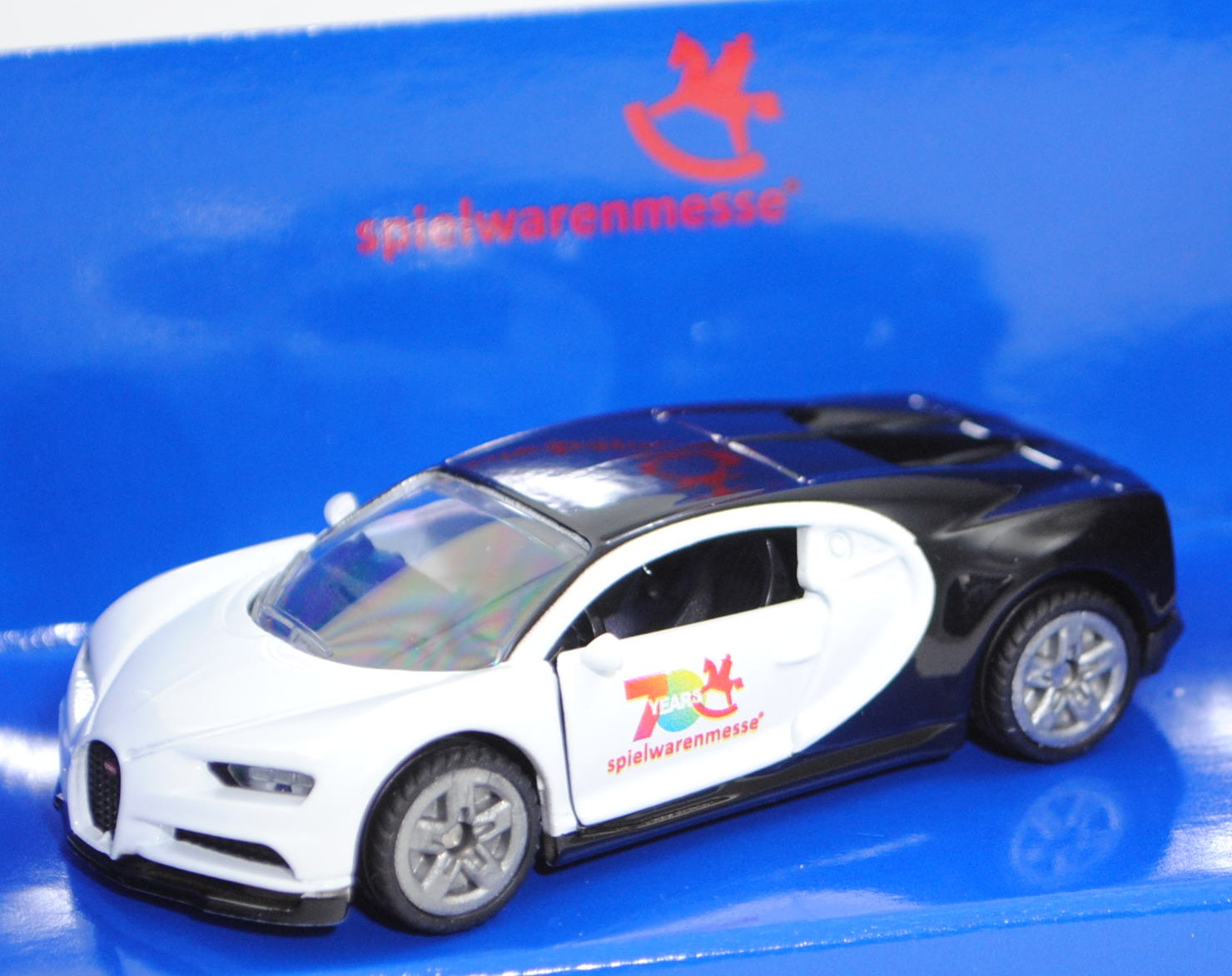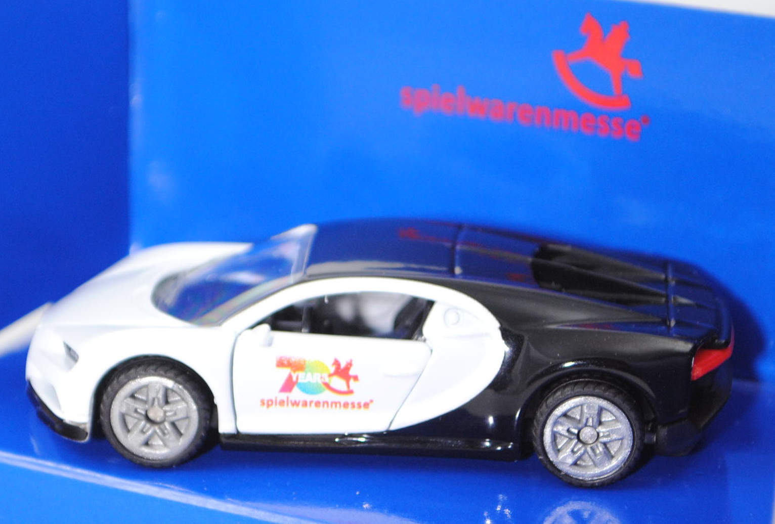 00401 Bugatti Chiron (1. Generation, Modell 2016-2024), reinweiß/schwarz, 70 YEARS / spielwarenmesse®, SIKU SUPER, 1:57, Werbeschachtel (Limited Edition 2019)
