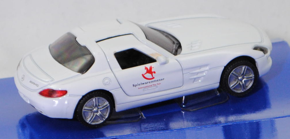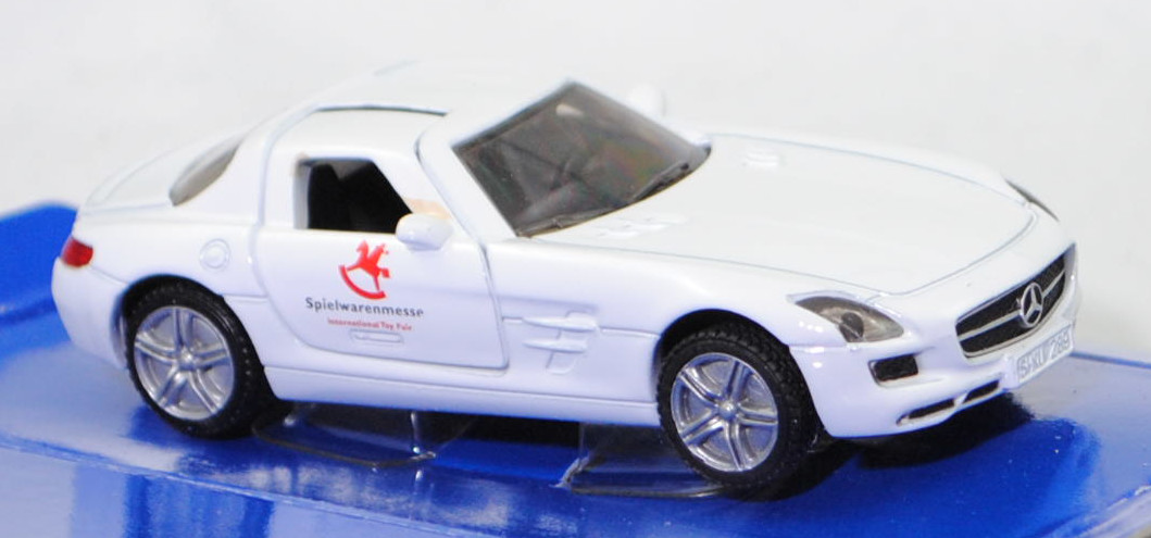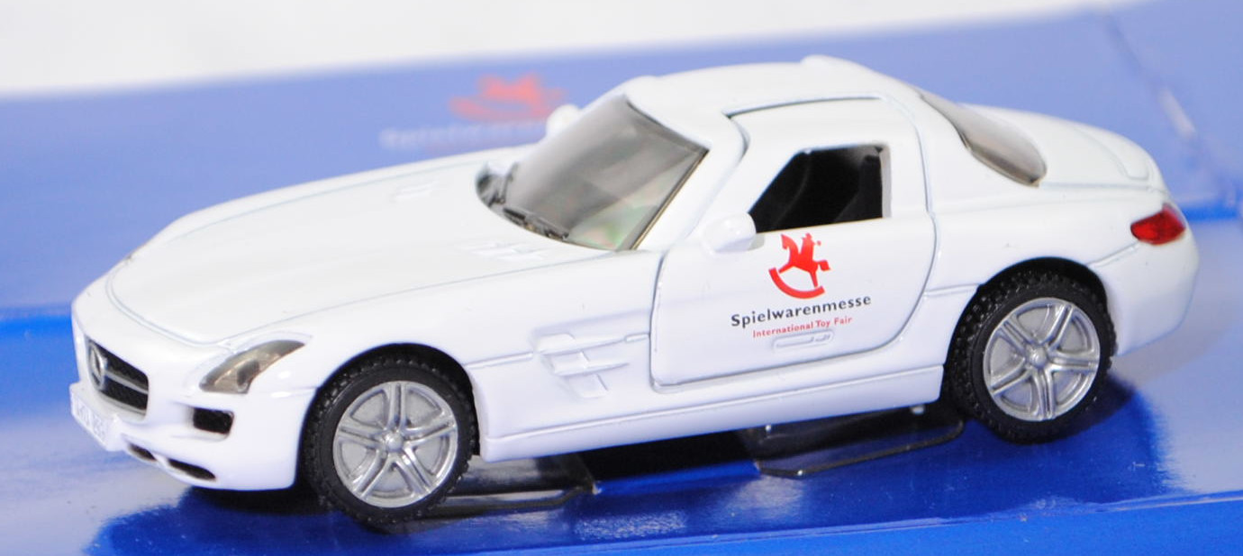 00401 Mercedes-Benz SLS AMG Coupé (1. Generation, Baureihe SLS AMG Coupé, interne Baureihenbezeichnung C 197, Konstruktionsbezeichnung C 197 E 63 A, Baumuster 197.377, zweitüriger Sportwagen als Coupé mit 2 Sitzplätzen, Ausstattungslinie SLS AMG Coupé: Bi-Xenon-Scheinwerfer mit integriertem LED-Tagfahrlicht und LED-Blinkleuchten sowie Scheinwerferreinigungsanlage + Blinkleuchten in den Außenspiegeln integriert + AMG Sportfahrwerk mit Doppelquerlenkern an Vorder- und Hinterachse + AMG Sport-Abgasanlage mit zwei integrierten verchromten Endrohren + Heckdeckelfernentriegelung + PARKTRONIC, Sonderausstattung gegen Mehrpreis: AMG Leichtmetallräder im 5-Doppelspeichen-Design titangrau lackiert und glanzgedreht (Code 764), AMG SPEEDSHIFT DCT 7-Gang-Sportgetriebe mit 4 Fahrprogrammen (Automatik), Hinterradantrieb, Motor: Mercedes-Benz Typ M 159 E 63 wassergekühlter Achtzylinder-V-Viertakt-Otto mit Saugrohreinspritzung und zwei obenliegende Nockenwellen (DOHC = Double Overhead Camshaft) je Zylinderbank sowie 4 Ventile pro Zylinder und 6208 cm³ sowie 571 PS, Baumuster Motor M 159.980, Radstand 2680 mm, Länge 4638 mm, Modell 2010-2013), reinweiß, innen schwarzgrau, Lenkrad schwarzgrau, Druck Logo Spielwarenmesse und Spielwarenmesse / International Toy Fair in dunkel-verkehrsrot/schwarz auf den Türen, Bpr. Mercedes-Benz / SLS AMG, B36a / B36b silber (AMG Leichtmetallräder im 5-Doppelspeichen-Design titangrau lackiert und glanzgedreht (Code 764) vorne Größe 9,5 J x 19 H2 ET 59 mit Lochkreis 5 x 112 (Teilenummer A 197 401 02 02, Farbcode titangrau) und Nabendeckel / Radzierdeckel (Teilenummer A 220 400 01 25) sowie Reifen 265/35 R 19 98Y bzw. hinten Größe 11,0 J x 20 H2 ET 68 mit Lochkreis 5 x 112 (Teilenummer A 197 401 03 02, Farbcode titangrau) und Nabendeckel / Radzierdeckel (Teilenummer A 220 400 01 25) sowie Reifen 295/30 R 20 101Y), SIKU SUPER, ca. 1:55, Werbeschachtel (Limited Edition 63. Spielwarenmesse 01.02. - 06.02.2012 in Nürnberg / Sondermodell 2012) (Vitrinenmodell, Schachtel mit Lagerspuren) (EAN 4006874014453)