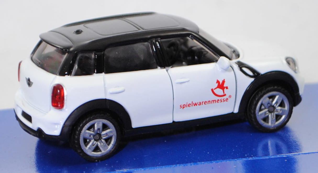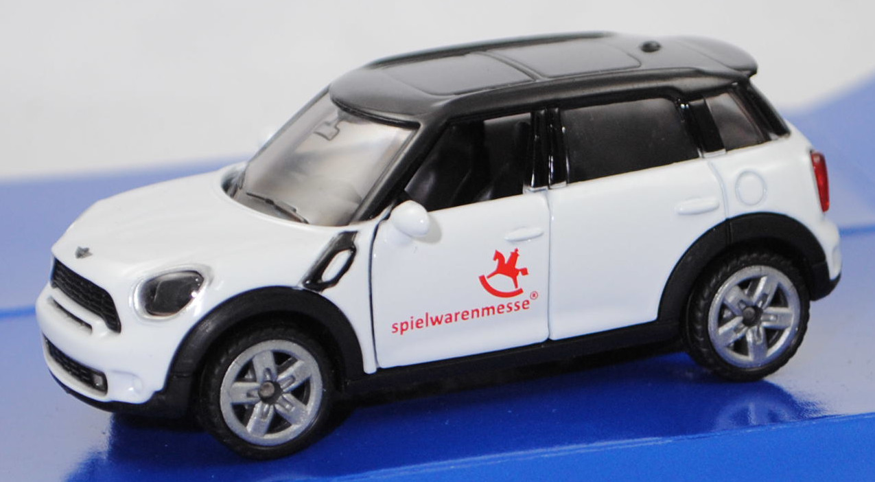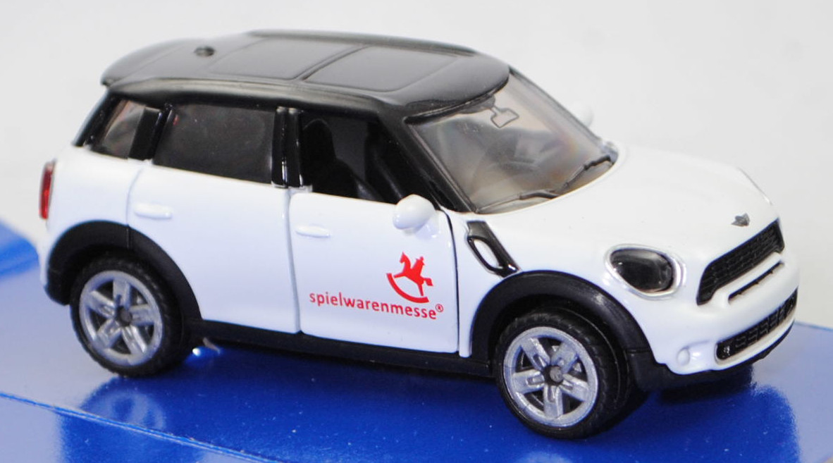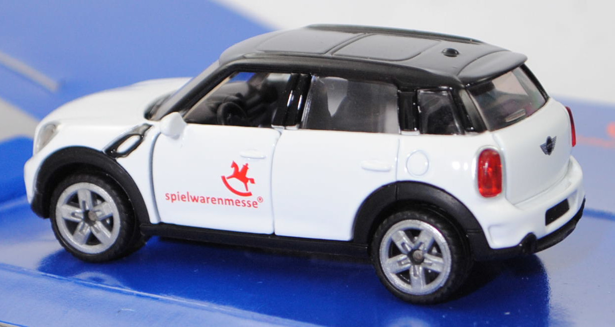 00401 Mini Cooper S Countryman (1. Generation, Baureihe Coutryman, interne Baureihenbezeichnung R60, fünftüriger SUV (Sport Utility Vehicle) mit 5 Sitzplätzen, Vorfacelift, Hexagon-Kühlergrill mit Lüftungsgitter in 4 Reihen und 7 Felder pro Reihe, Frontschürze mit überstehendem Bügel und integriertem Lüftungsgitter, Ausstattungslinie Cooper S: Frontklappe schwarz mit Grill in Wabenoptik + Hutze zwischen Stoßfänger und Kühlergrill integriert, Rahmen in Wagenfarbe, Gitter schwarz + seitliche Lufteinlässe dark anthrazit mit Cooper S Logo + Zusatzblinkleuchten in Seitenwand vorne weiß + Außenspiegelkappen in Wagenfarbe + Außenspiegel elektrisch verstellbar + Edelstahl Fahrerfußstütze und Pedalerie + Interieuroberfläche und Türellipse in dark anthrazit + Schalthebelknauf in Kunststoff mit Chromring und 6-Gang-Anzeige + 3-Speichen Sport-Lederlenkrad + Sportsitze für Fahrer und Beifahrer + Polsterung Stoff Diagonal Track Carbon Black + Heckspoiler in Dachfarbe lackiert + Nebelschlussleuchte in Heckleuchteneinheit links und Rückfahrleuchte in Heckleuchteneinheit rechts integriert + 17'' Leichtmetallräder 5-Star Double Spoke 7 J x 17 mit Bereifung 205/55 inkl. Radschraubensicherung + 2-Rohr-Auspuffanlage mit Zwischen- und einem Nachschalldämpfer, Auspuffendrohre links und rechts mit Chromblenden, Sonderausstattung gegen Mehrpreis: Dach und Außenspiegelkappen in schwarz (Code 383) + Glas-Schiebe-Hebedach, elektrisch mit Aufstellfunktion für vorn und hinten sowie manuellen Sonnenschutzrollos. Komfortöffnen über Funkfernbedienungsschlüssel und Tipp-Funktion (Code 403), 6-Gang-Schaltgetriebe, Frontantrieb, Motor: Mini Typ N18 B16 A wassergekühlter Vierzylinder-Reihen-Twin-Scroll-Turbo-Viertakt-Otto mit Direkteinspritzung und zwei obenliegende Nockenwellen (DOHC = Double Overhead Camshaft) sowie 4 Ventile pro Zylinder und Ladeluftkühler sowie 1598 cm³ und 184 PS, Radstand 2595 mm, Länge 4110 mm, Modell 2010-2014), Karosserie reinweiß, Dach und Dachsäulen schwarz, innen schwarzgrau, Sitze schwarzgrau (vgl. Sportsitze beim Original), Lenkrad schwarzgrau, Druck Logo Spielwarenmesse und spielwarenmesse® in dunkel-verkehrsrot auf den vorderen Türen, B47 offen silber (MINI Leichtmetallräder 5-Star Double Spoke Größe 7 J x 17 ET 50 mit Lochkreis 5 x 120 incl. Radschraubensicherung und Reifen 205/55 R 17 91V), SIKU SUPER, ca. 1:55, Werbeschachtel (Limited Edition zur 65. Spielwarenmesse 29.01. - 03.02.2014 in Nürnberg / Sondermodell 2014) (Vitrinenmodell, Schachtel mit Lagerspuren) (EAN 4006874014545)