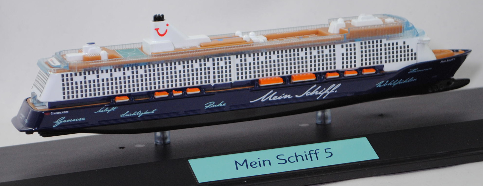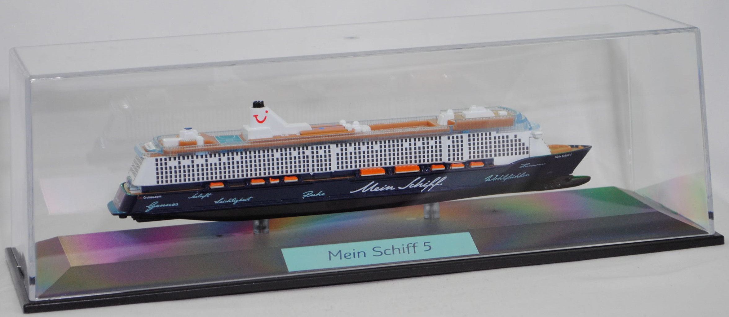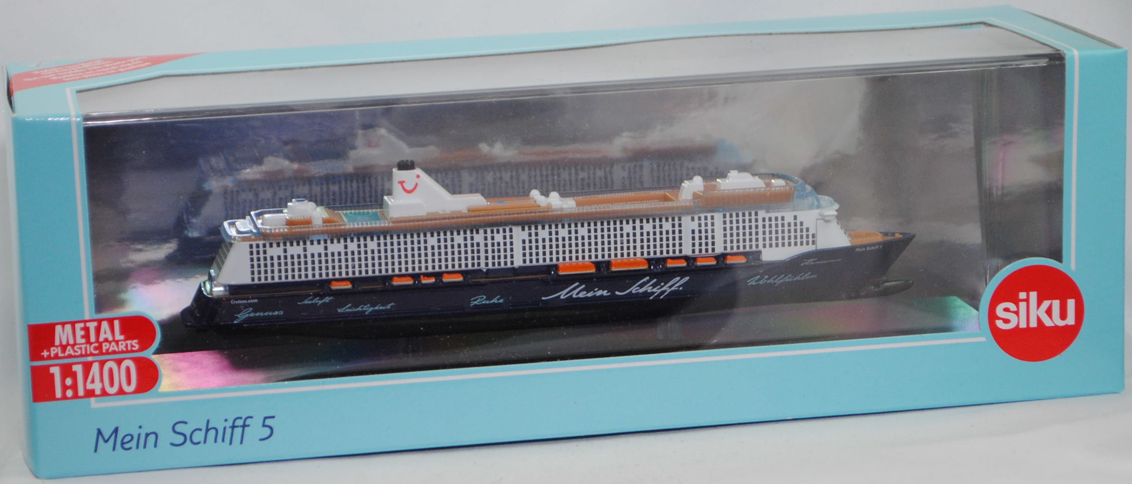 00402 Kreuzfahrtschiff Mein Schiff 5 (Blue-Motion-Klasse, Baunummer NB-1389, Hersteller: Meyer Turku Oy Werft in Turku Finnland, Besitzer: TUI Cruises GmbH Hamburg, Rufzeichen 9HA3858, Registriernummer IMO 9753193, Heimathafen Valletta, zugelassene Passagierzahl 2534 in 1267 Kabinen und 1026 Besatzungsmitglieder, Maschine: dieselelektrisch mit Generatorleistung 61472 PS (2 Wärtsilä 12V46 Dieselmotoren mit je 17136 PS und 2 Wärtsilä 8L46F Dieselmotoren mit je 13600 PS), 2 Festpropeller, Länge über alles Lüa 295,261m, Indienststellung 24.06.2016), reinweiß/kobaltblau/schwarz, Druck Mein Schiff 5 Faszination Lebenslust Mein Schiff. Sonnenschein Urlaub Delphine / TUICruises.com auf der linken und TUICruises.com / Genuss Seeluft Leichtigkeit Ruhe Mein Schiff. Wohlfühlen Harmonie Mein Schiff 5 auf der rechten Seite jeweils in reinweiß/hell-lichtblau/verkehrsrot, Druck Mein Schiff 5 / VALLETTA / Ahoi in reinweiß/hell-lichtblau auf dem Heck, Druck TUICruises.com in verkehrsrot/schwarz hinten auf dem Oberdeck, Oberdeck hell-braunbeige/reinweiß/himmelblau/hell-verkehrsblau/türkisblau bedruckt, Schornstein schwarz/reinweiß mit Druck TUI-Logo in verkehrsrot auf den Seiten, Deck über Bug hell-braunbeige, Rettungsboote oben hellrotorange, Fenster graphitgrau, Bpr. mit Adresse, Druck Chargennummer in reinweiß auf dem Rumpf, Aufbau mit 6 Decks, SIKU SUPER 1:1400, 1:1413, Modell in PC-Box, L17mpK Werbeschachtel (Limited Edition) (EAN 4006874817245)