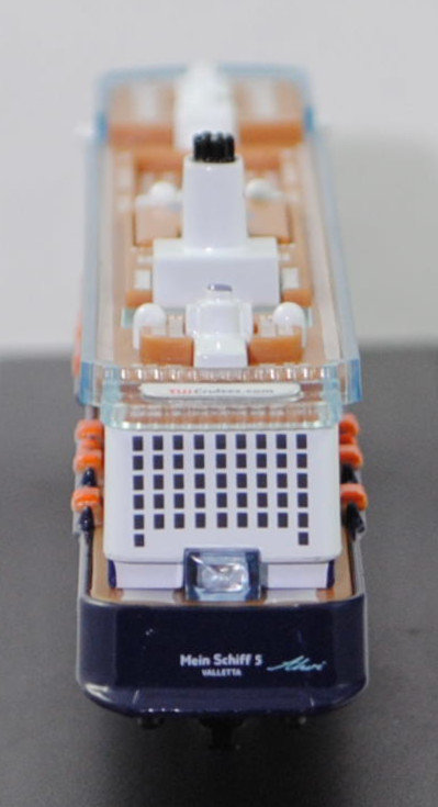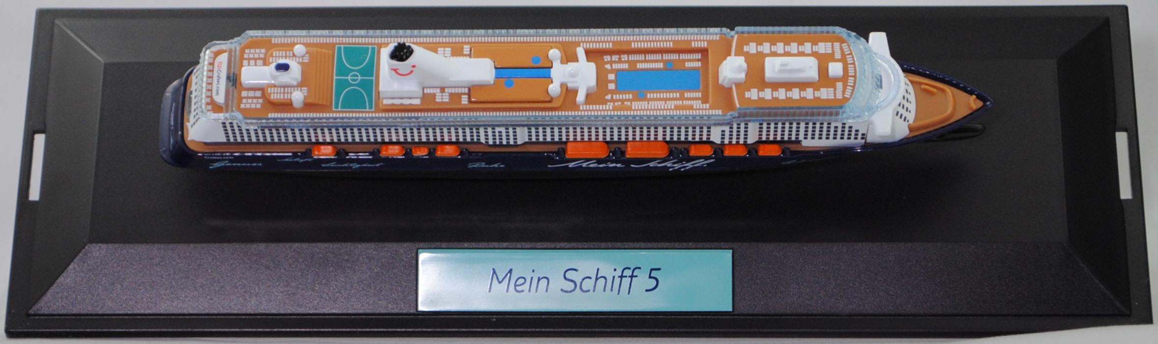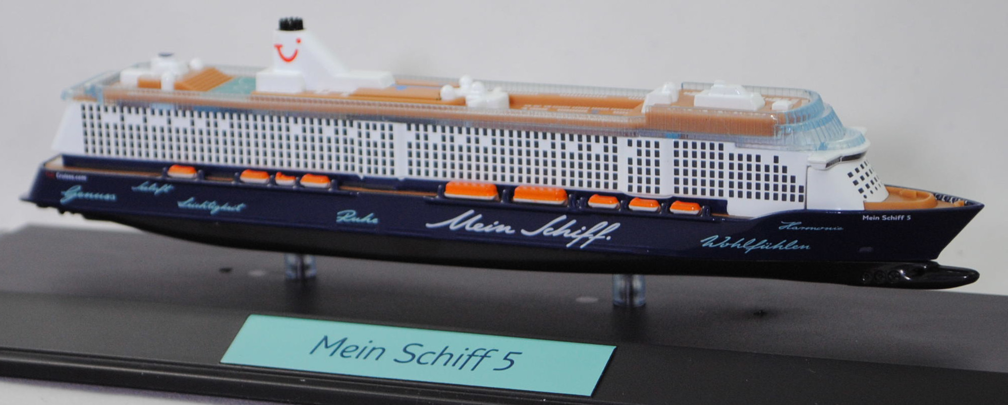 00402 Kreuzfahrtschiff Mein Schiff 5 (Blue-Motion-Klasse, Baunummer NB-1389, Hersteller: Meyer Turku Oy Werft in Turku Finnland, Besitzer: TUI Cruises GmbH Hamburg, Rufzeichen 9HA3858, Registriernummer IMO 9753193, Heimathafen Valletta, zugelassene Passagierzahl 2534 in 1267 Kabinen und 1026 Besatzungsmitglieder, Maschine: dieselelektrisch mit Generatorleistung 61472 PS (2 Wärtsilä 12V46 Dieselmotoren mit je 17136 PS und 2 Wärtsilä 8L46F Dieselmotoren mit je 13600 PS), 2 Festpropeller, Länge über alles Lüa 295,261m, Indienststellung 24.06.2016), reinweiß/kobaltblau/schwarz, Druck Mein Schiff 5 Faszination Lebenslust Mein Schiff. Sonnenschein Urlaub Delphine / TUICruises.com auf der linken und TUICruises.com / Genuss Seeluft Leichtigkeit Ruhe Mein Schiff. Wohlfühlen Harmonie Mein Schiff 5 auf der rechten Seite jeweils in reinweiß/hell-lichtblau/verkehrsrot, Druck Mein Schiff 5 / VALLETTA / Ahoi in reinweiß/hell-lichtblau auf dem Heck, Druck TUICruises.com in verkehrsrot/schwarz hinten auf dem Oberdeck, Oberdeck hell-braunbeige/reinweiß/himmelblau/hell-verkehrsblau/türkisblau bedruckt, Schornstein schwarz/reinweiß mit Druck TUI-Logo in verkehrsrot auf den Seiten, Deck über Bug hell-braunbeige, Rettungsboote oben hellrotorange, Fenster graphitgrau, Bpr. mit Adresse, Druck Chargennummer in reinweiß auf dem Rumpf, Aufbau mit 6 Decks, SIKU SUPER 1:1400, 1:1413, Modell in PC-Box, L17mpK Werbeschachtel (Limited Edition) (EAN 4006874817245)