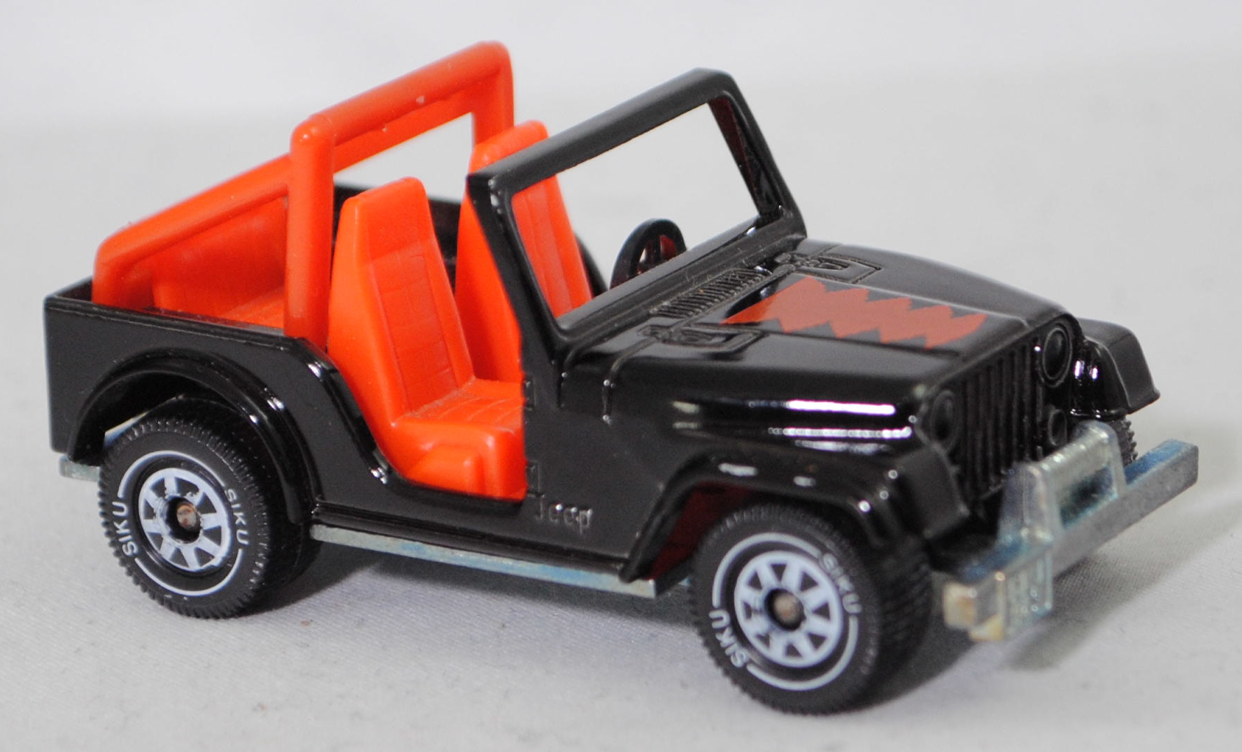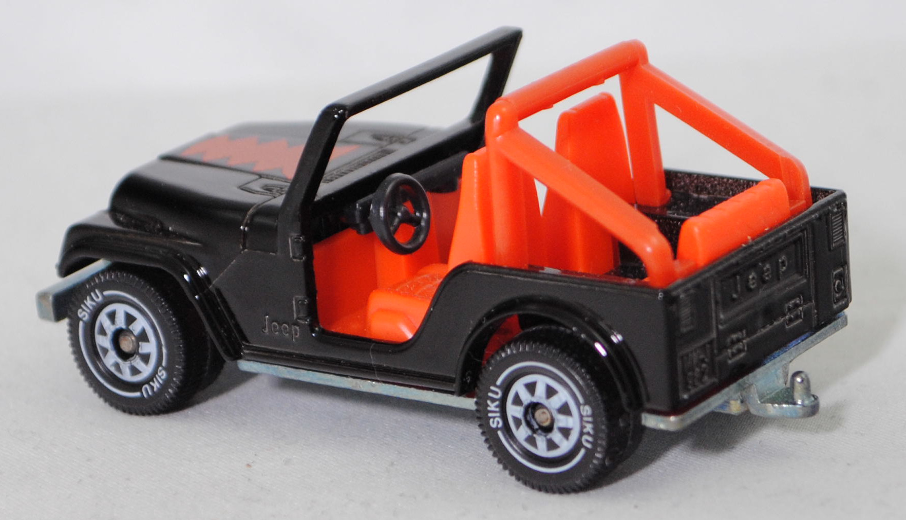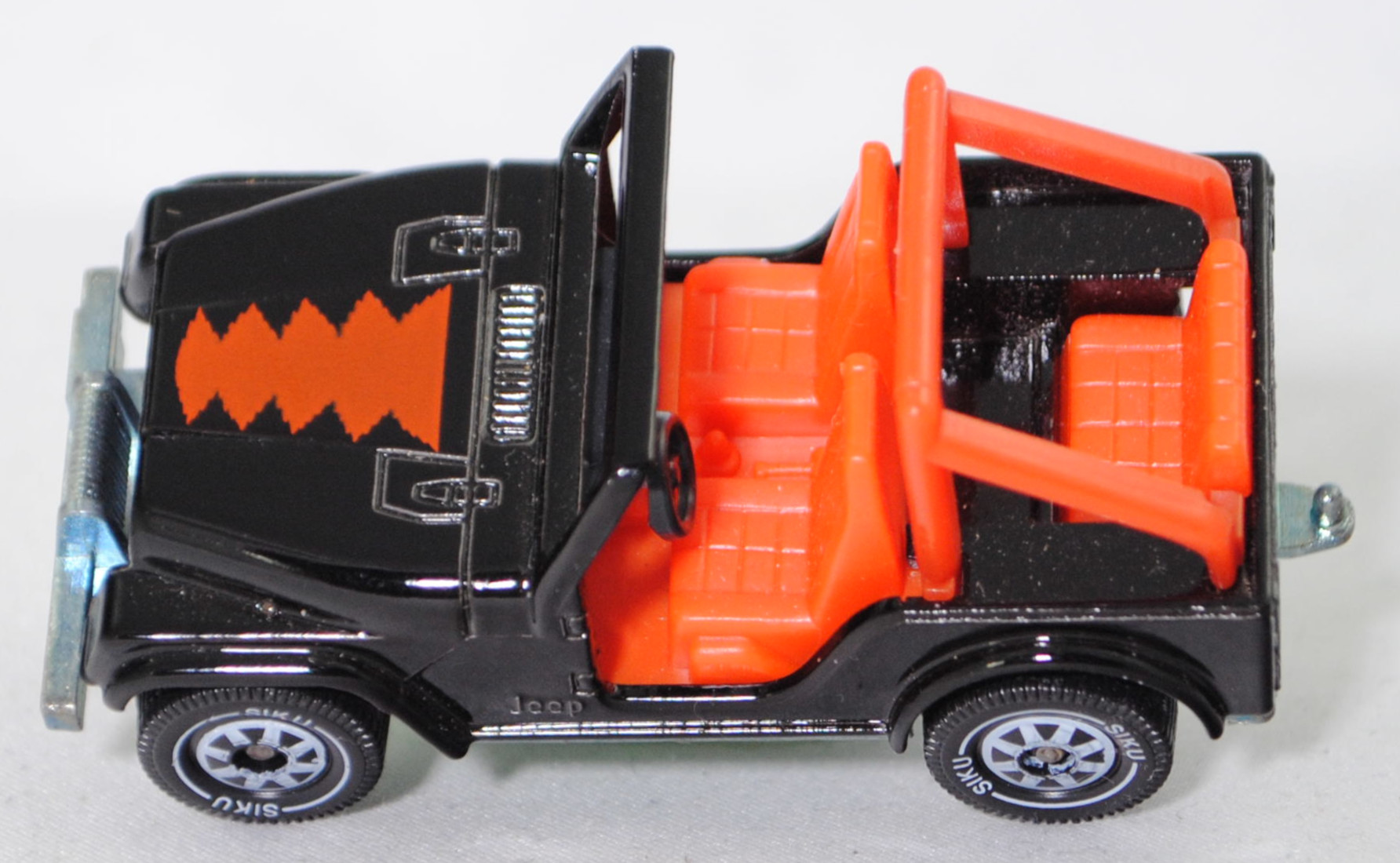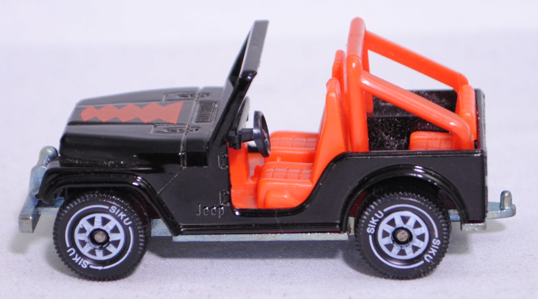00601 GB Jeep CJ-5 2.5L (Modell 1979-1983), schwarz, Überrollbügel rotorange, Druck Emblem in rotorange (heller) auf der Motorhaube, B5, SIKU SUPER, 1:55, m