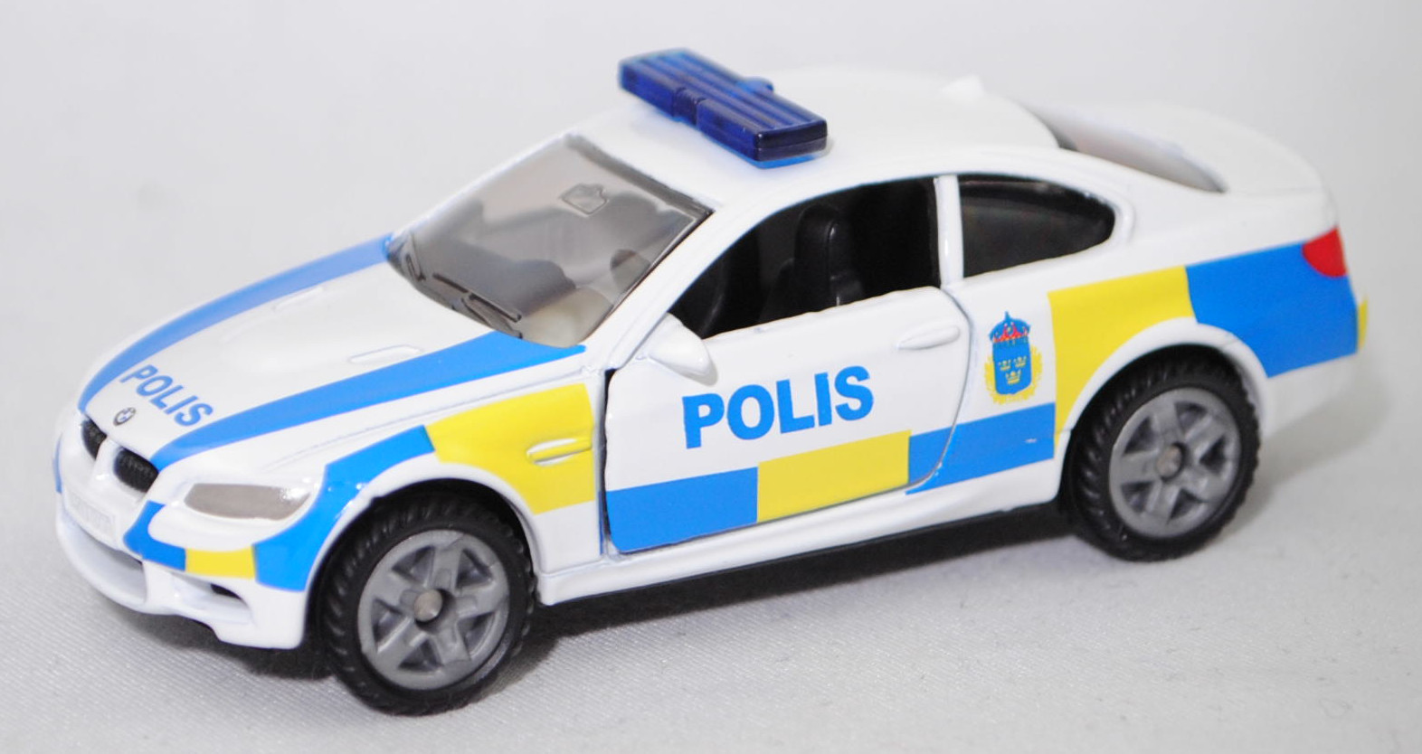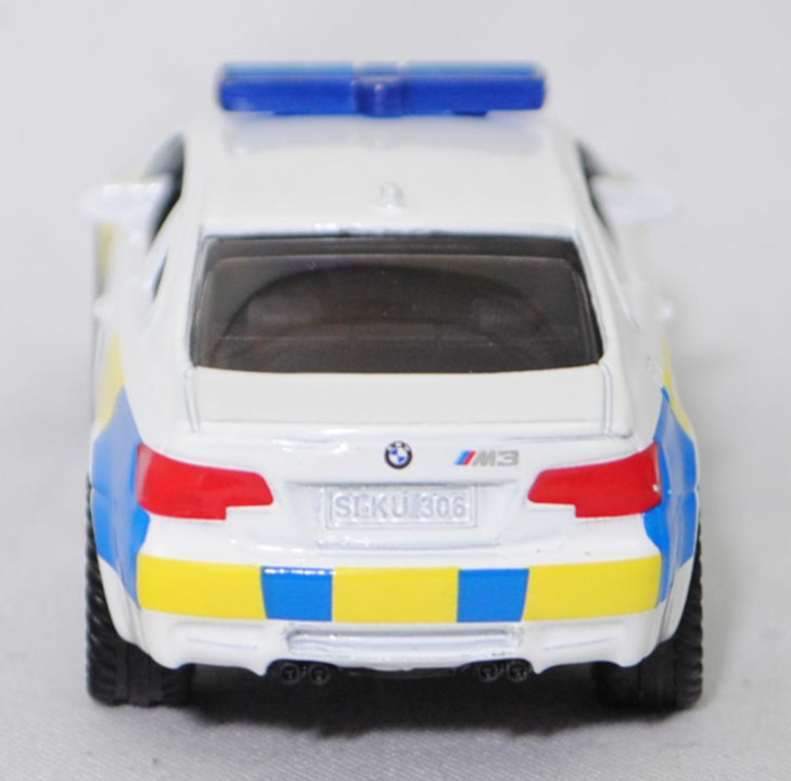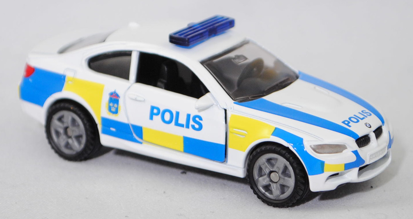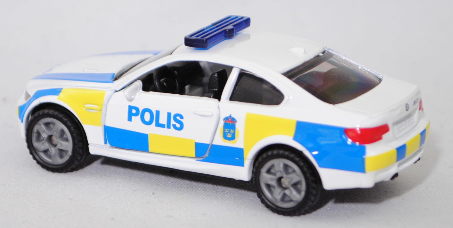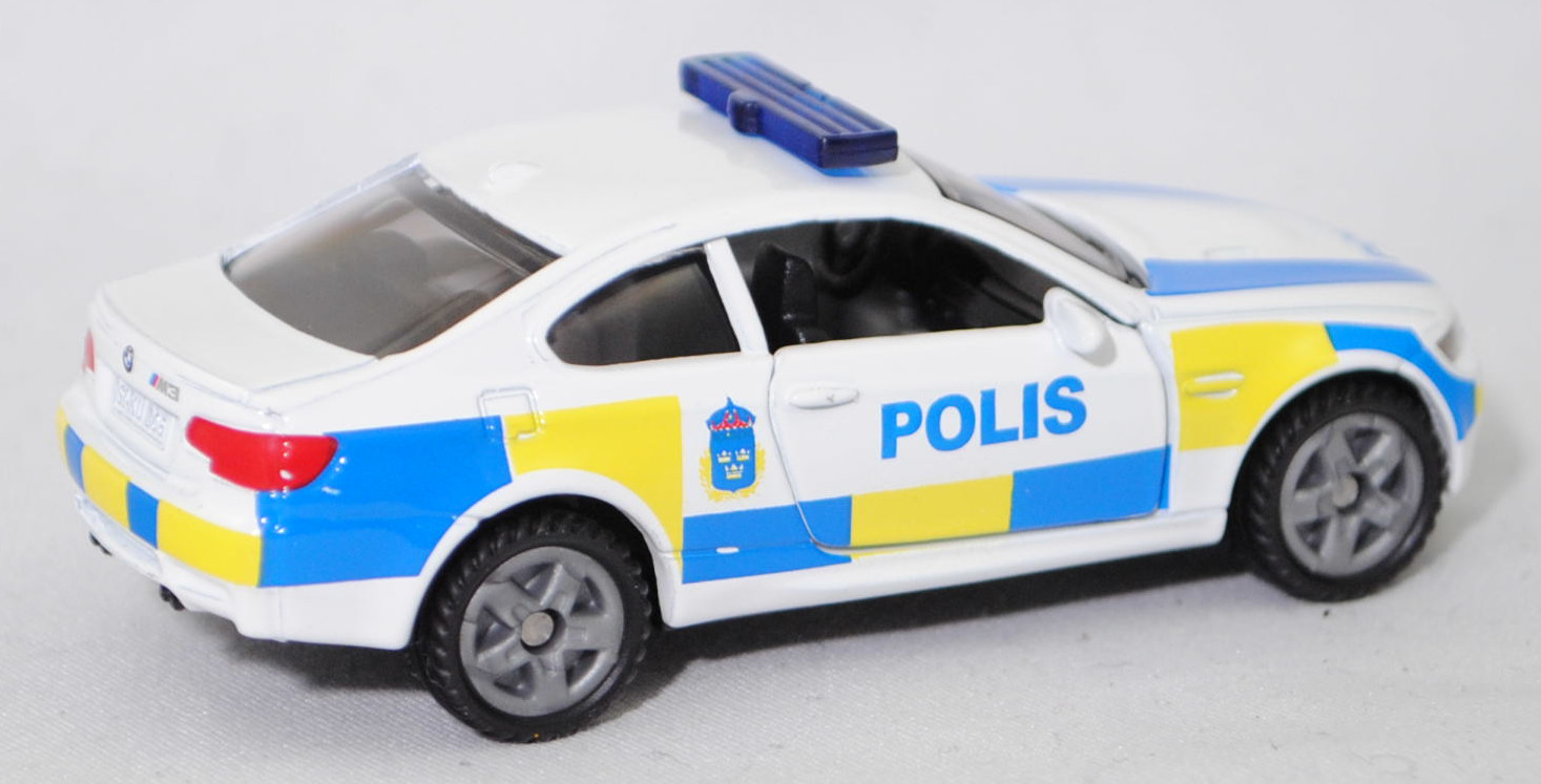 03000 S BMW M3 Coupé (4. Generation M3, Baureihe M3 Coupé, interne Baureihenbezeichnung E92, zweitüriges Coupé mit 4 Sitzplätzen, Facelift 2010 (bei BMW LCI = Lifecycle Impulse genannt), Stoßfänger vorne um 29 mm verlängert, Verbreiterung des Seitenschwellers im unteren Bereich, Blinker hinten oben unter rotem Glas angeordnet, kleiner schmale Rückfahrscheinwerfer unten angeordnet, Ausstattungslinie M3 Coupé: Leichtbaudach aus Carbon (CFK) + Polsterung Stoff-/Lederkombination Speed mit geprägtem M Emblem in den Kopfstützen vorne + Fondsitzlehne umklappbar + Komforteinstieg zu den Fondsitzen durch Easy-Entry-Funktion für Fahrer- und Beifahrersitz + Gurtbringer vorne elektrisch + Graukeil-Frontscheibe, 6-Gang-Schaltgetriebe, Hinterradantrieb, Motor BMW Typ S65B40 wassergekühlter Achtzylinder-V-Viertakt-Otto mit Multi-Point-Einspritzung und zwei obenliegende Nockenwellen (DOHC = Double Overhead Camshaft) je Zylinderbank sowie 4 Ventile pro Zylinder und 3999 cm³ sowie 420 PS, Radstand 2761 mm, Länge 4615 mm, Modell 2010-2013) Swedish Police, reinweiß, innen schwarz, Sitze schwarz, Lenkrad schwarz, Druck POLIS in hell-verkehrsblau und Wappen der schwedischen Polizei in hell-verkehrsblau/schwefelgelb/dunkel-verkehrsrot sowie hell-verkehrsblau/schwefelgelbe Karos auf den Seiten, Druck POLIS und 2 Streifen in hell-verkehrsblau auf der Motorhaube, Druck hell-verkehrsblau/schwefelgelbe Streifen auf den Stoßfängern vorne und hinten, flache Blaulichtleiste auf dem Dach, integrierte Frontscheinwerfer silber bedruckt, integrierte Heckleuchten rot bedruckt, Druck BMW-Logo in reinweiß/schwarz/ultramarinblau auf der Motorhaube, Druck BMW-Logo in reinweiß/schwarz/ultramarinblau und M3 in silber auf dem Kofferraumdeckel, Heckstoßstange geschlossen, B47 geschlossen silbergrau (BMW Leichtmetallräder Typ Doppelspeiche 219 M vorne Größe 8,5 J x 18 ET 29 mit Lochkreis 5 x 120 (Teilenummer 3610 2284050, Farbcode reflexsilber) und Nabendeckel / Radzierkappe mit blau-weißem BMW-Logo und Chromrand (Ø 68 mm, Teilenummer 3613 6783536) sowie Mischbereifung 245/40 ZR 18 93Y bzw. hinten Größe 9,5 J x 18 ET 23 mit Lochkreis 5 x 120 (Teilenummer 3610 2284051, Farbcode reflexsilber) und Nabendeckel / Radzierkappe mit blau-weißem BMW-Logo und Chromrand (Ø 68 mm, Teilenummer 3613 6783536) sowie Mischbereifung 265/40 ZR 18 97Y), SIKU SUPER, ca. 1:58, P29f (Limited Edition / SWEDISH SPECIAL) (EAN 4006874414505)